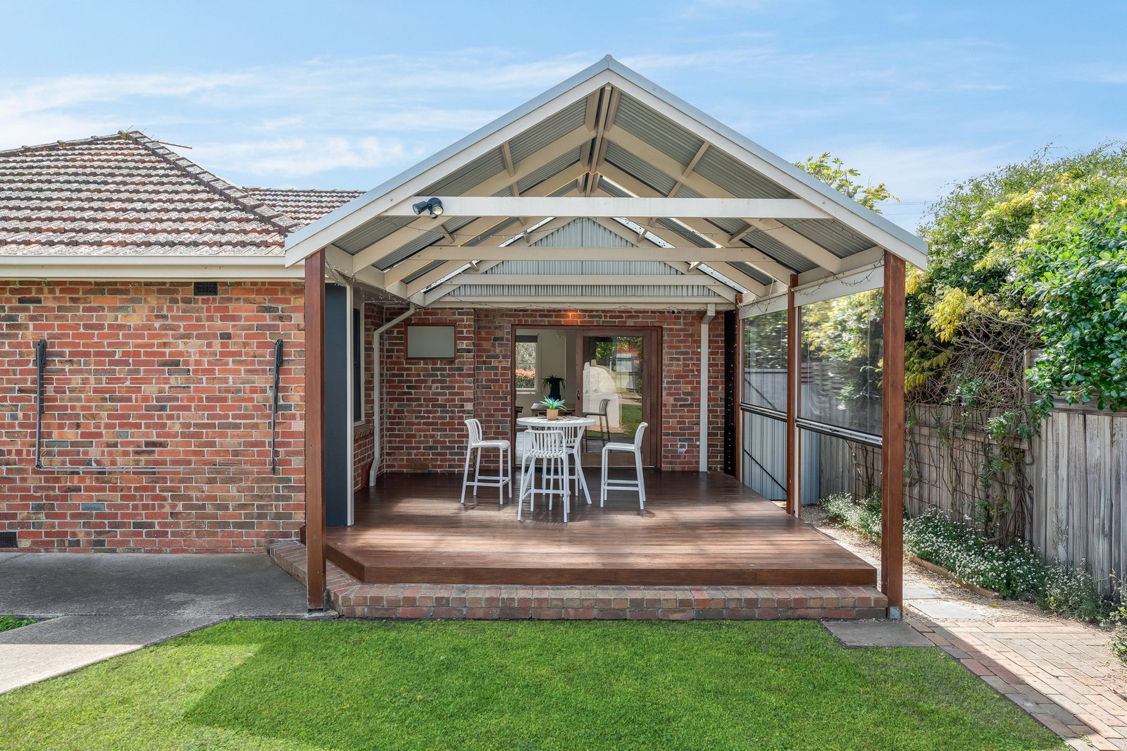 • Alfresco dining and entertainment zone with pitched roof, decking, and zip track cafe blinds.