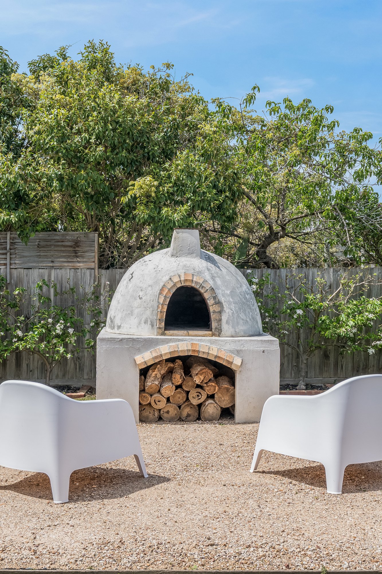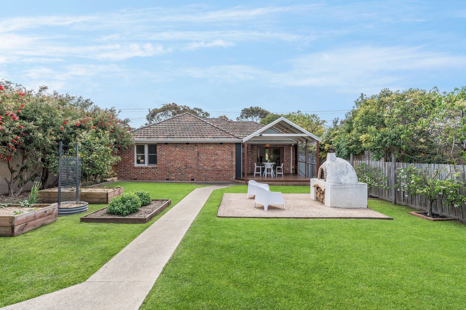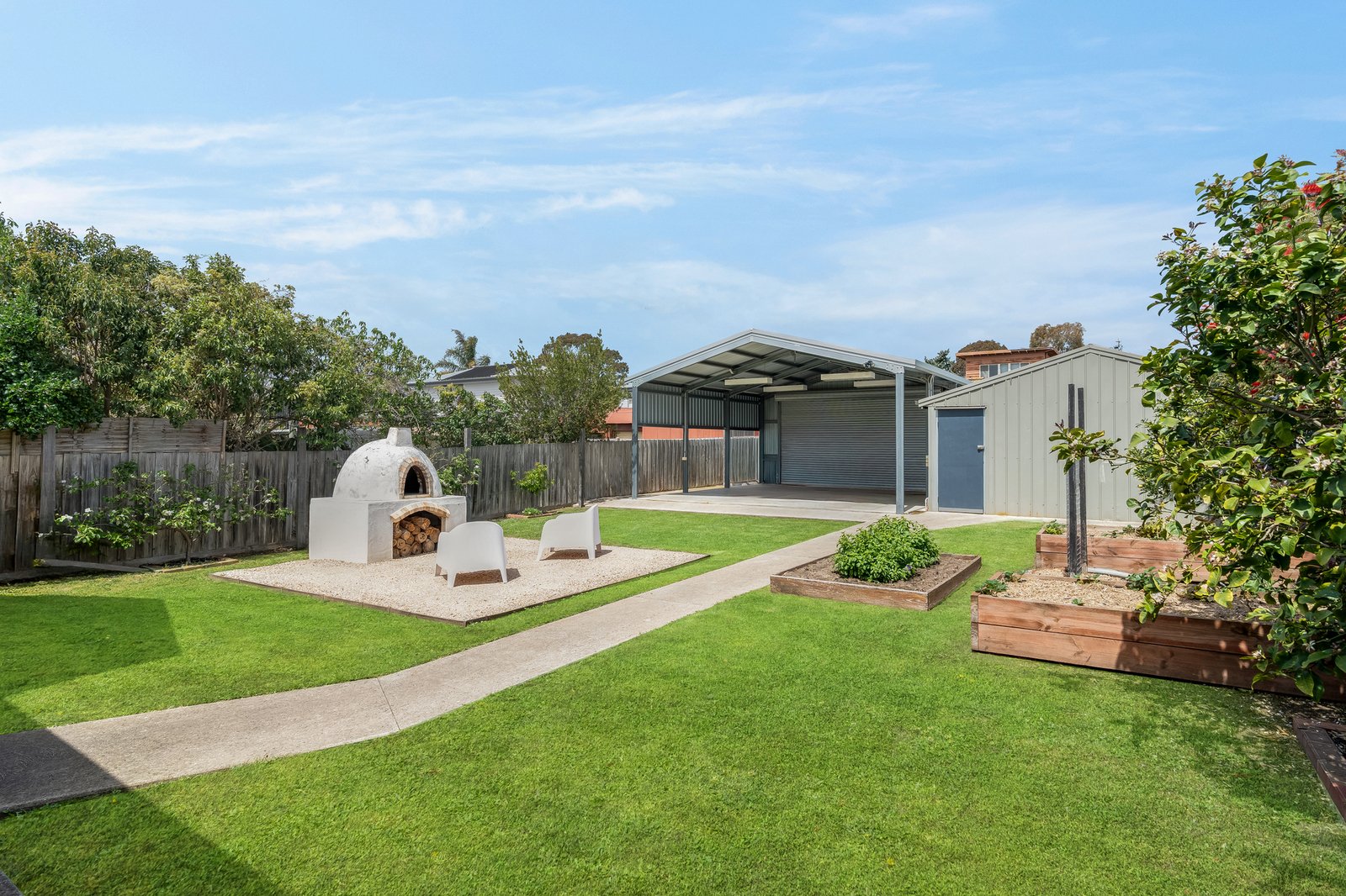 • Huge rear yard with fire pit and pizza oven zone, raised garden beds, fruit trees and attractive landscaping