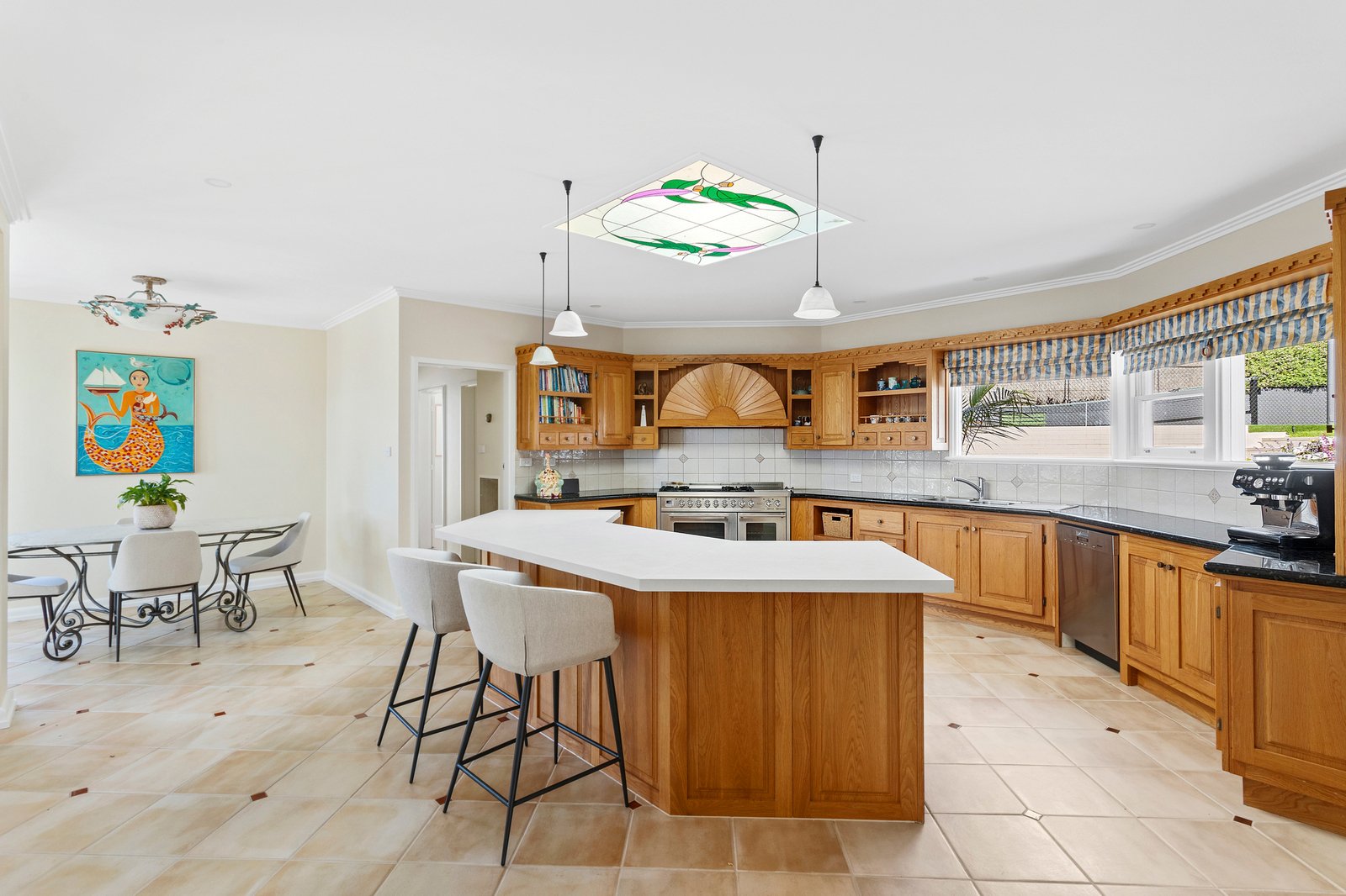 Beneath a stained-glass skylight, the solid timber kitchen is purpose-built for every occasion, with a professional double ILVE oven featuring induction and teppanyaki functions, and a concealed half butler’s pantry, all linking seamlessly to multiple outdoor dining and entertaining zones, calibrated for gathering, celebrating and living large.