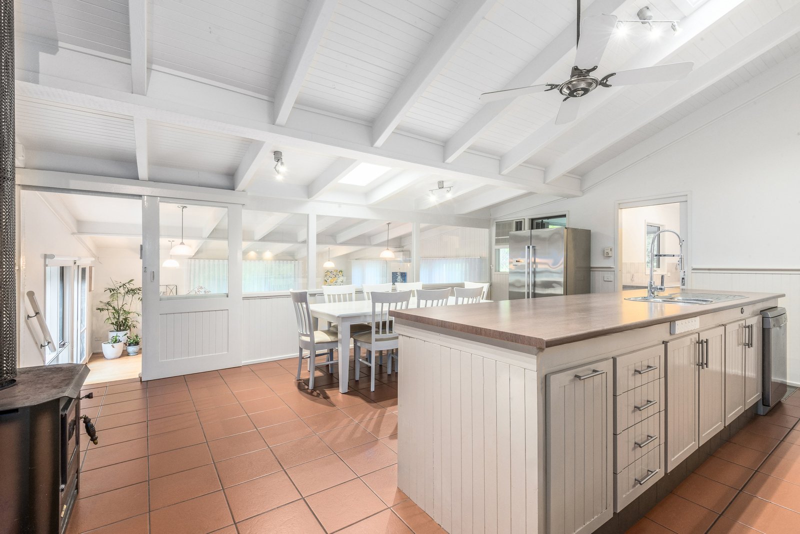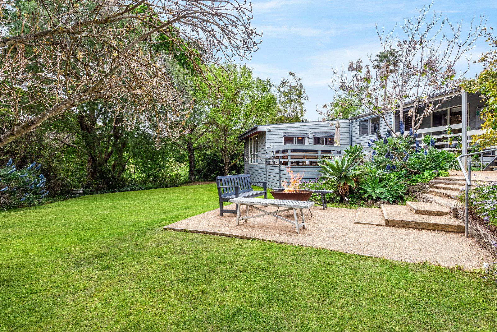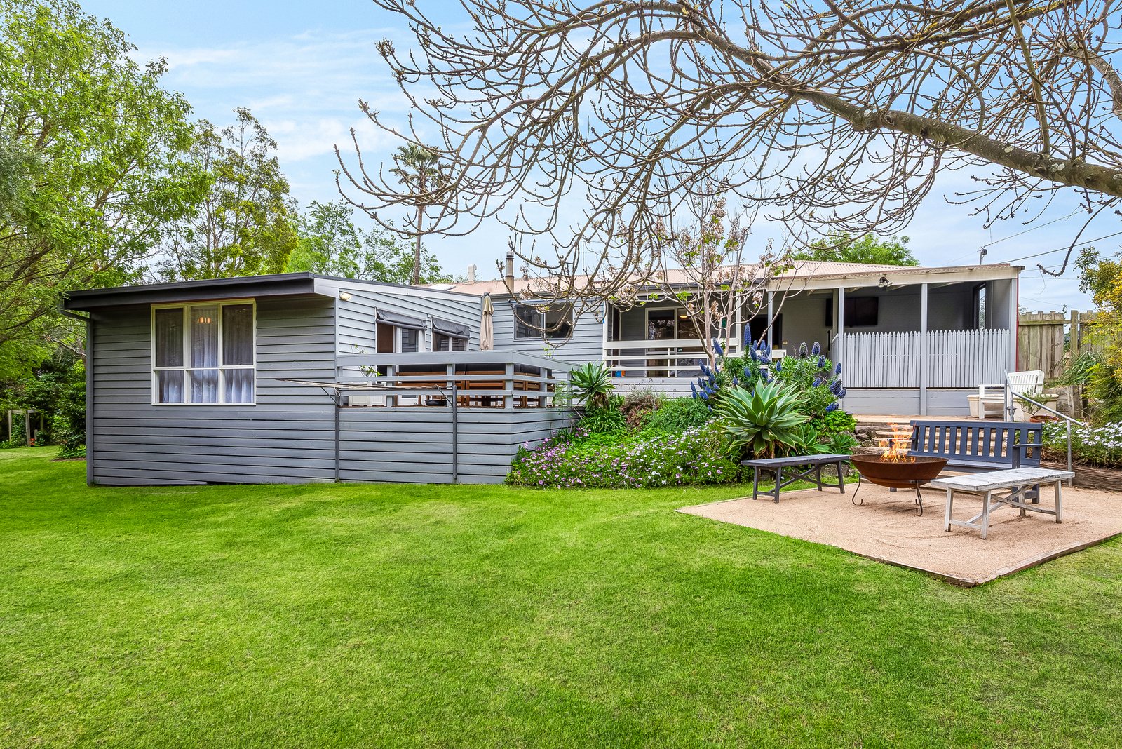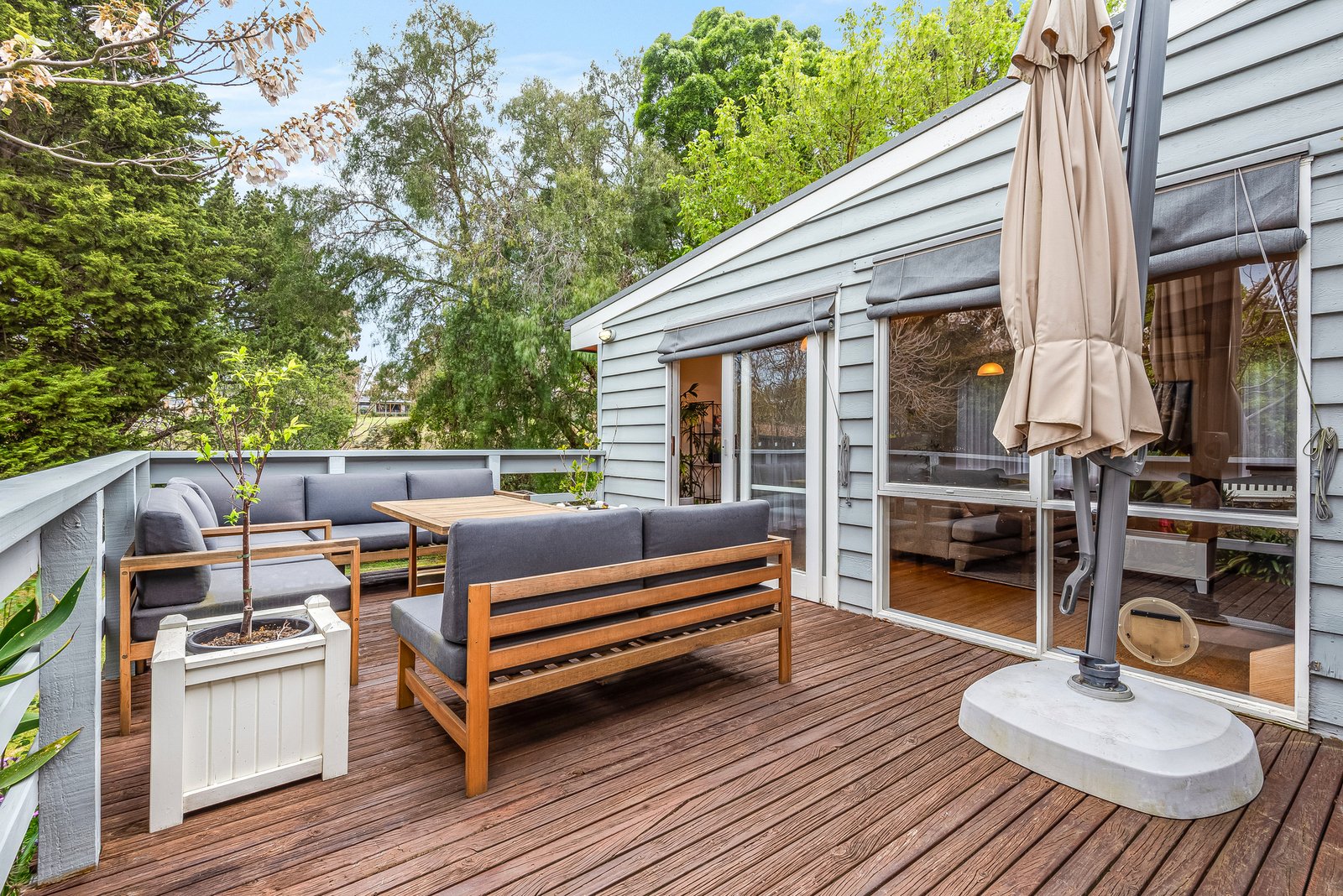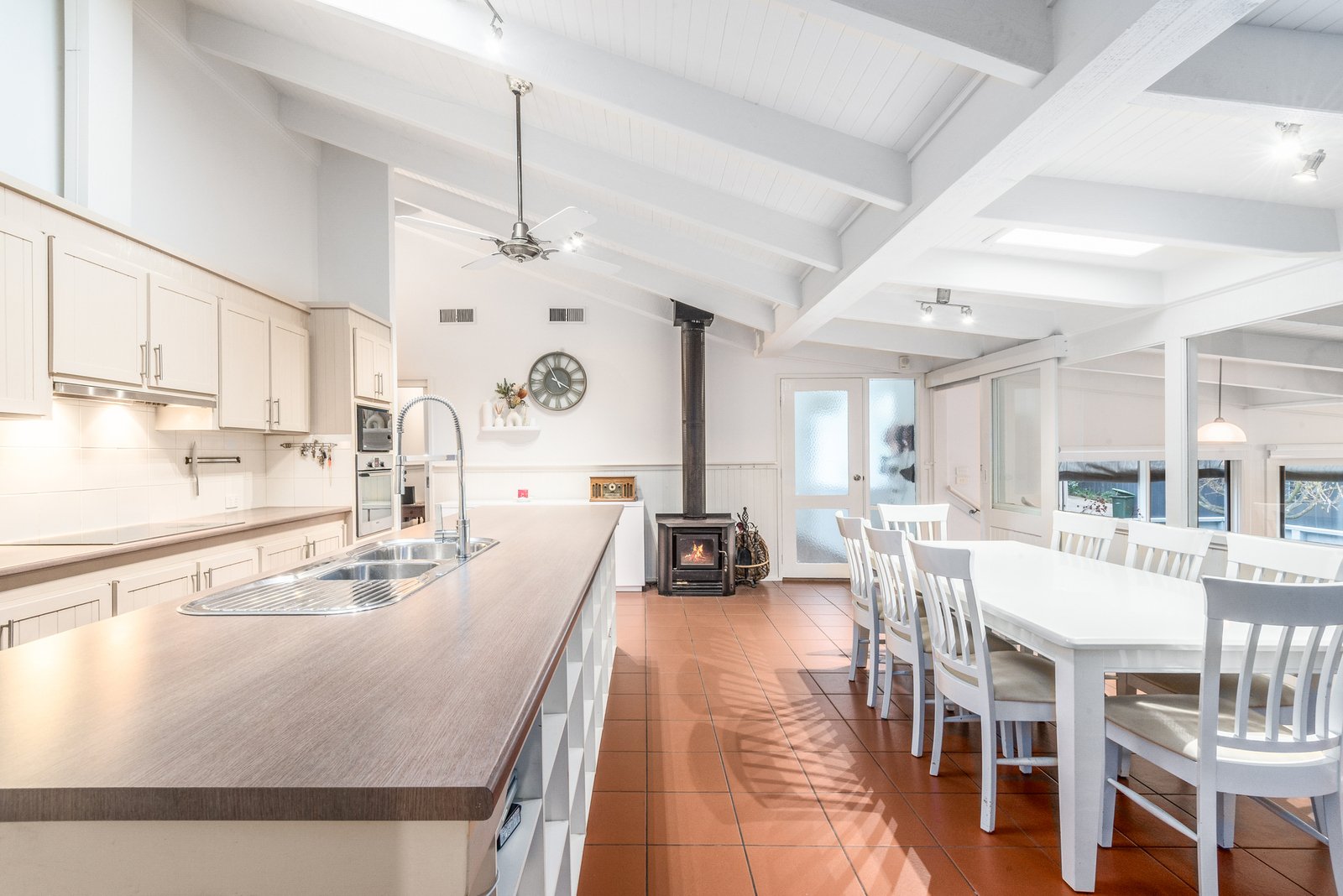 Nestled amongst established trees, the home enjoys a private setting. A wrap-around verandah greets you on arrival, introducing the classic style of the home. From the entry, double doors open up to a formal lounge, featuring timber-lined vaulted ceilings and exposed beams, providing an ambient space to relax, with a picturesque garden outlook. At the heart of the home, the open plan kitchen and dining area features a woodfire heater, creating a cosy and welcoming atmosphere, the split-level design creating an eye-catching connection with the rear living area. The well-appointed kitchen features classic shaker-style cabinetry, quality appliances including 600mm Bosch oven, induction cooktop, dishwasher, ample bench space and generous storage. The rear living room features polished timber floors, and glass sliders connection to the outdoor deck, completing a well-designed indoor-outdoor entertaining zone.