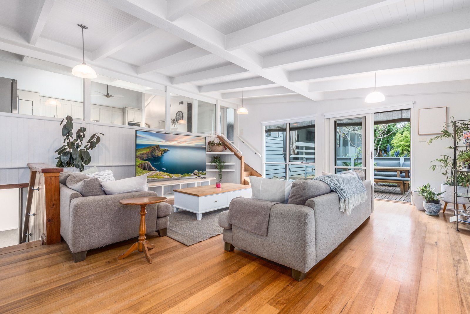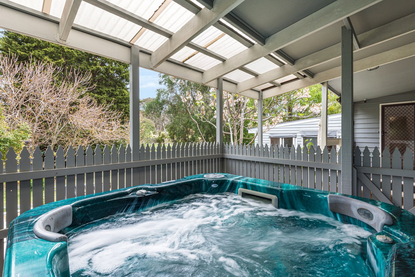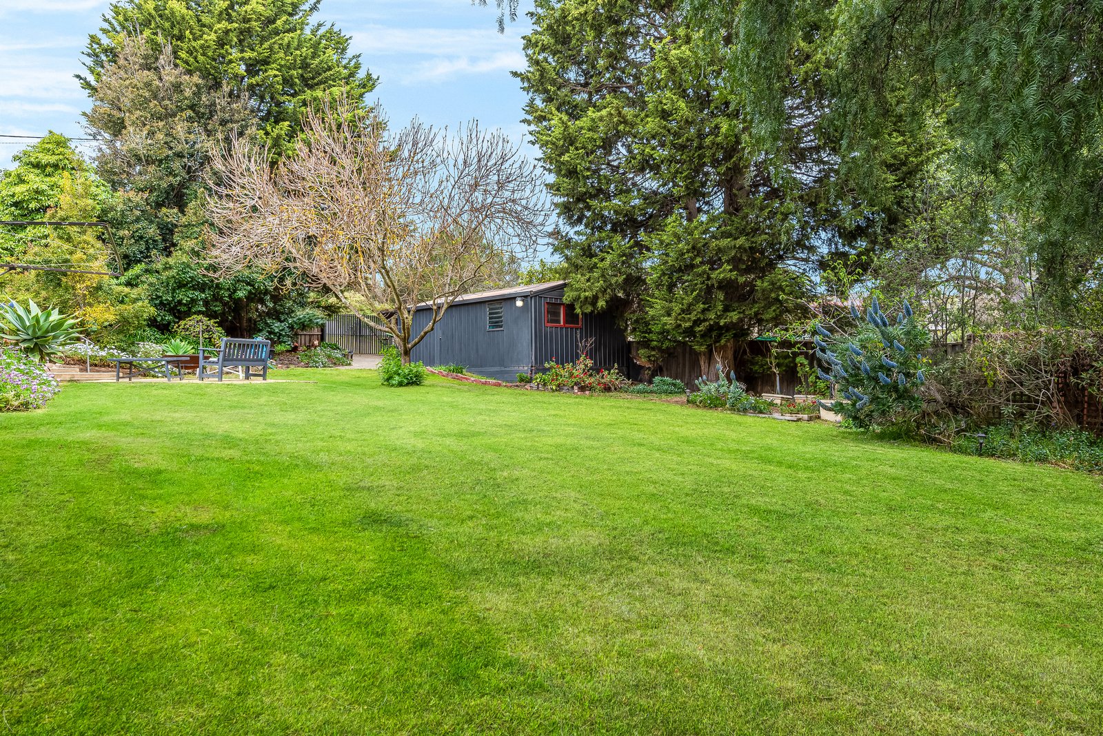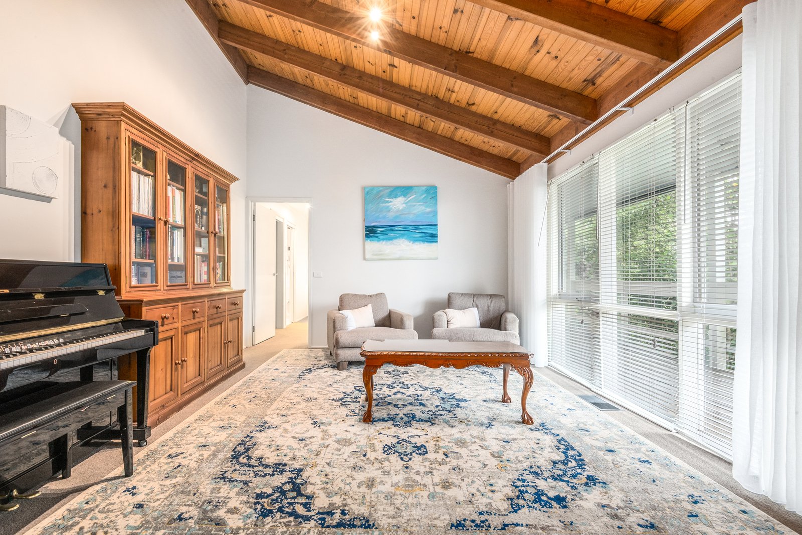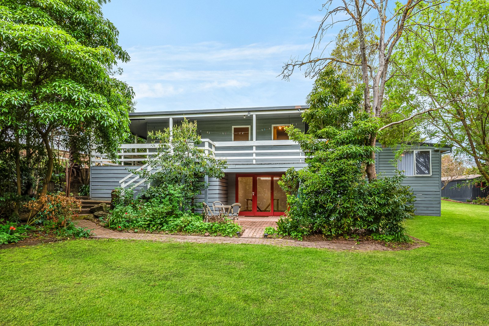 Nestled amongst established trees, the home enjoys a private setting. A wrap-around verandah greets you on arrival, introducing the classic style of the home. From the entry, double doors open up to a formal lounge, featuring timber-lined vaulted ceilings and exposed beams, providing an ambient space to relax, with a picturesque garden outlook. At the heart of the home, the open plan kitchen and dining area features a woodfire heater, creating a cosy and welcoming atmosphere, the split-level design creating an eye-catching connection with the rear living area. The well-appointed kitchen features classic shaker-style cabinetry, quality appliances including 600mm Bosch oven, induction cooktop, dishwasher, ample bench space and generous storage. The rear living room features polished timber floors, and glass sliders connection to the outdoor deck, completing a well-designed indoor-outdoor entertaining zone.