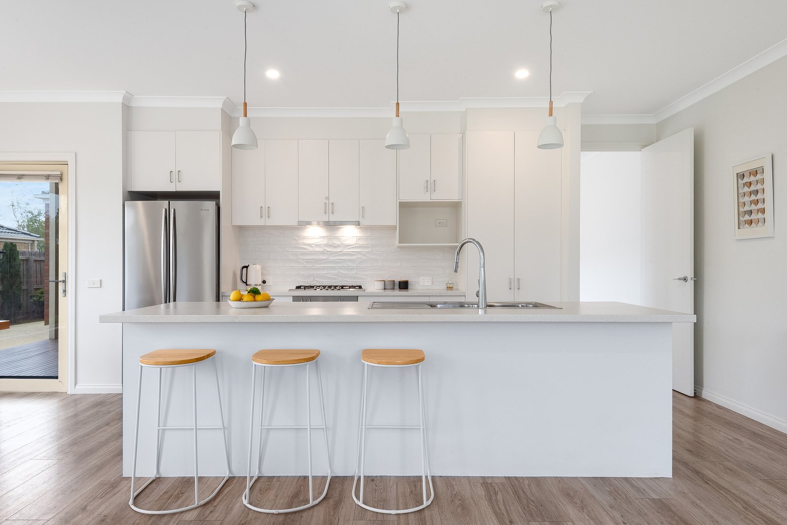 A formal lounge at the heart of the home offers a light-filled spaced to retreat, with French door access to the alfresco. The rear of the home transitions to a spacious open plan kitchen, dining and living area, with a picturesque garden outlook and an effortless connection to the outdoors. The elegant kitchen features, quality appliances including 600mm oven, gas cooktop, dishwasher, contemporary pendant lighting, ample bench space and generous storage. Positioned to overlook the dining space, with easy access to the alfresco, the layout caters for functional everyday living and impressive entertaining.