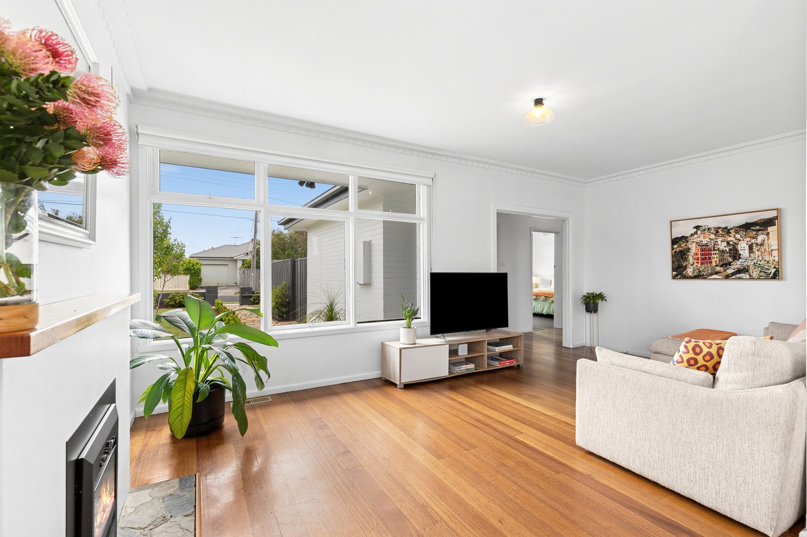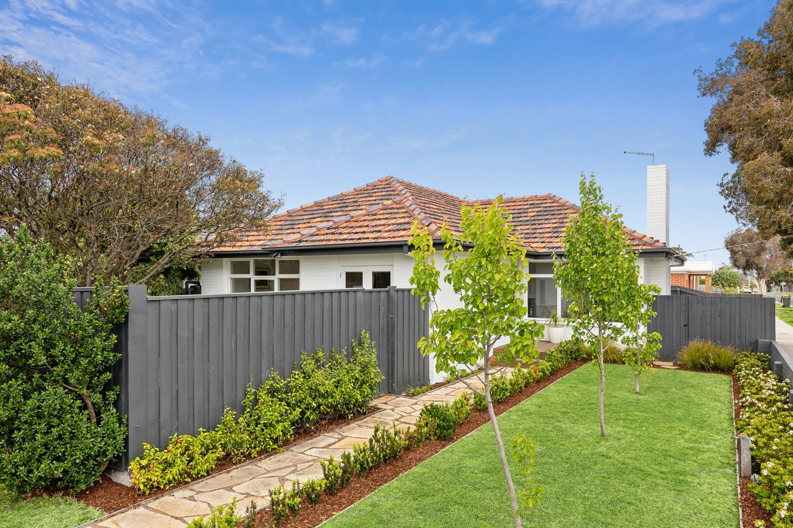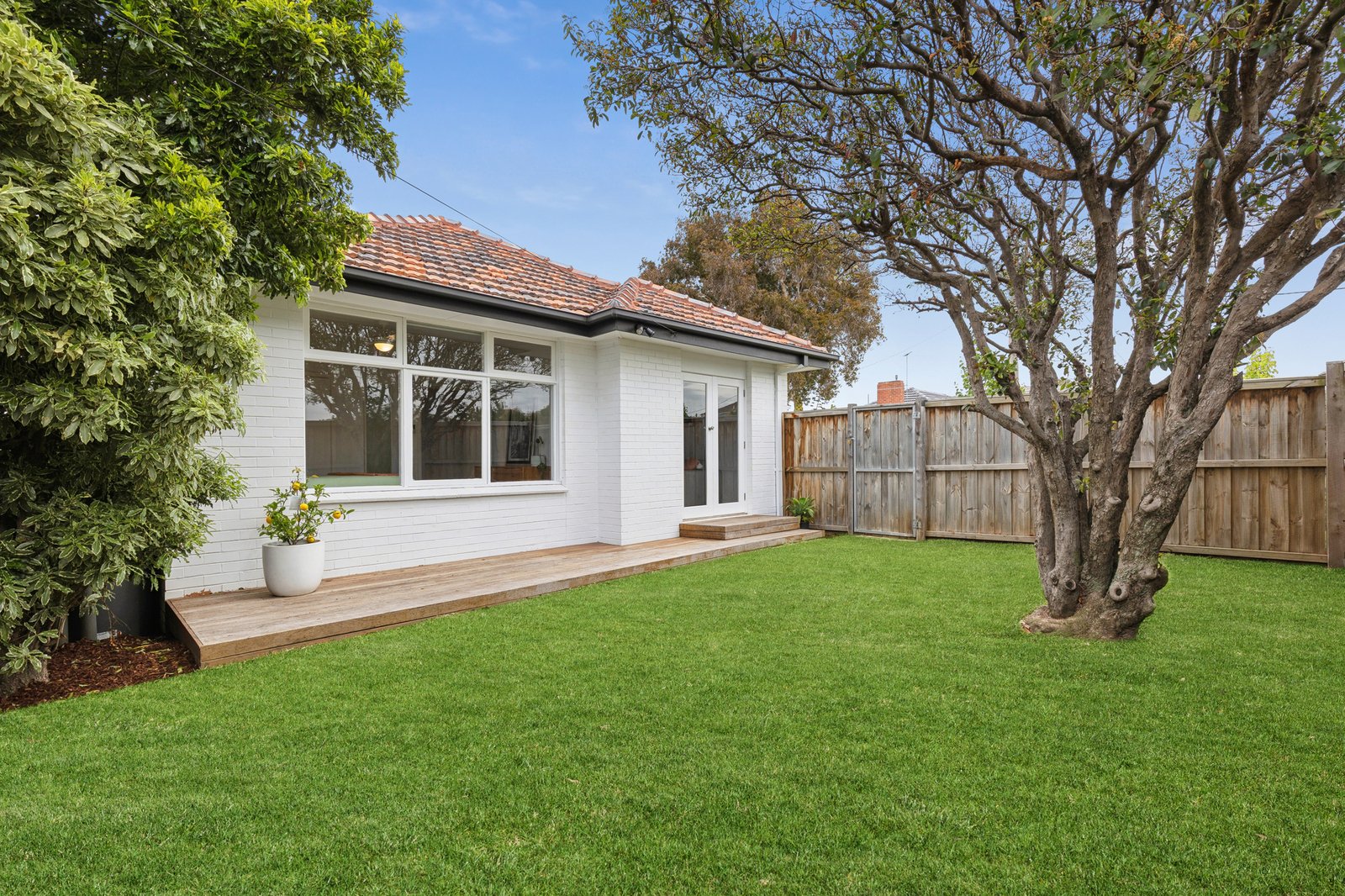 The main bedroom is spacious and bright, with built-in robes, bedroom two also includes built-in robes, and a third room offers a versatile space, suitable for a bedroom, home office, or second living, with French doors opening out to the north facing deck and front yard. The stunning bathroom is presented in contemporary finishes with bath, separate shower, modern vanity, and stylish black tapware.