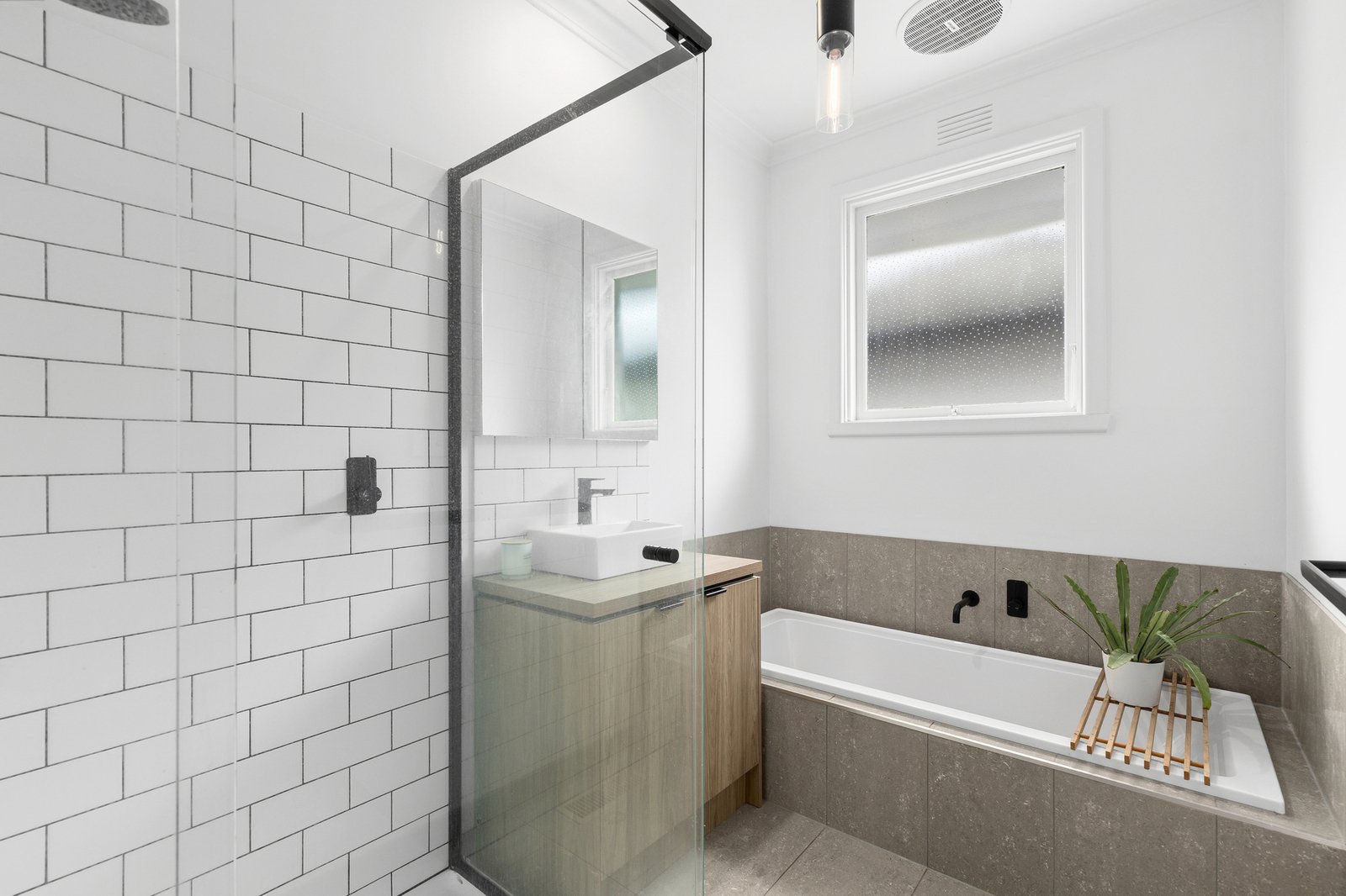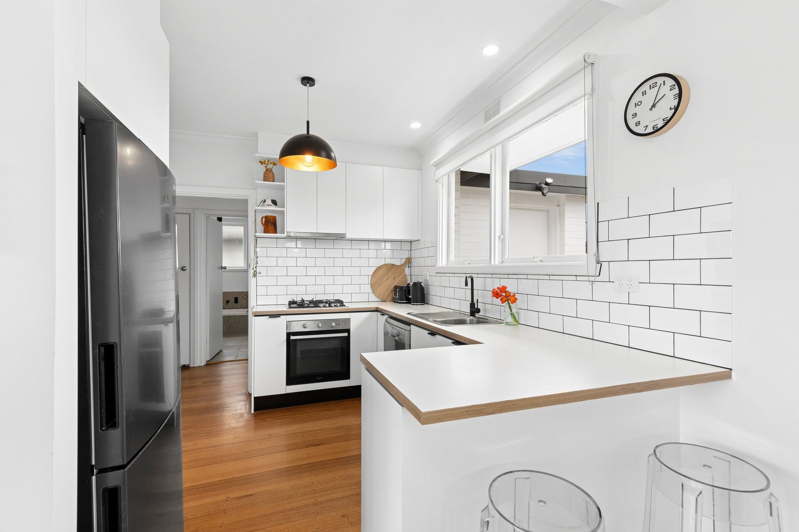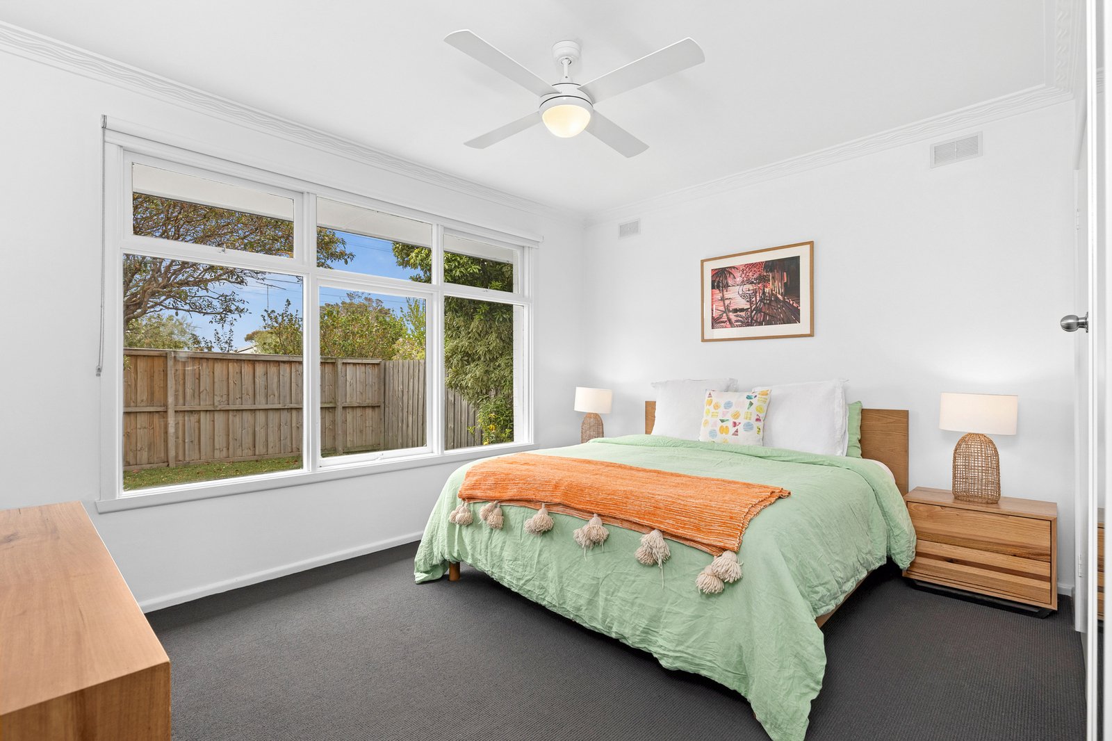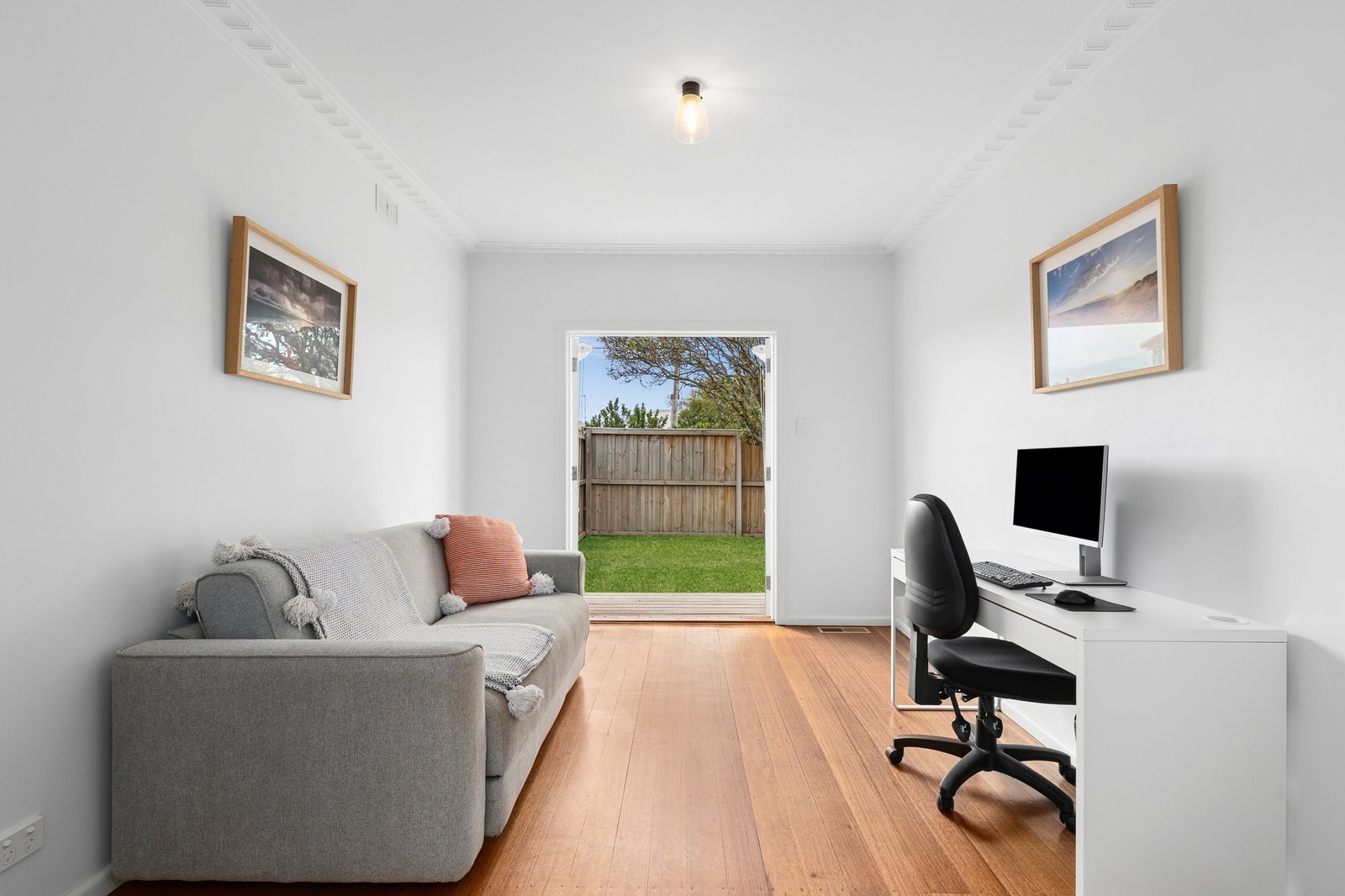 The main bedroom is spacious and bright, with built-in robes, bedroom two also includes built-in robes, and a third room offers a versatile space, suitable for a bedroom, home office, or second living, with French doors opening out to the north facing deck and front yard. The stunning bathroom is presented in contemporary finishes with bath, separate shower, modern vanity, and stylish black tapware.