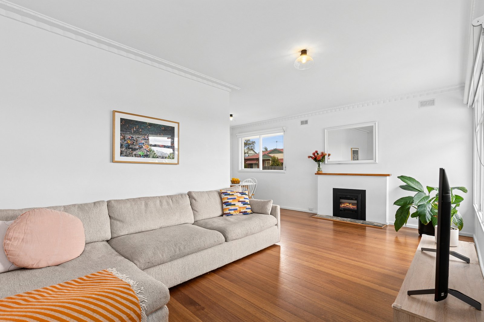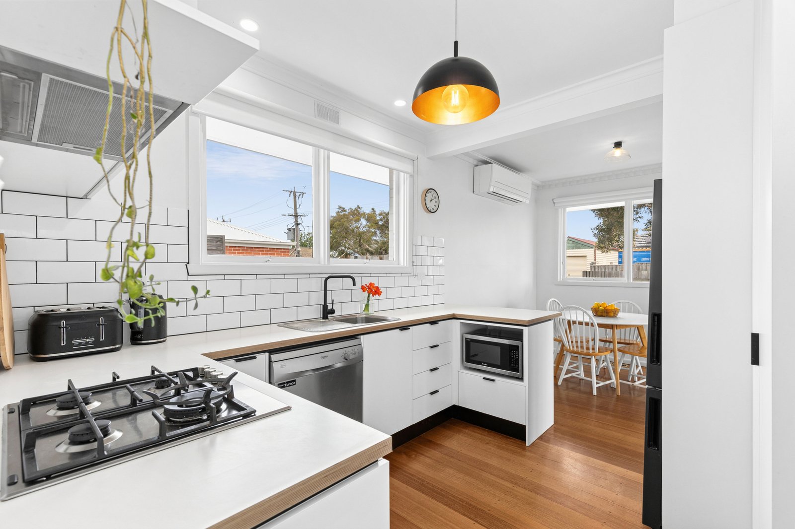 Picturesque landscaped gardens and a charming façade offer a welcoming first impression. Inside, the entry leads into a light-filled living area, showcasing polished timber floors, ornate cornice, crisp white interiors, and an original mantel with electric fireplace, creating an inviting ambience throughout. The open plan layout flows through to the dining space and a well-appointed kitchen, equipped with modern appliances including 600mm oven, gas cooktop, dishwasher, stylish modern cabinetry, and classic subway tile splashback.
