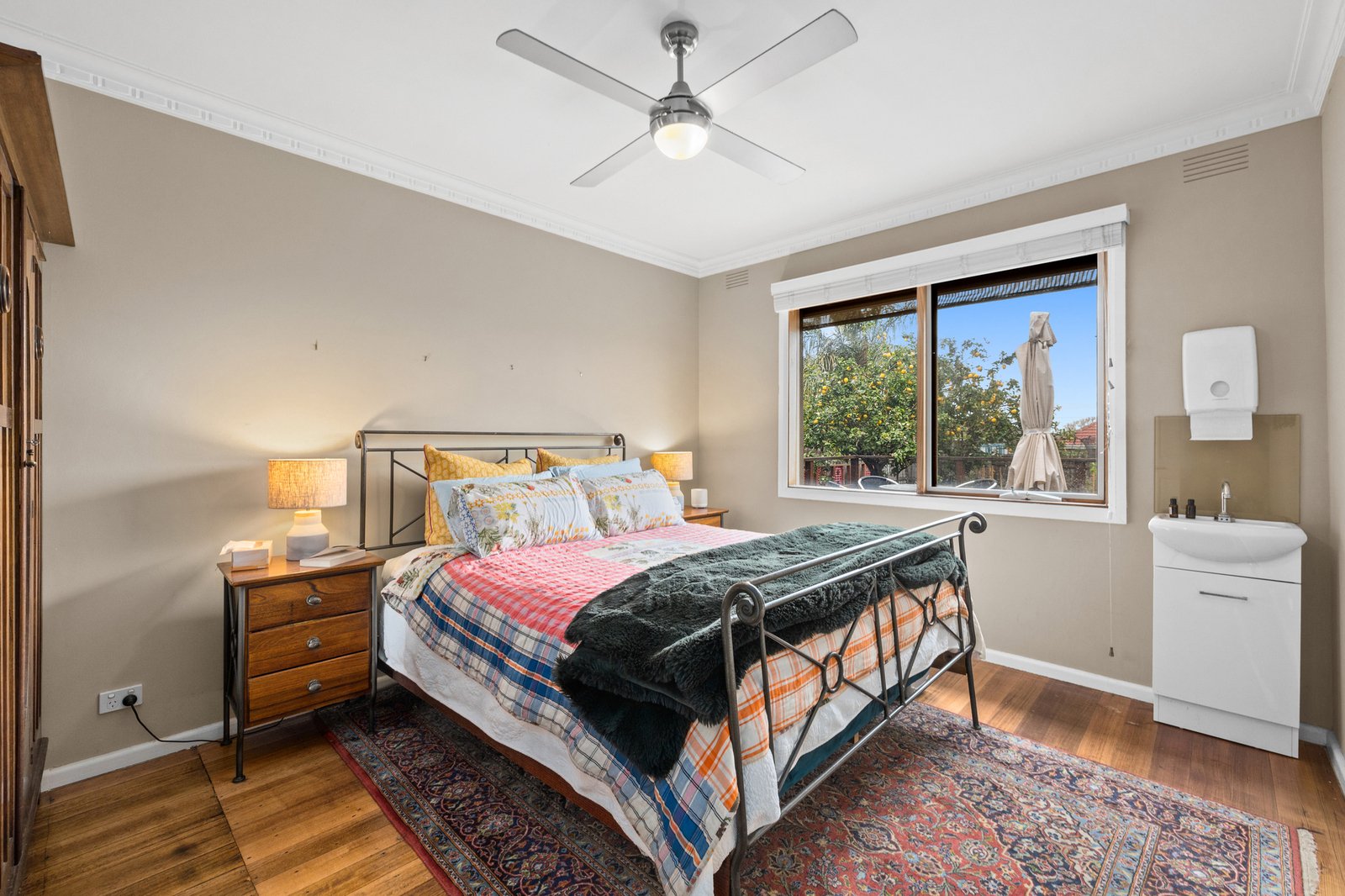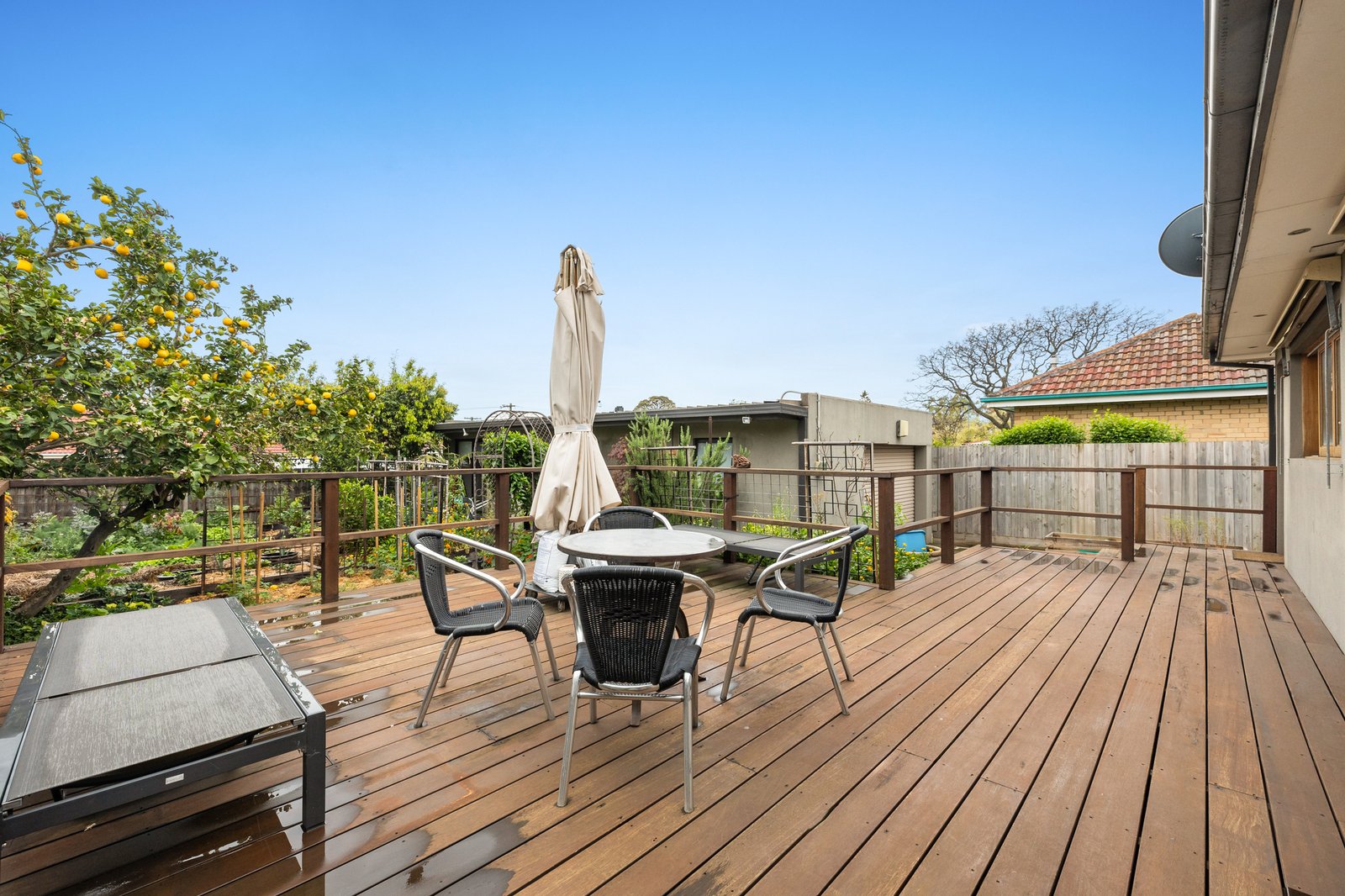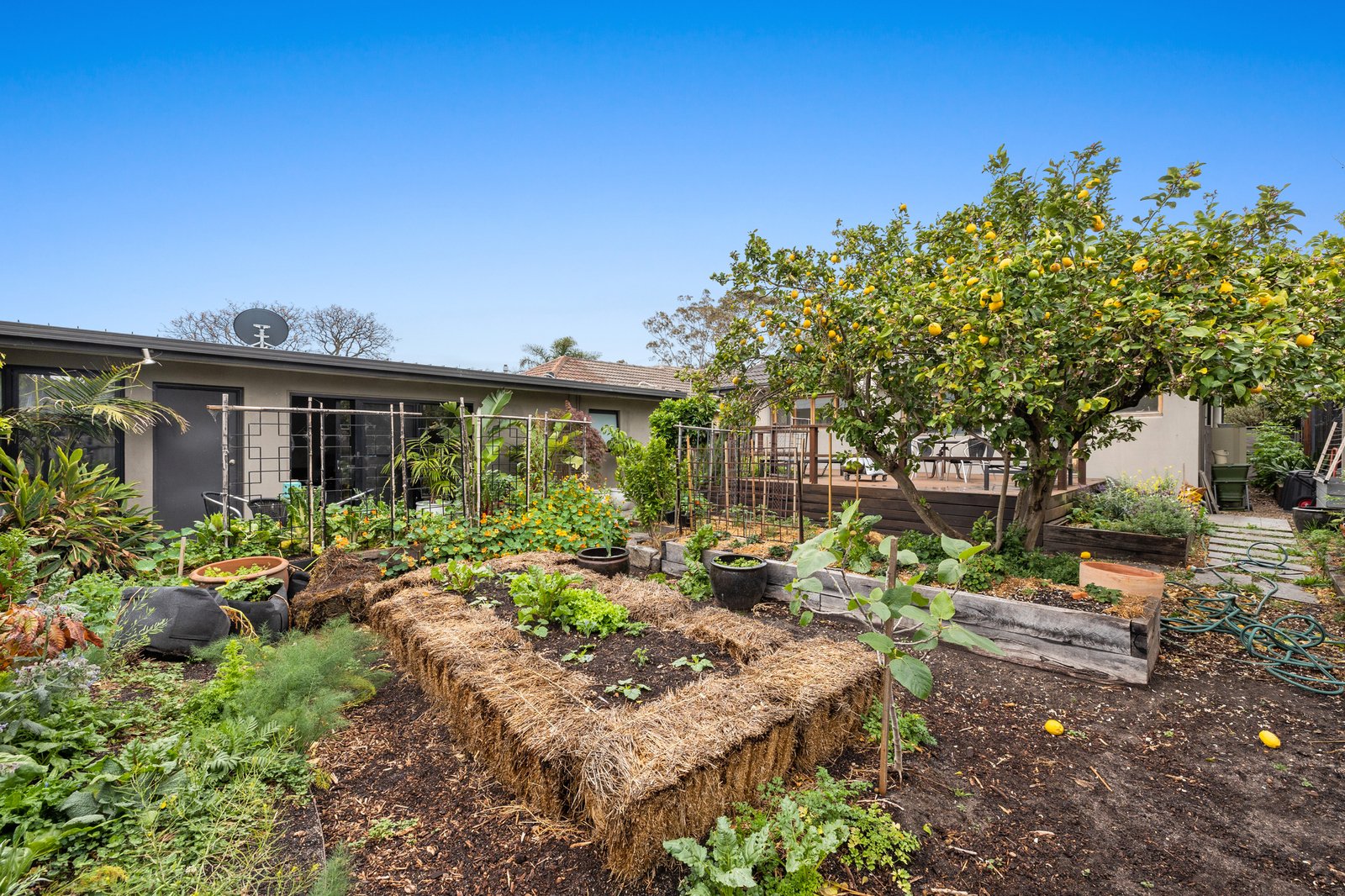 A sundrenched, elevated deck invites open-air relaxation as well as effortless entertaining. It looks out across the flourishing organic garden beds below where a fabulous array of fruit trees and vegetables will leave you spoilt for choice.