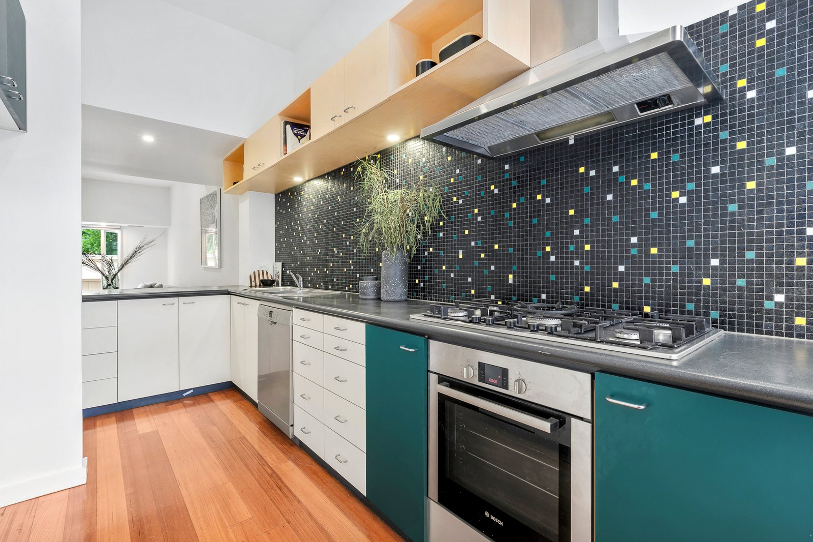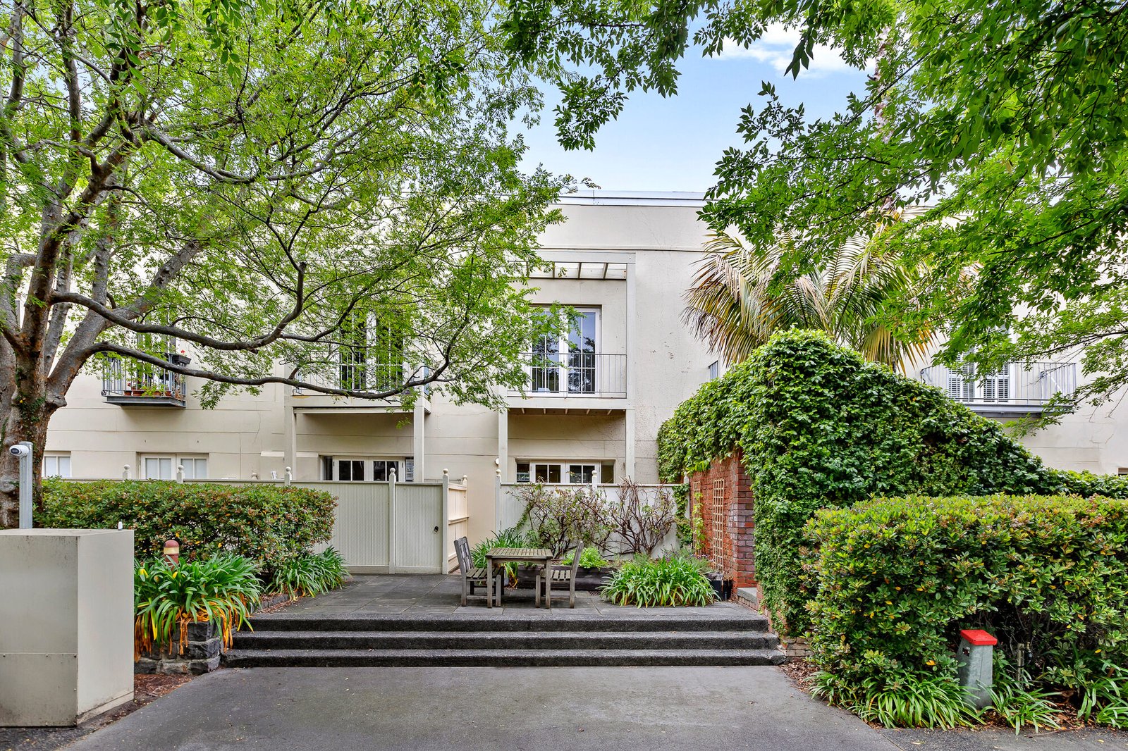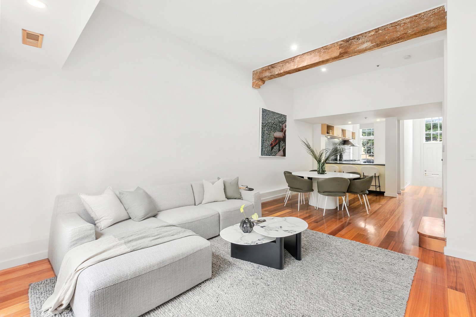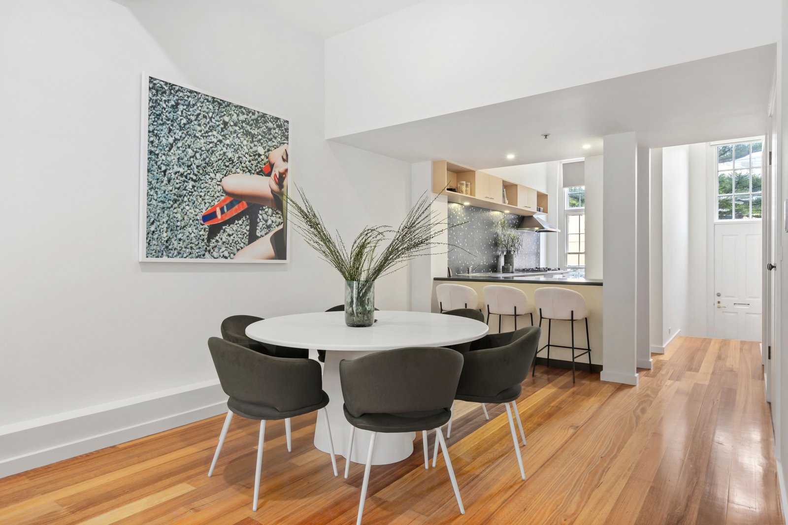 Behind its impressive facade, a warm and inviting interior unfolds, beginning with an elegant entrance hall that flows through to a spacious open plan living and dining area featuring timber floors and seamless access to a private rear courtyard with a secondary entrance. The well-appointed kitchen offers abundant storage and stainless-steel appliances, while a powder room and Euro laundry complete the lower level.