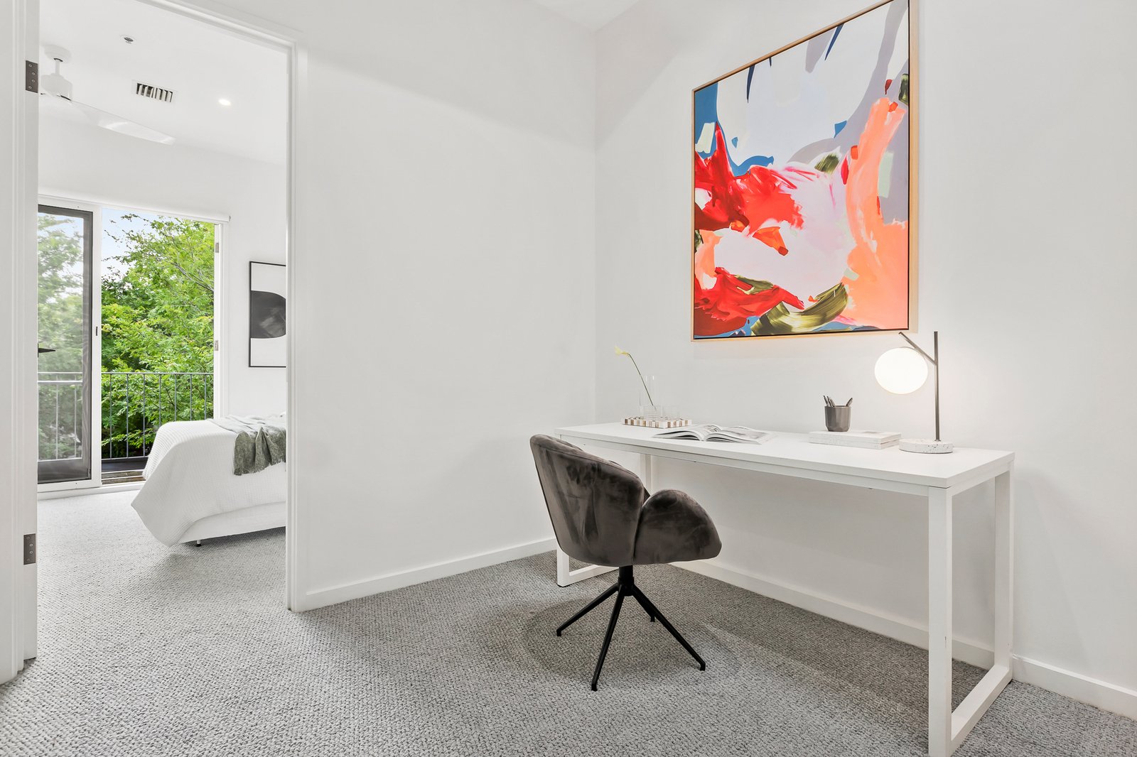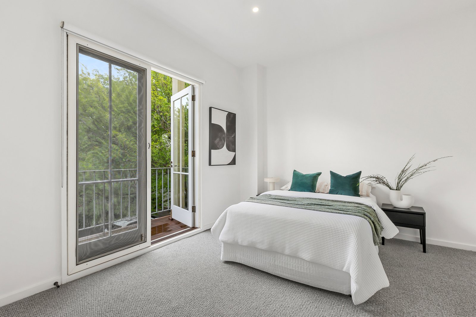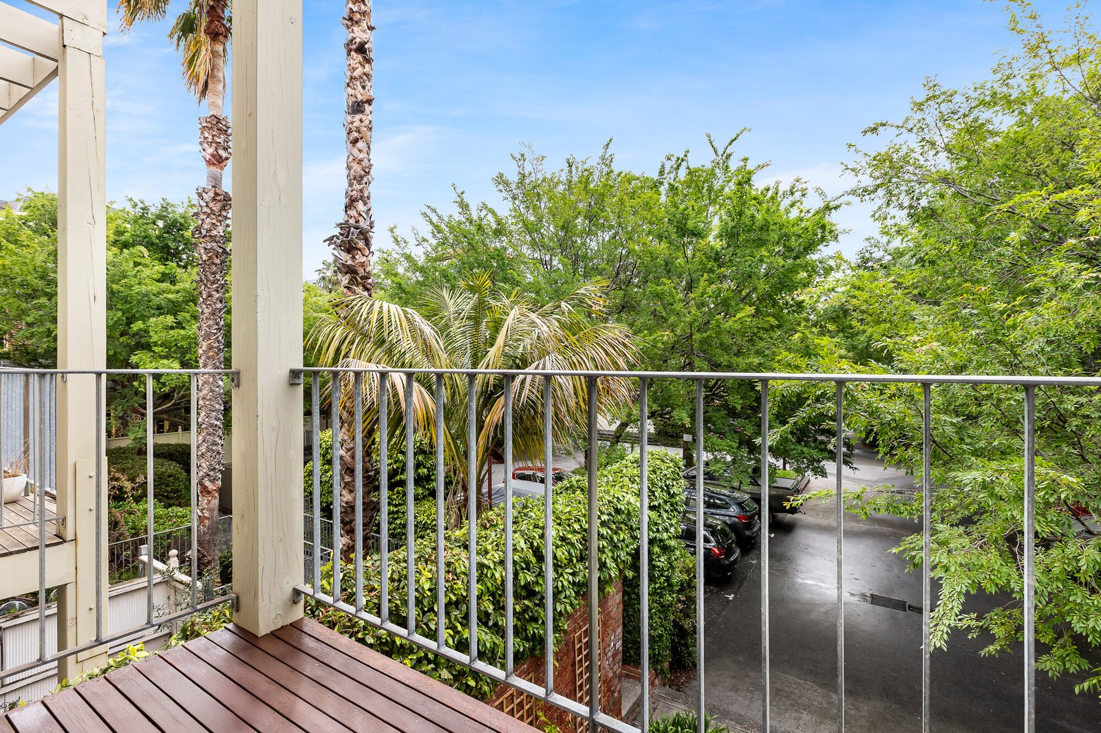 Upstairs reveals two generous bedrooms, both with built-in robes, the main bedroom enjoying a charming balcony overlooking leafy surrounds. A dedicated study area and two bathrooms, add to the home’s thoughtful design.
