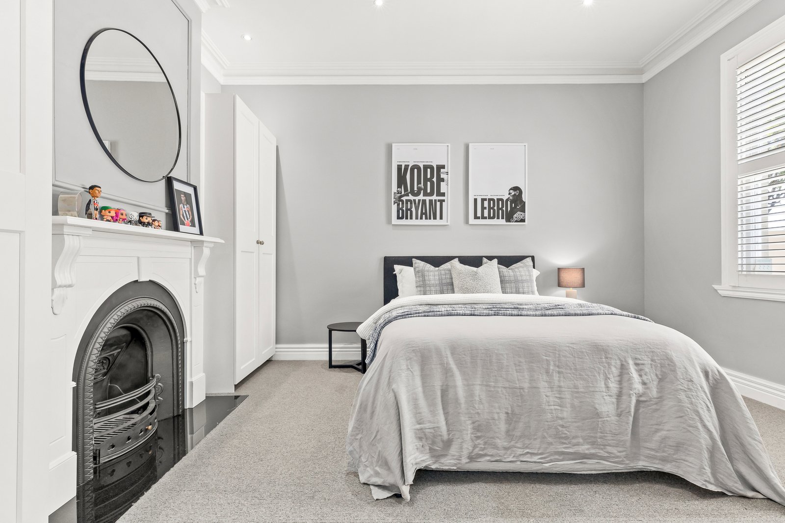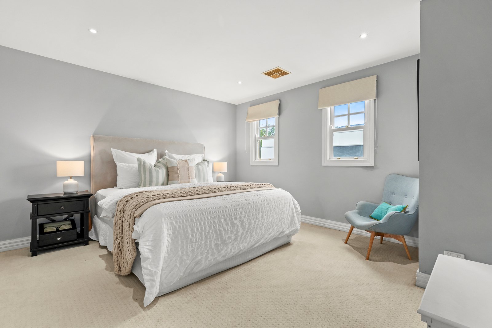 Downstairs, three character-filled bedrooms with period details, shuttered windows and custom built-in storage accompany a dual-vanity family bathroom with full-size bath and heat light, catering perfectly to a growing family. Secluded upstairs, the parents’ retreat with dressing room and stone-vanity ensuite is joined by a private home office or perfectly placed nursery.