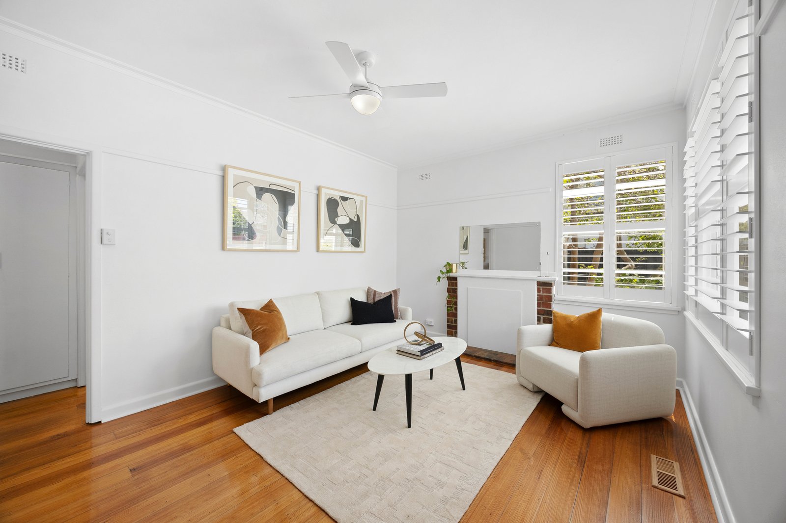 Beyond low-maintenance gardens and a welcoming porch, polished timber floors lead past an elegant front lounge, where plantation shutters, picture rails, and soft natural light highlight the home’s early character and warmth.