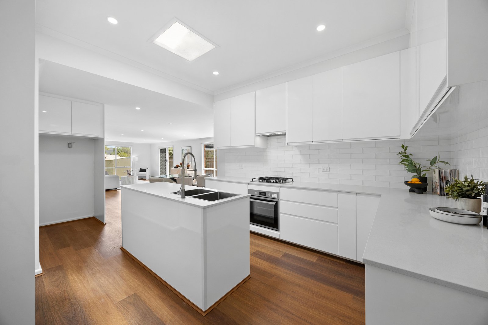 At the heart of the home, a skylit kitchen gleams with glossy white cabinetry, quality stainless steel appliances, and generous stone bench space, seamlessly connecting to the family living and dining domain oriented to the north and west.
