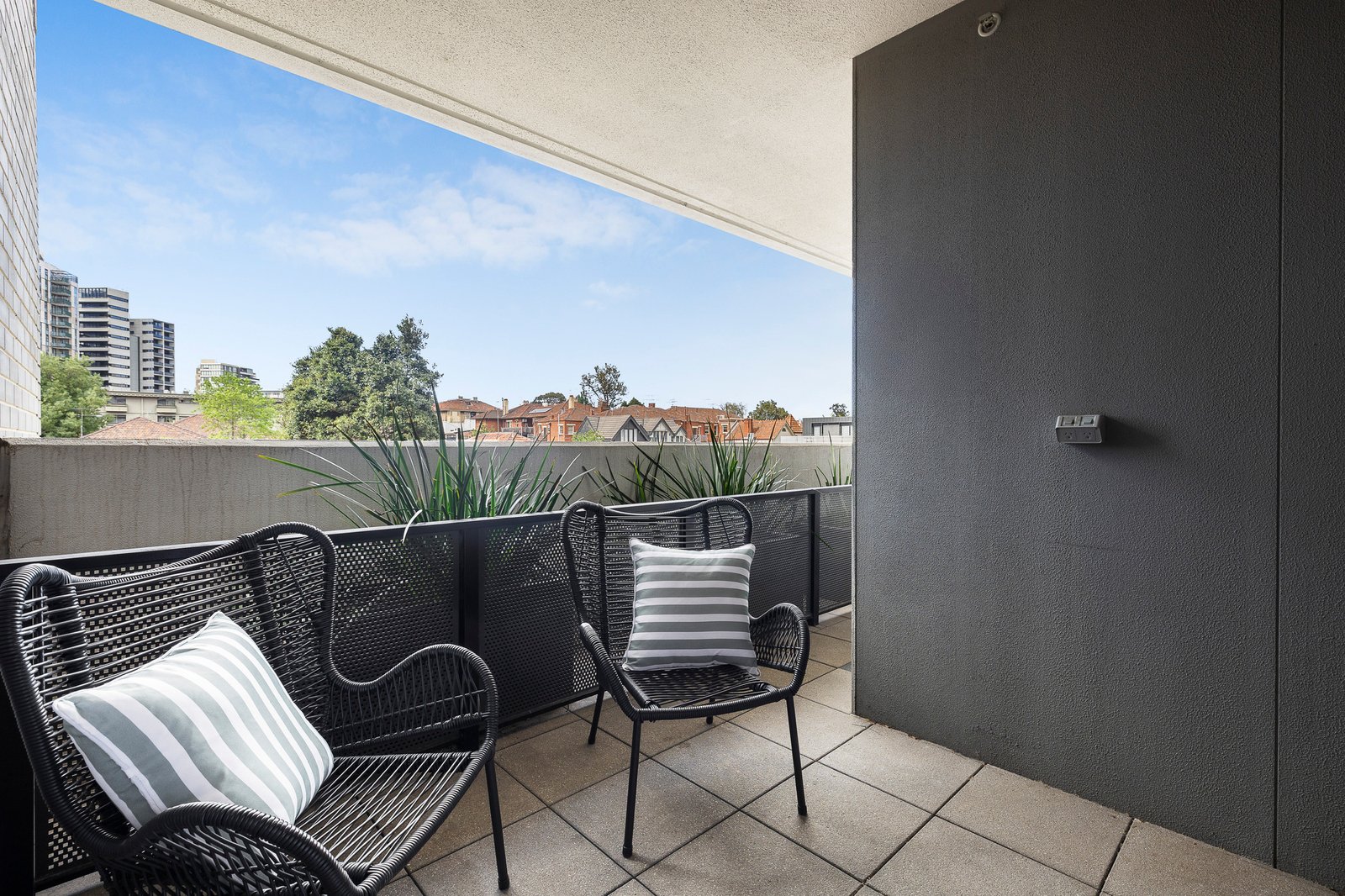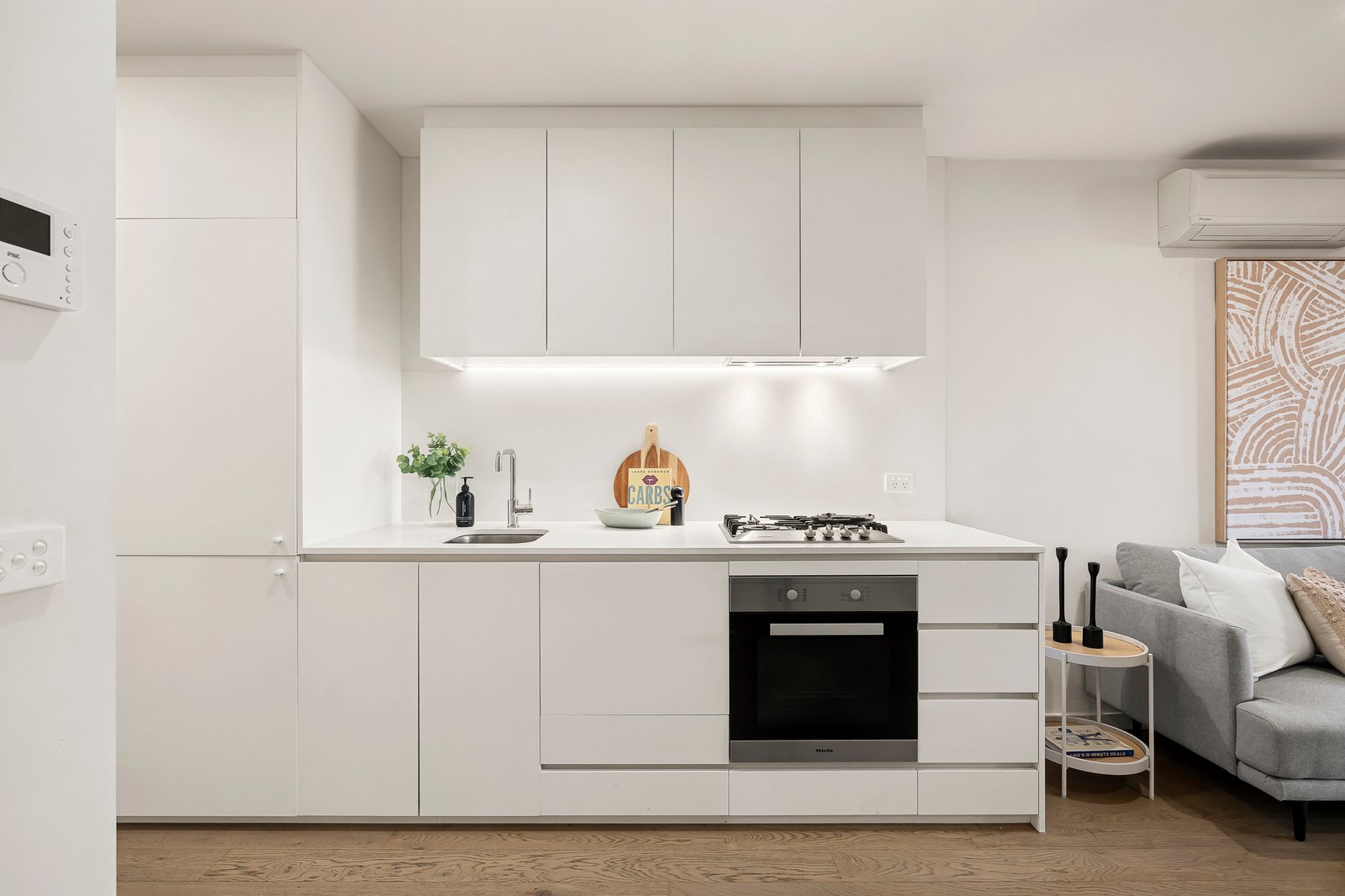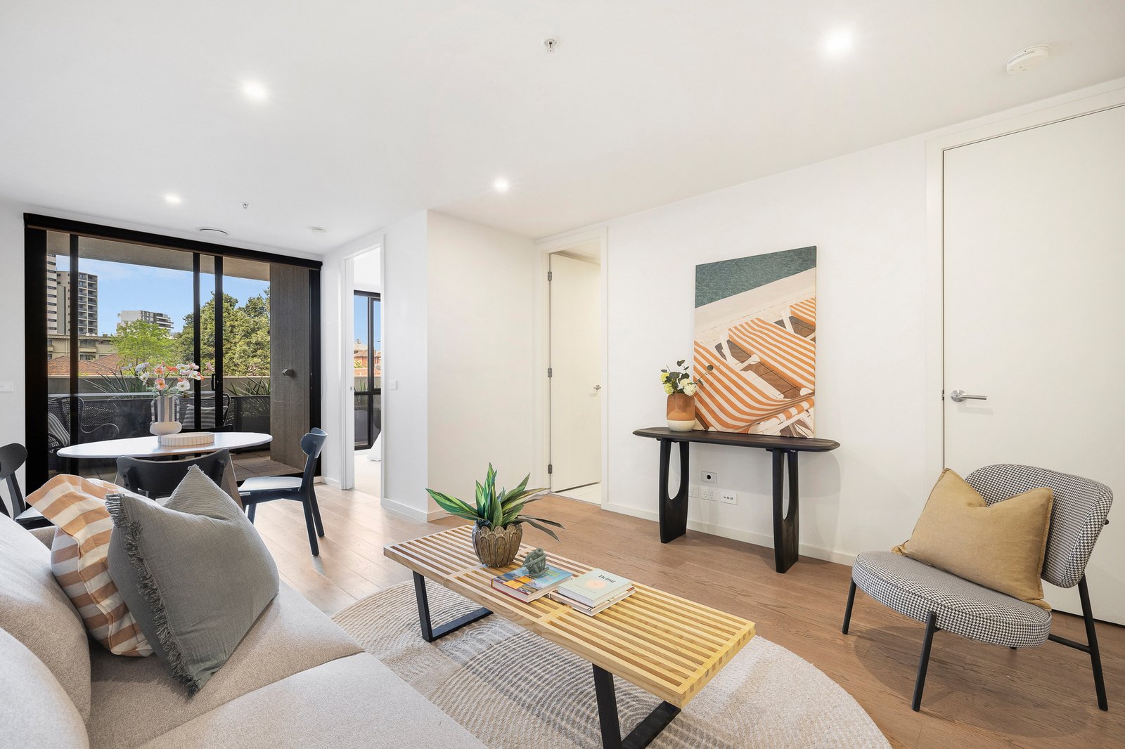 The generous open-plan living and dining zone is enhanced by engineered timber floors and flows seamlessly to a private balcony, ideal for alfresco entertaining. A fully integrated Miele kitchen with sleek finishes and abundant storage caters to contemporary needs with style. Two well-proportioned bedrooms master with built-in robes, complemented by a central bathroom, concealed laundry and the convenience of a separate store room.