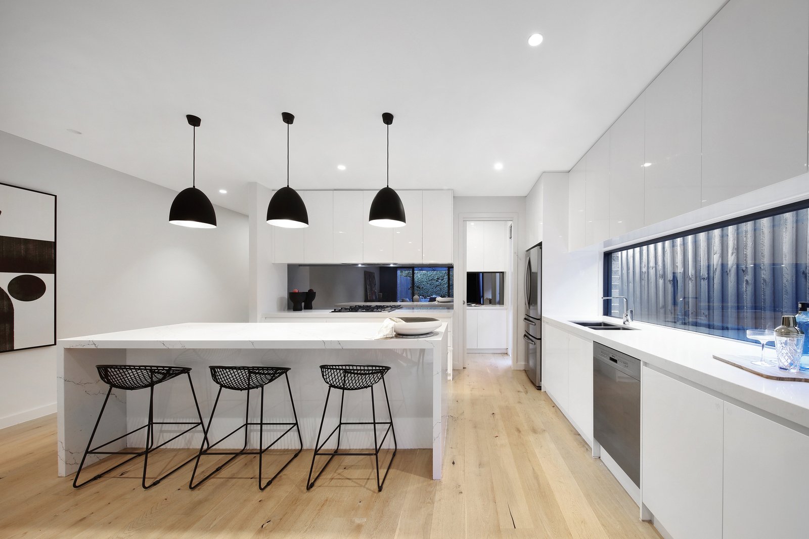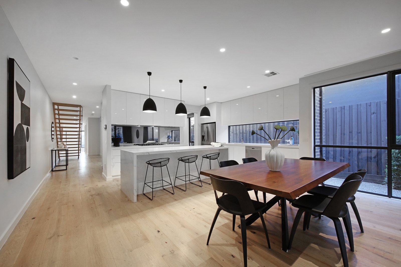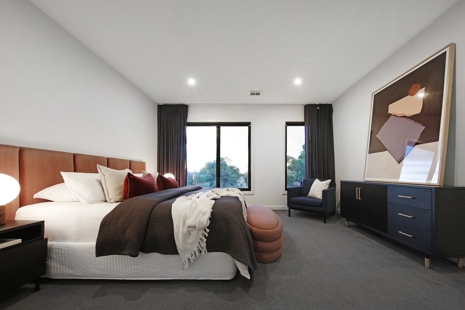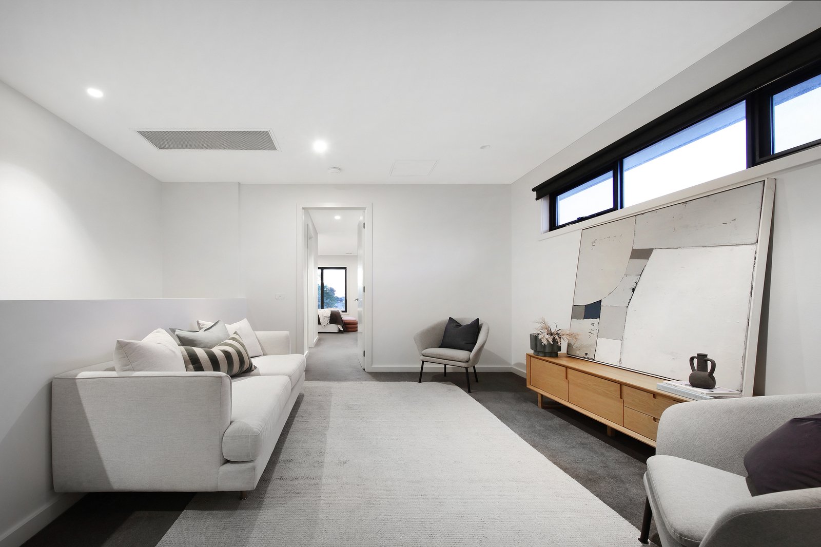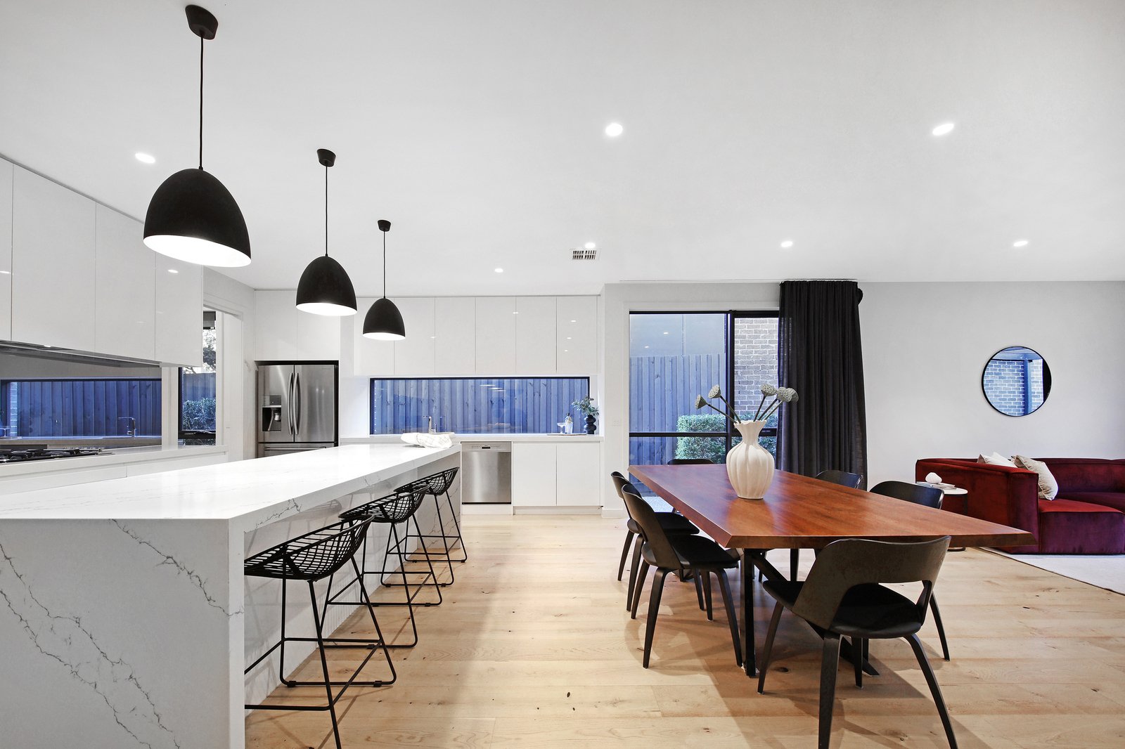 Appointed to the highest standard with a full complement of Smeg appliances and a north-facing window-splashback for the sun-catching kitchen and full-height Calacatta-look porcelain tiling for every bathroom, the home is filled with designer detail including Organic White and Calacatta-look Quantum Quartz benchtops, 2-Pak cabinetry, European Oak floors and a freestanding bath for the principal bathroom.