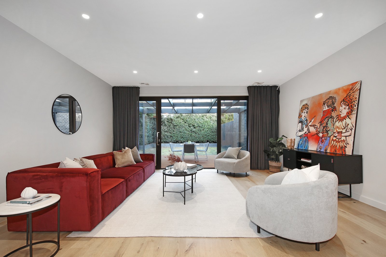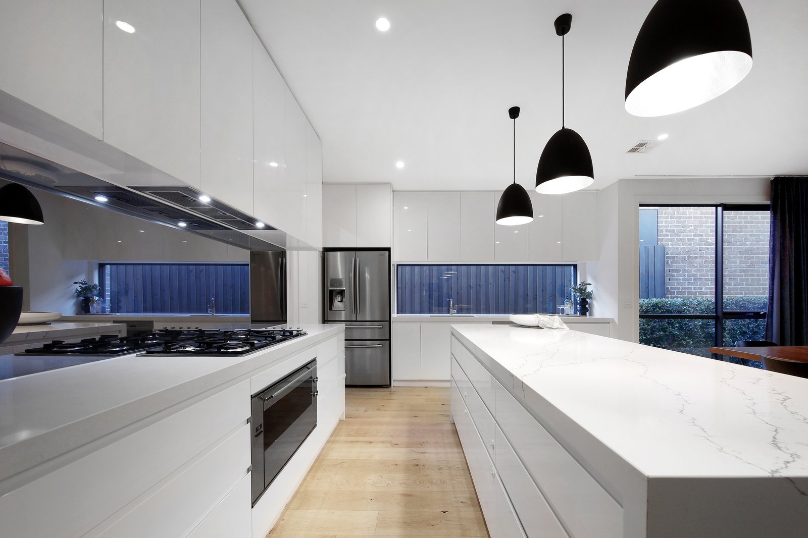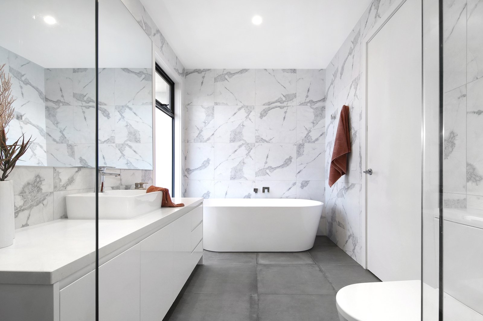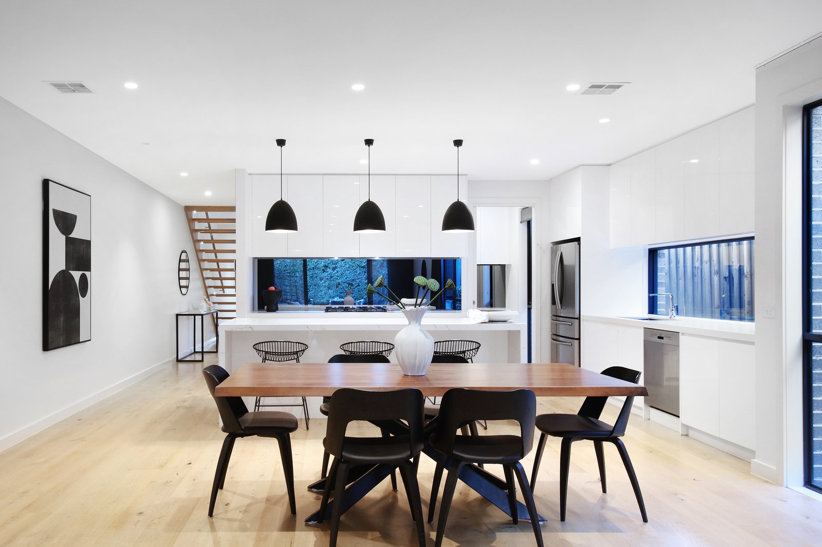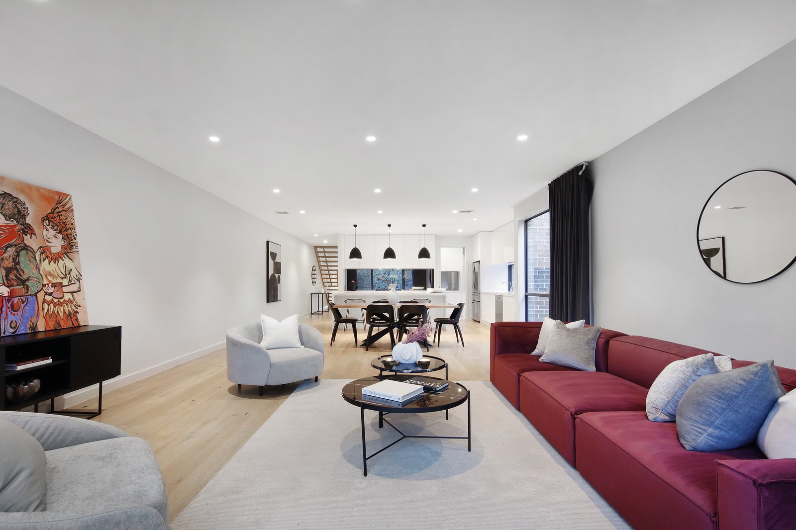 Appointed to the highest standard with a full complement of Smeg appliances and a north-facing window-splashback for the sun-catching kitchen and full-height Calacatta-look porcelain tiling for every bathroom, the home is filled with designer detail including Organic White and Calacatta-look Quantum Quartz benchtops, 2-Pak cabinetry, European Oak floors and a freestanding bath for the principal bathroom.