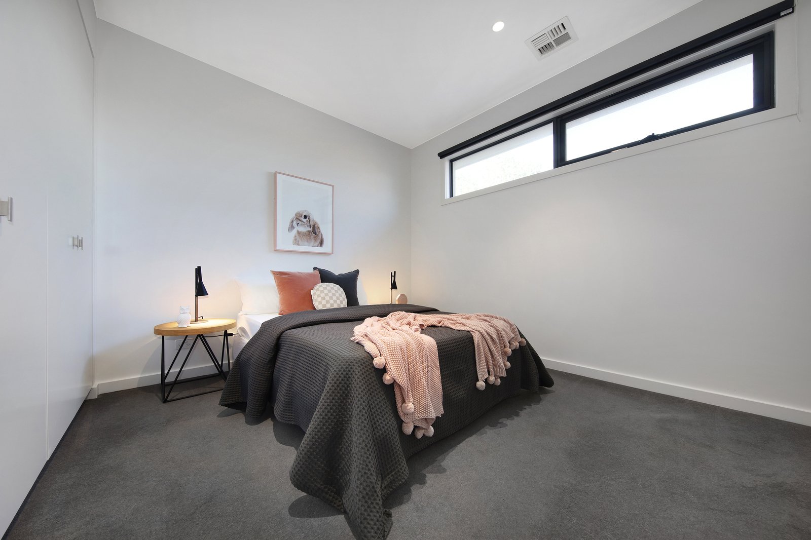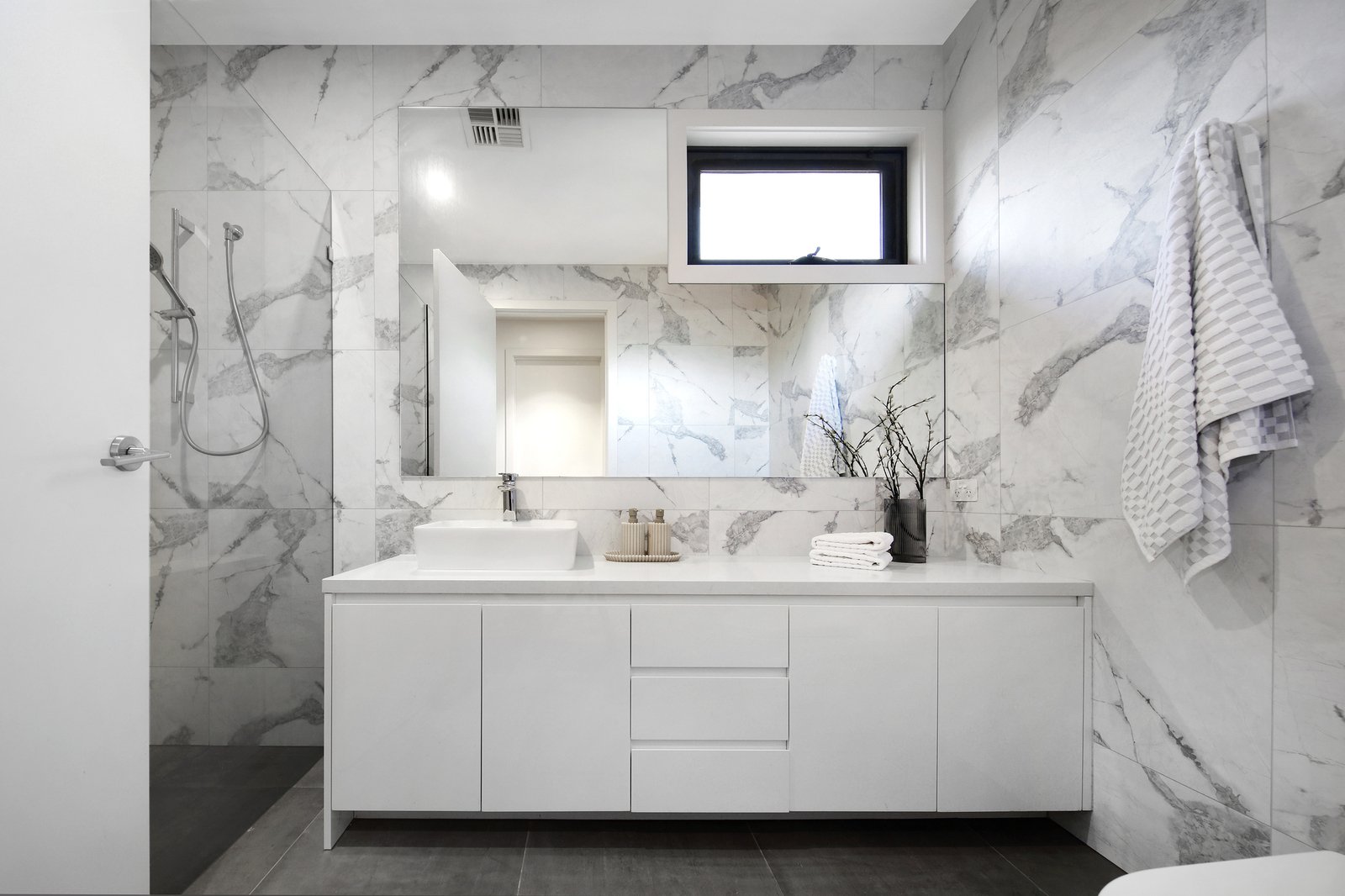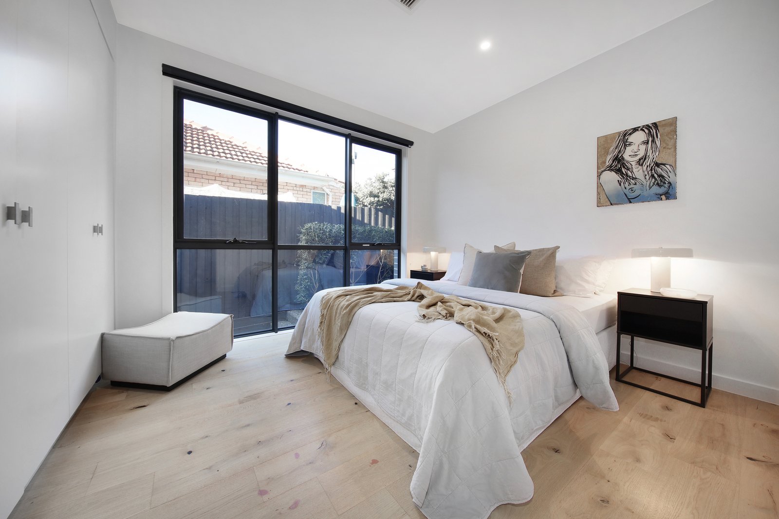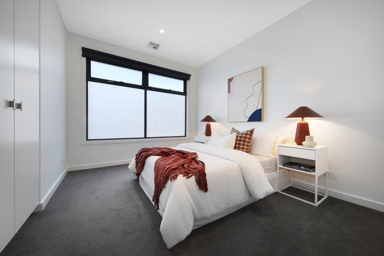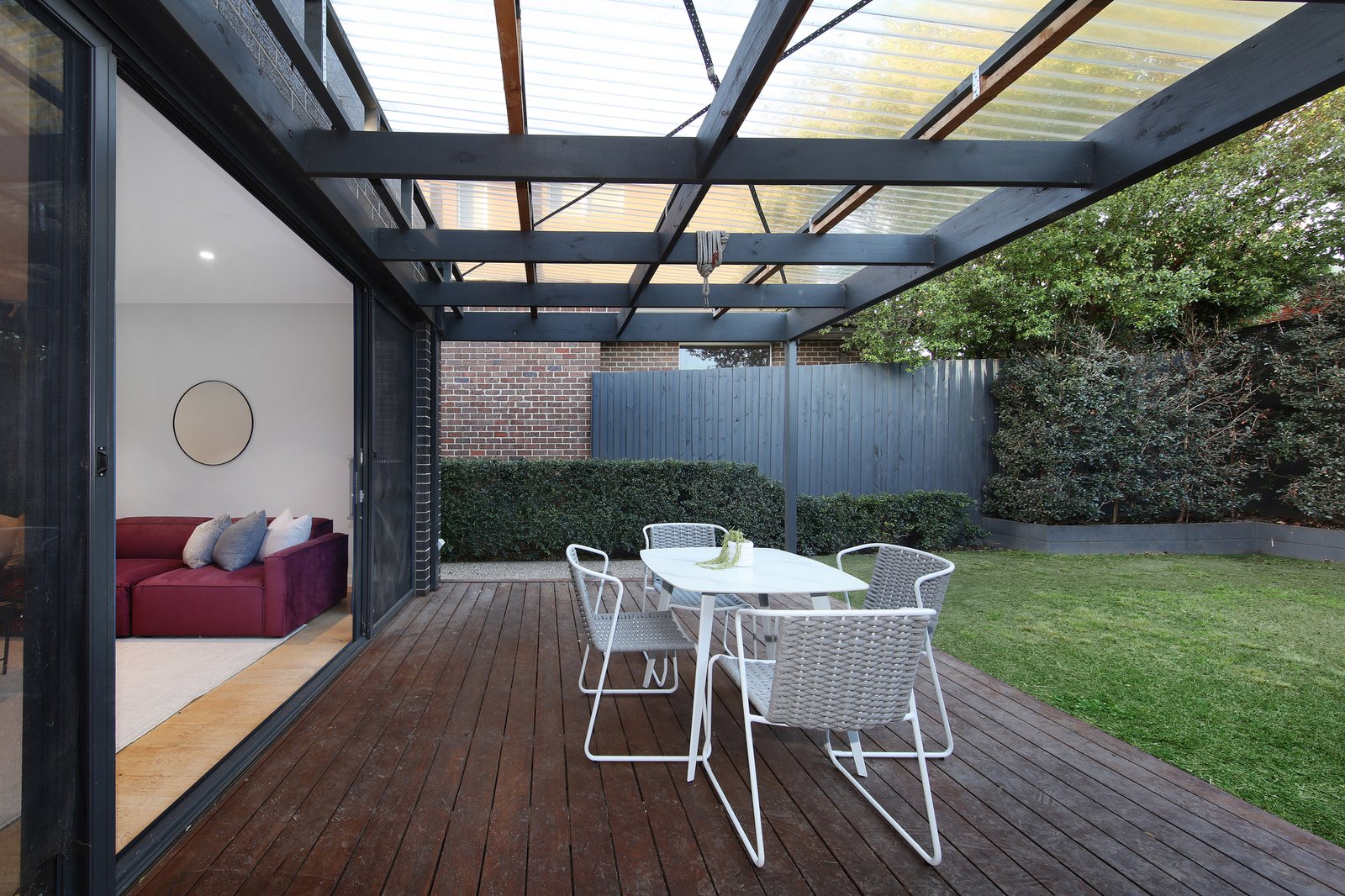 Appointed to the highest standard with a full complement of Smeg appliances and a north-facing window-splashback for the sun-catching kitchen and full-height Calacatta-look porcelain tiling for every bathroom, the home is filled with designer detail including Organic White and Calacatta-look Quantum Quartz benchtops, 2-Pak cabinetry, European Oak floors and a freestanding bath for the principal bathroom.