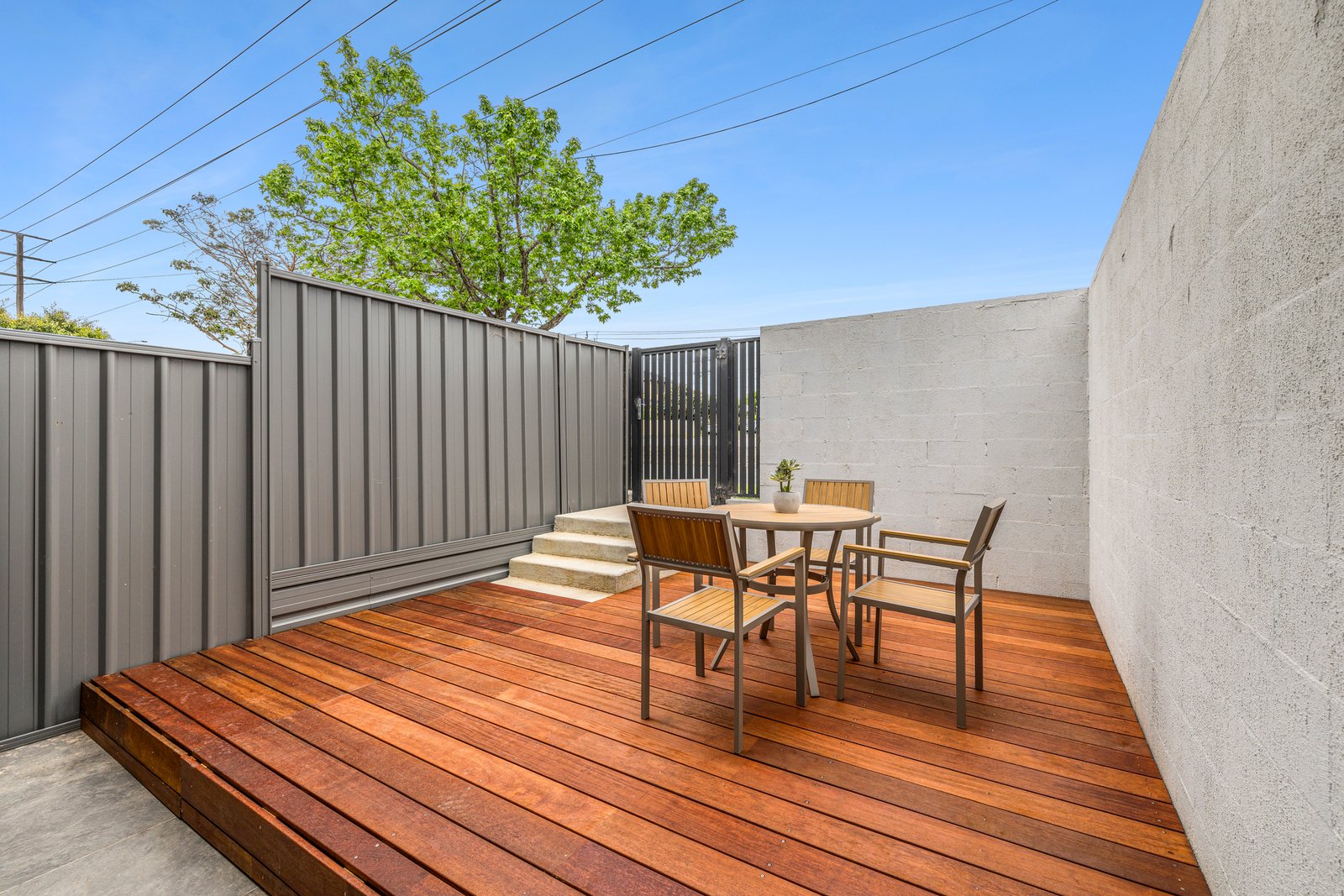 On the ground floor, the open-plan living and dining zone effortlessly extends outdoors to a private north-facing deck and courtyard—ideal for relaxed mornings with coffee or evening catch-ups in the fresh air. A bespoke stone kitchen anchors the space, complete with integrated dishwasher, five-burner gas cooktop and plenty of storage. A dedicated laundry and guest powder room add practicality without sacrificing style.