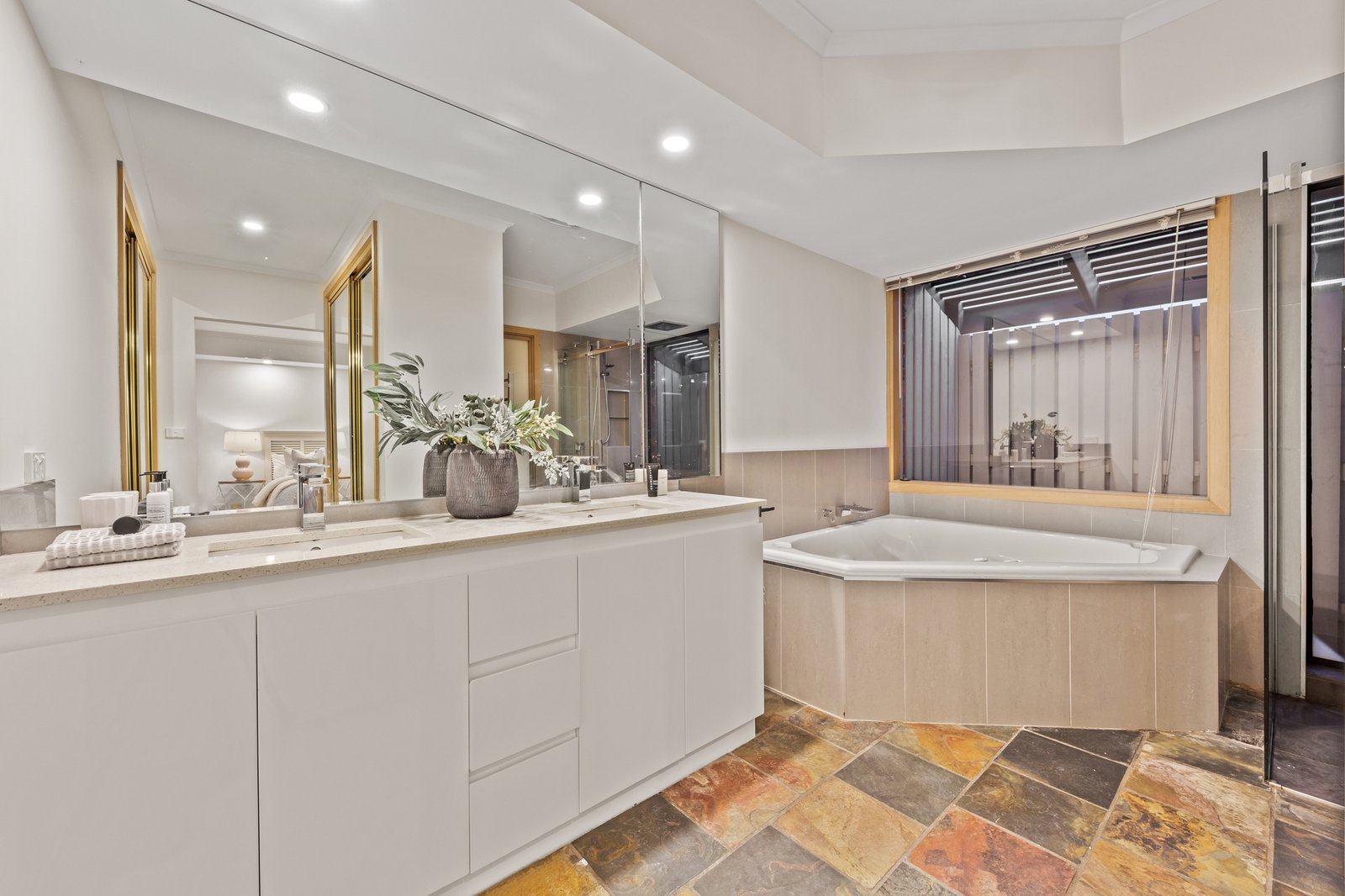 Offering family living on a grand scale with a well-zoned master-domain (encompassing mirrored robe area and designer dual-vanity spa-ensuite), this custom design lets the kids make a little noise in a quiet rear wing, and provides a quiet spot to get to work in a garden-view fourth bedroom or home-office. Opening up to an entertaining life with a formal sunken lounge and elevated dining, the home stretches out in north sun with a central kitchen-casual area flowing to a curvaceous outdoor area, and an expansive family zone extending to an entertainers’ bar.