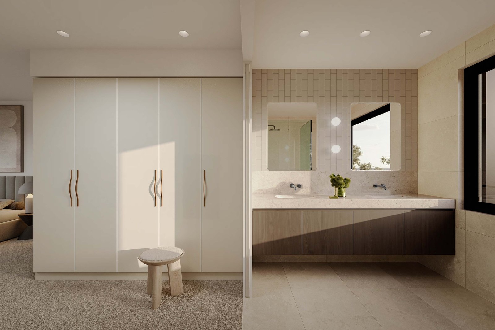 Styled to a demanding architectural specification with a fully integrated Smeg appliance kitchen featuring a 900mm oven and induction cooktop (and the option to upgrade to an integrated fridge-freezer), the home is curated in uncompromising style with the latest loop-pile carpets alongside European Oak floors, natural stone benchtops plus stone-look porcelain tiles and vertical and mosaic tile features.