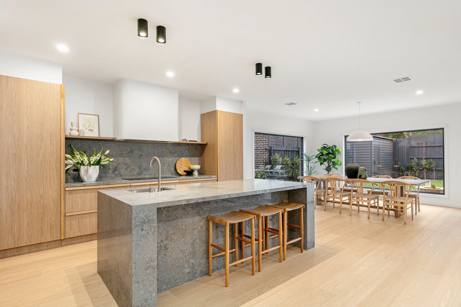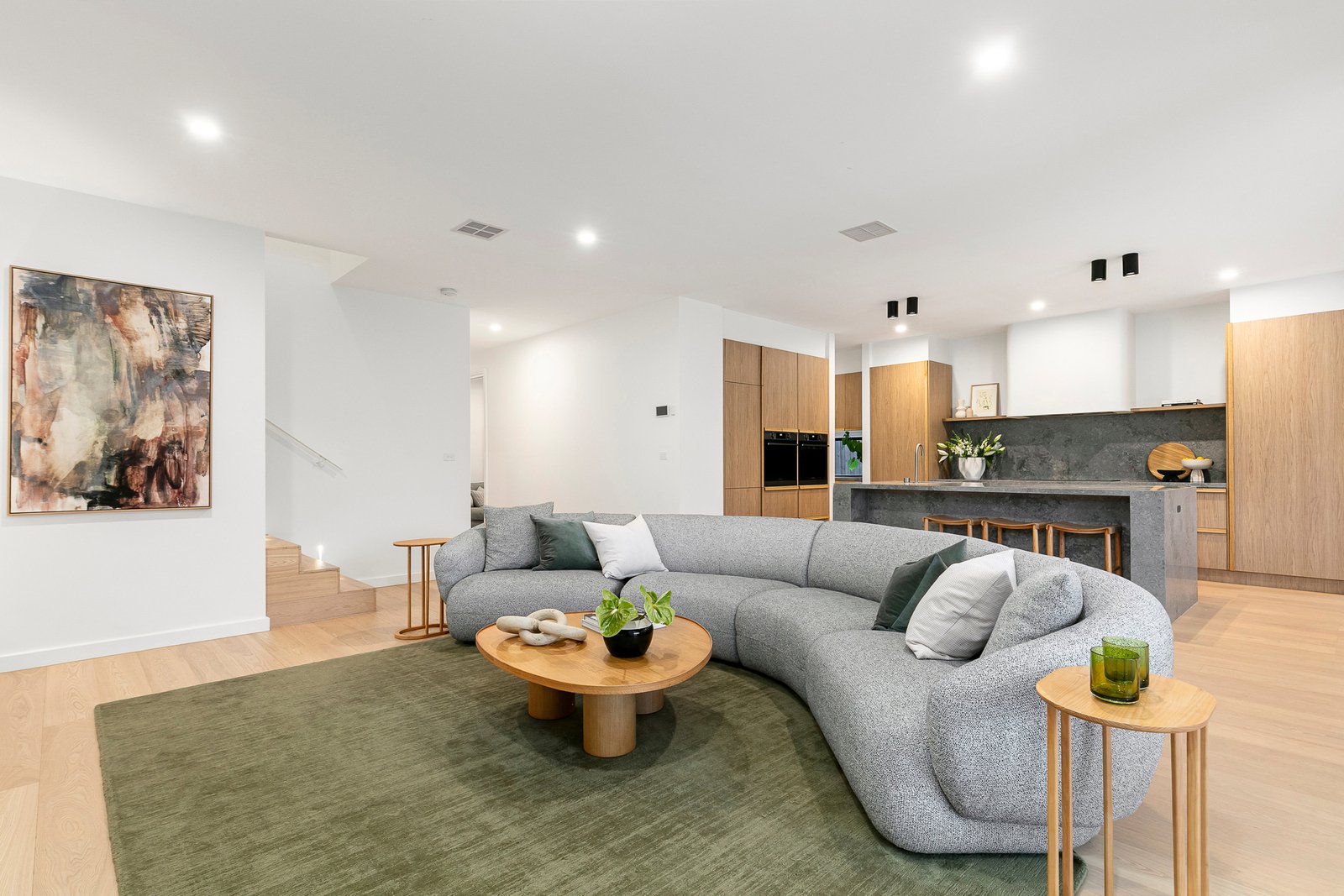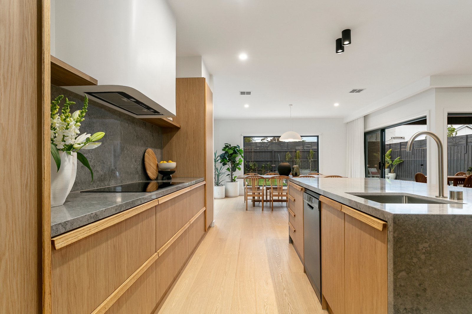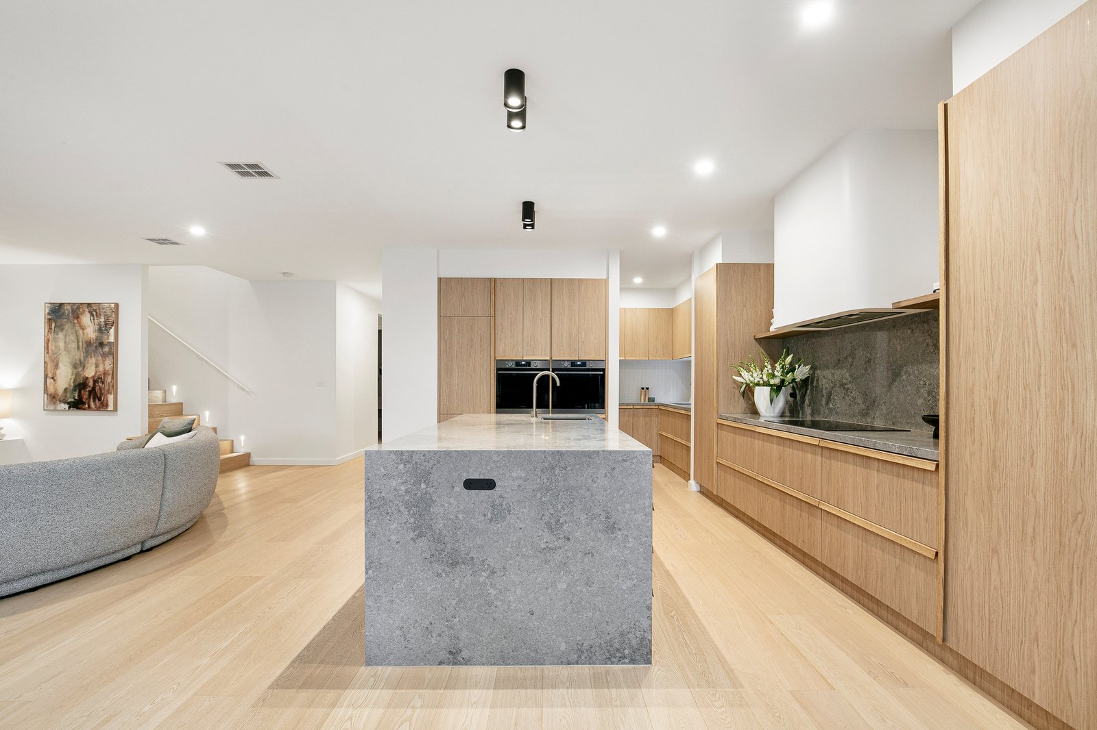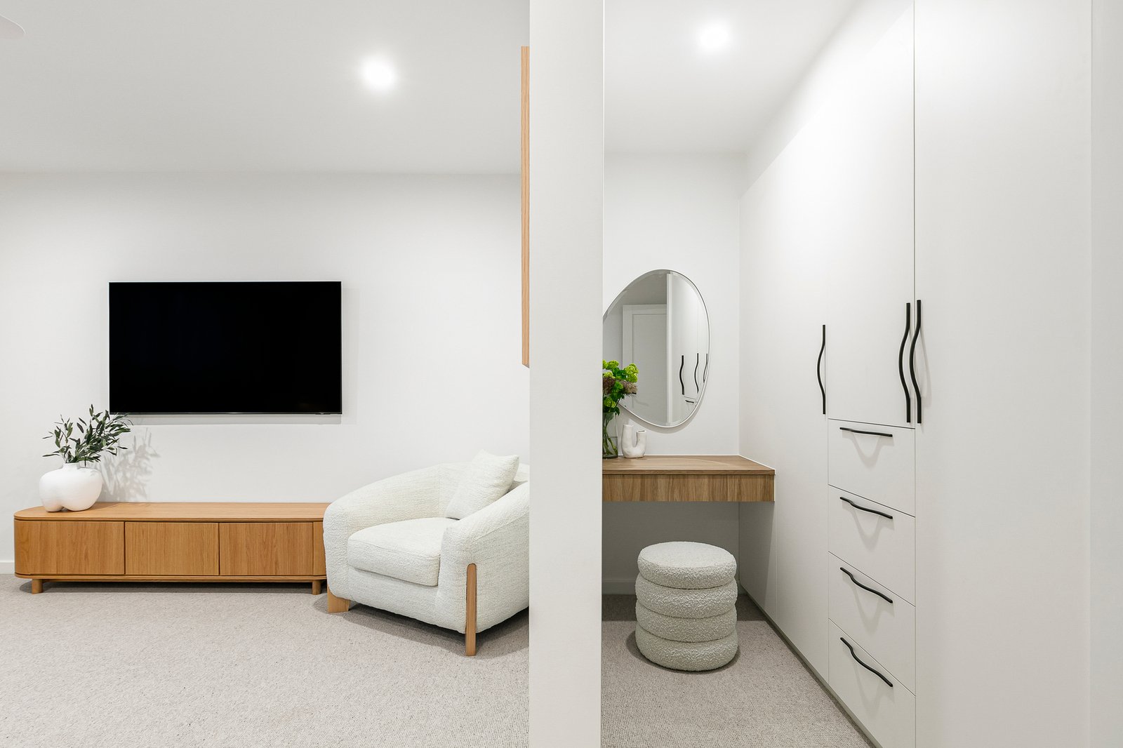 Every surface, every fixture tells a story of quality and care. Woodcut engineered oak flooring flows through the living spaces, while plush Carramar wool loop carpet adds softness and warmth to the bedrooms. The custom Polytec Woodmatt cabinetry throughout provides abundant storage wrapped in contemporary style, while ABI Interiors brushed nickel tapware in every kitchen and bathroom adds cohesive elegance.