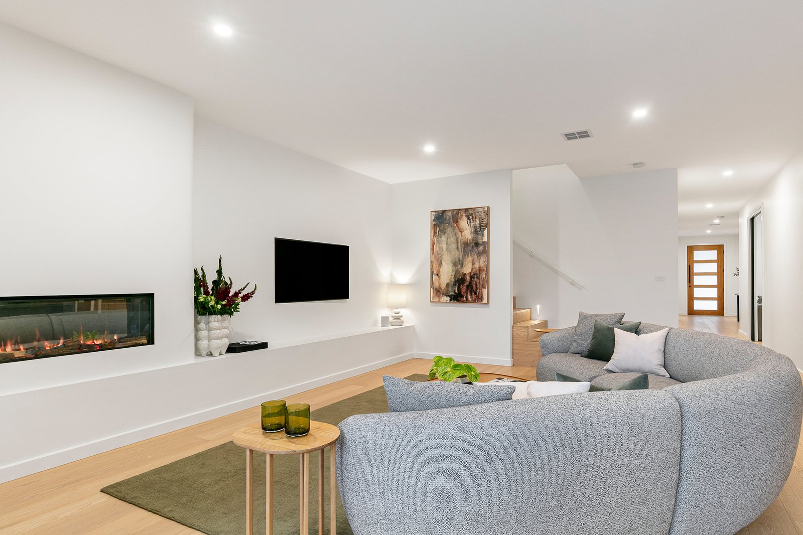 The heart of the home unfolds in a magnificent open-plan kitchen, living, and dining area bathed in natural light. Here, the gourmet kitchen becomes the natural gathering point, featuring an integrated Bosch fridge-freezer, dual Westinghouse ovens with air-frying capability, a 900mm Westinghouse ceramic cooktop and a butler's pantry with space for a second full-sized refrigerator. ABI Interiors brushed nickel tapware adds a touch of refined elegance, while custom Zetr feature power points deliver both style and convenience. The warmth of a Rinnai electric fireplace creates an inviting ambiance for cooler evenings.