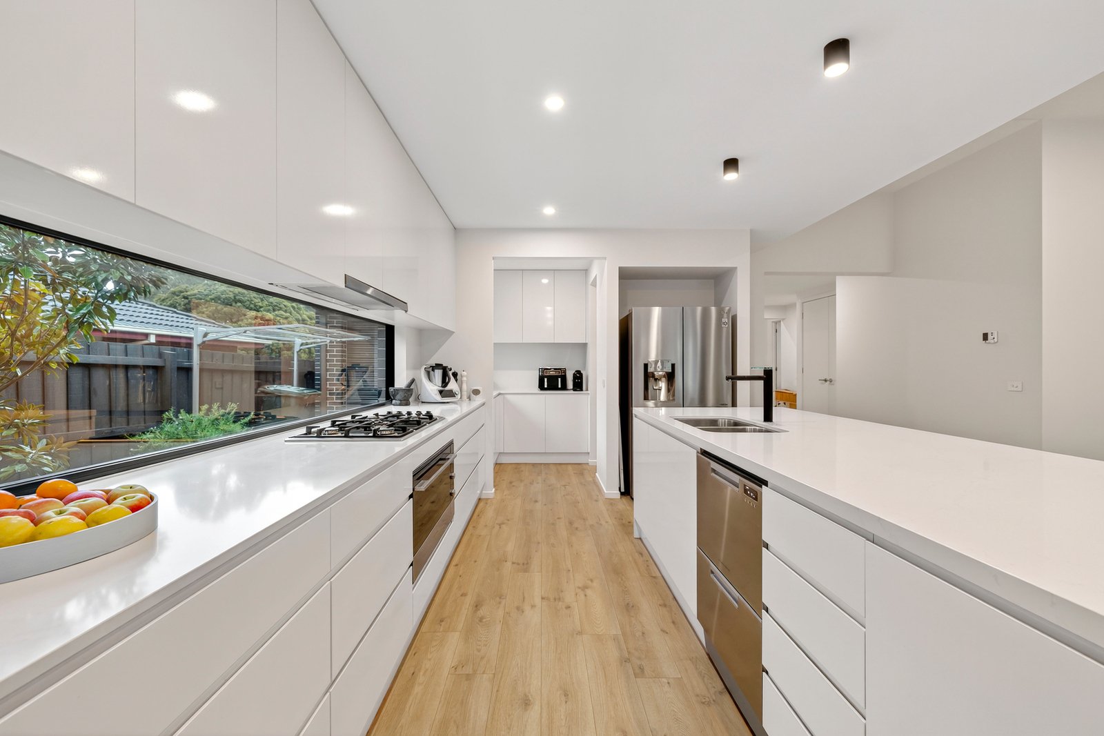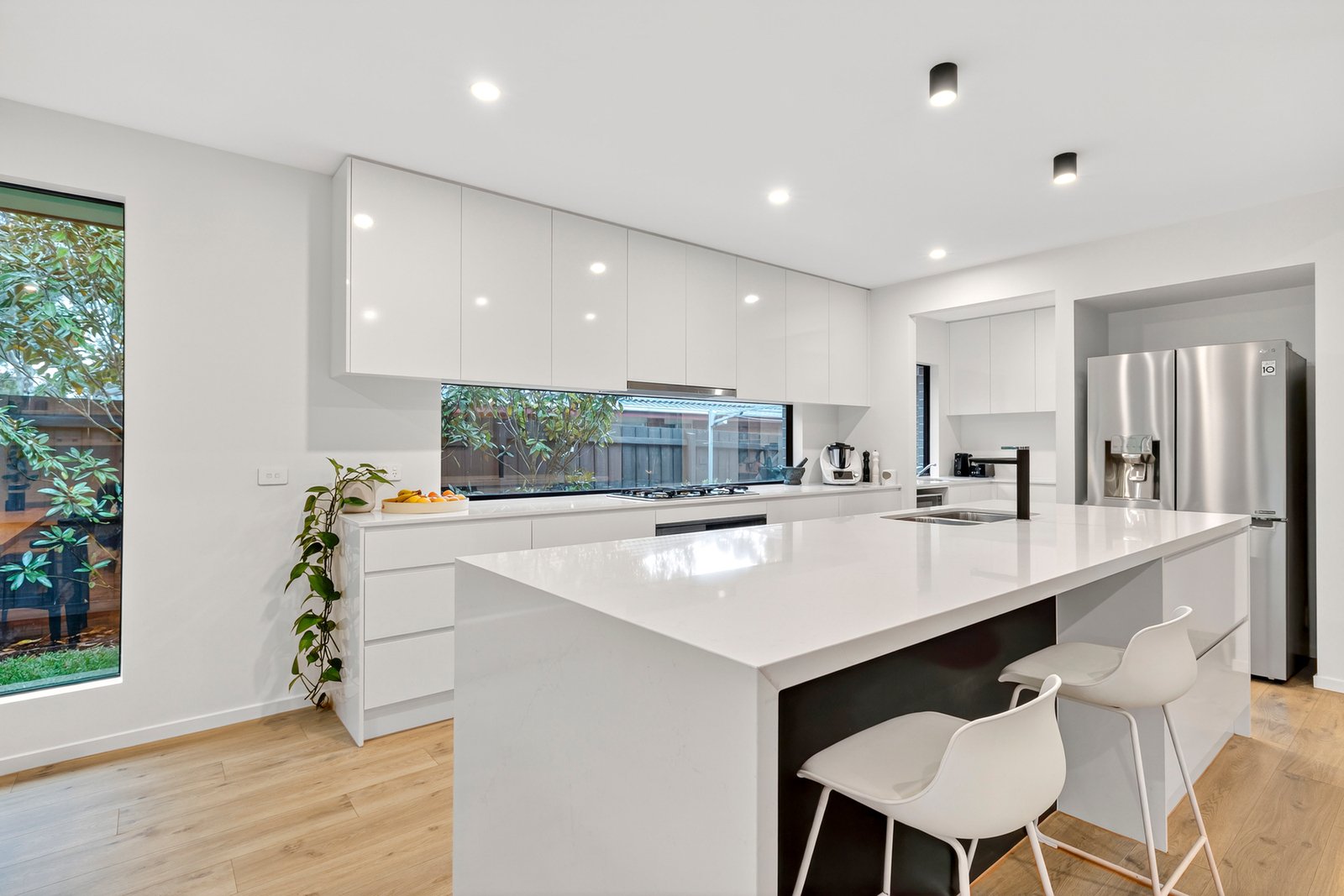 Modern comforts and features: Oversized double garage for storage ease with a rear roller door and internal access Large fitted laundry with own service yard access Kitchen with a full suite of Fisher & Paykel appliances – 900mm gas cooktop, 900mm oven and dishwasher drawers Aluminium windows incl stacker doors to living zone Outdoor kitchen with plumbed Grillmaster BBQ, sink and drinks fridge.