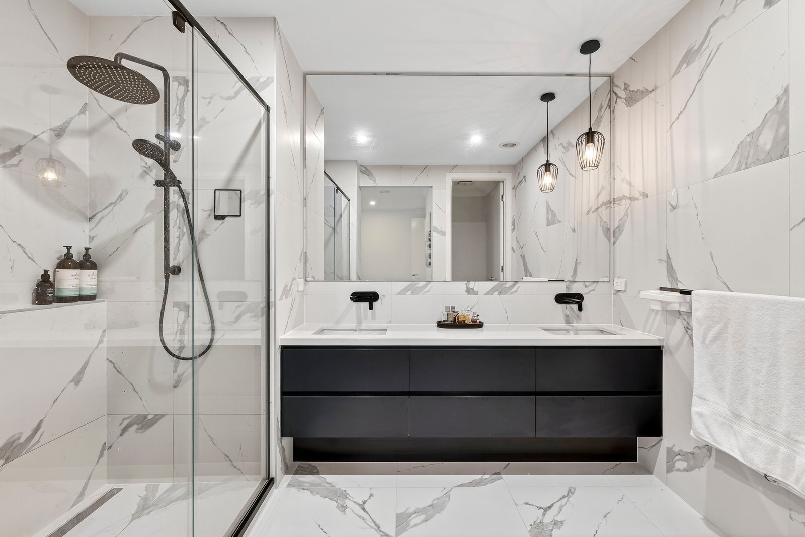 A well separated master suite is pampered by a walk-in robe and a sparsely laid out ensuite with full height tiles and a walk in rainfall shower. While three further bedrooms and an office are paired with a family bathroom with tub and a powder room.