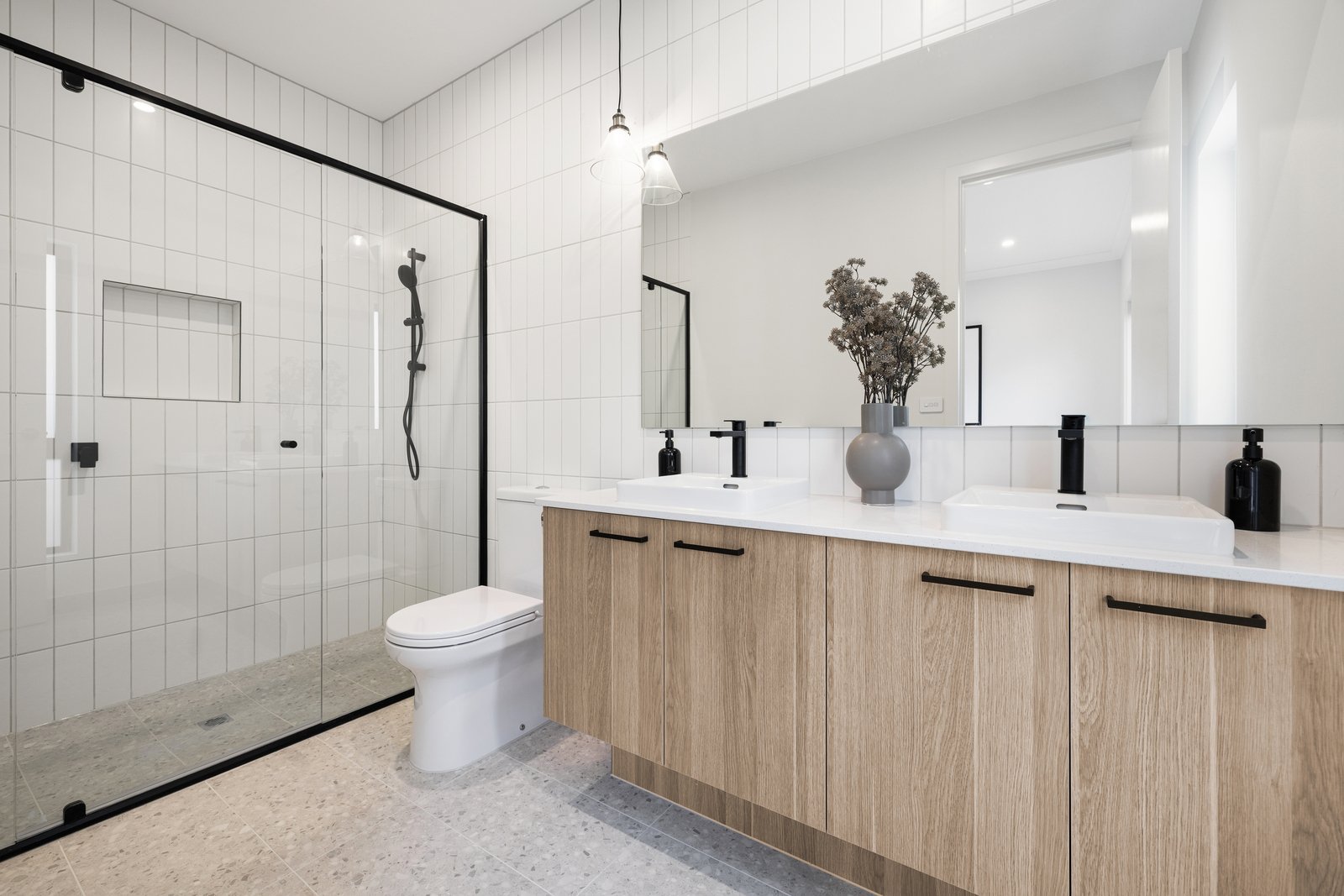 The well-separated master bedroom boasts a huge walk in robe and a terrazzo ensuite furnished with a twin stone vanity. While a ground floor master suite offers respectfully matching appointments. This spacious home is also supported by a family bathroom with tub, a guest powder room and a fitted laundry that adjoins the garage access (offering an ideal mud room option).