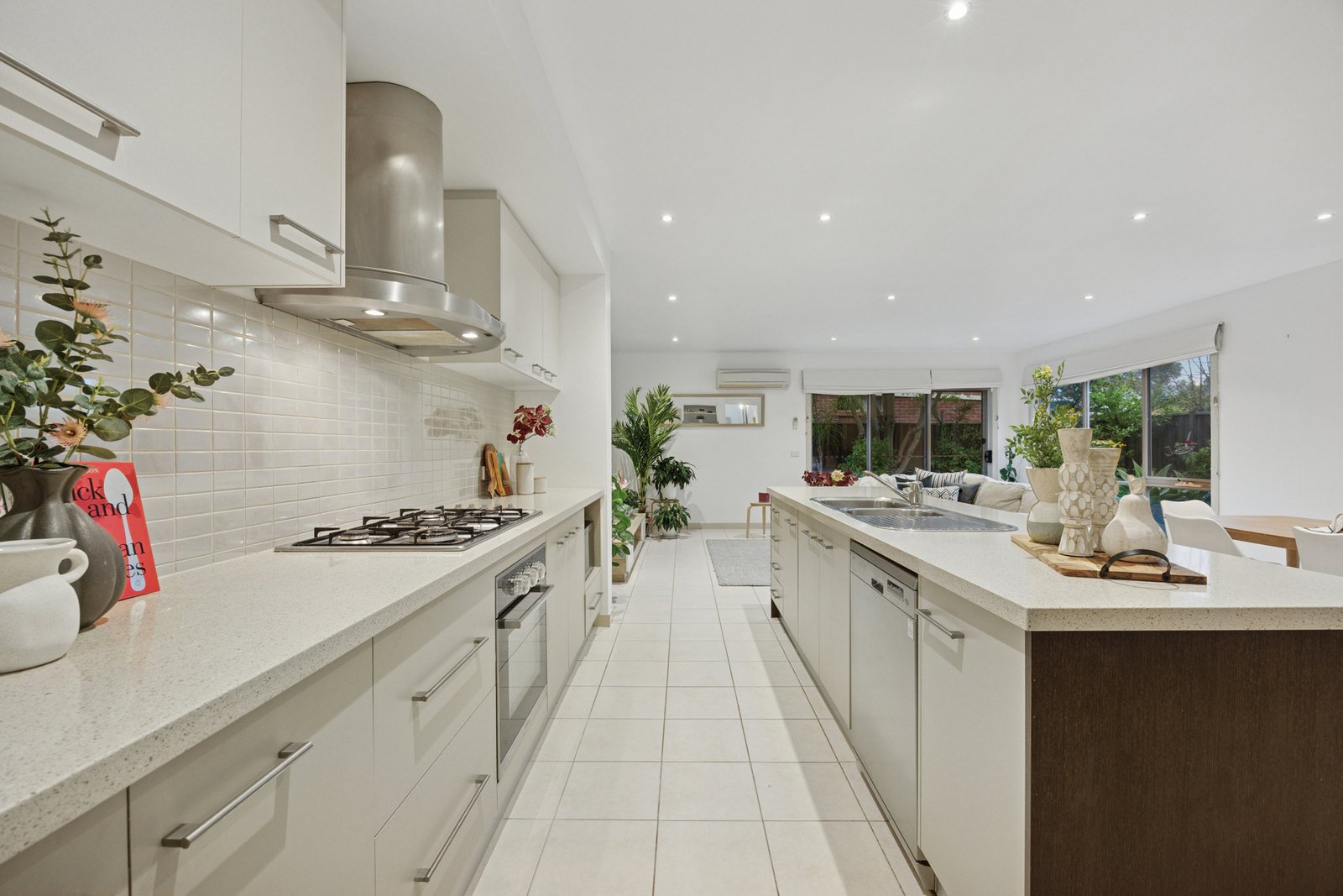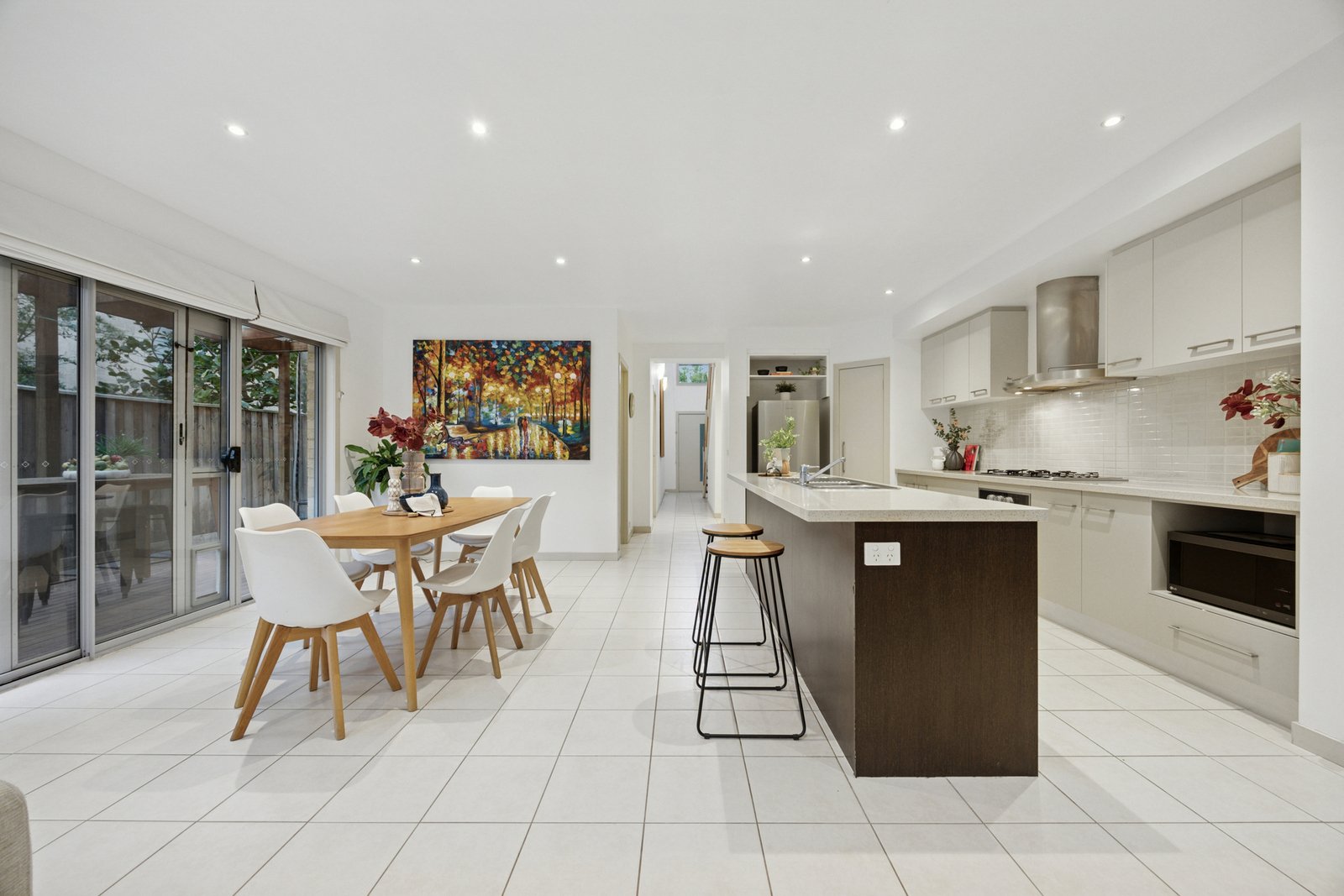 A welcoming and enticing choice with abundant space and entertainment value, it showcases an immaculately tiled open-plan living zone at the rear. The modern kitchen will captivate home chefs with a stone island bench, stainless steel gas appliances including a 5-burner cooktop, dishwasher, rangehood with LED lights, microwave nook, and large pantry.