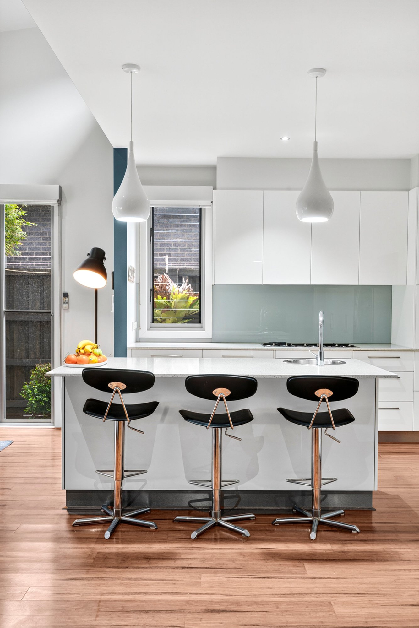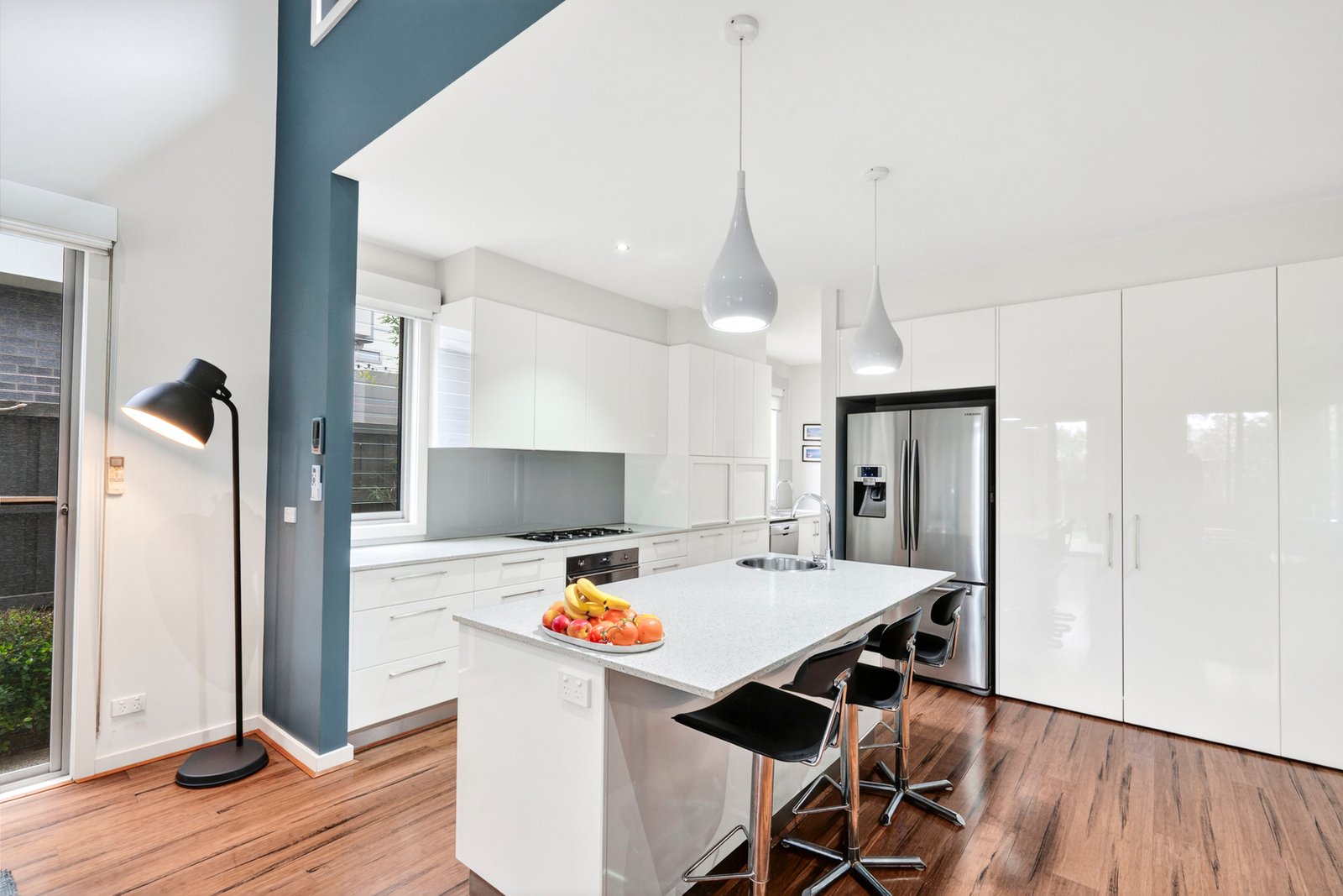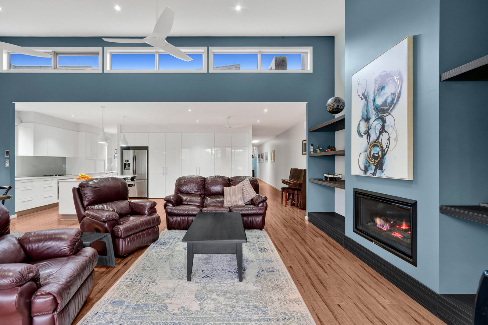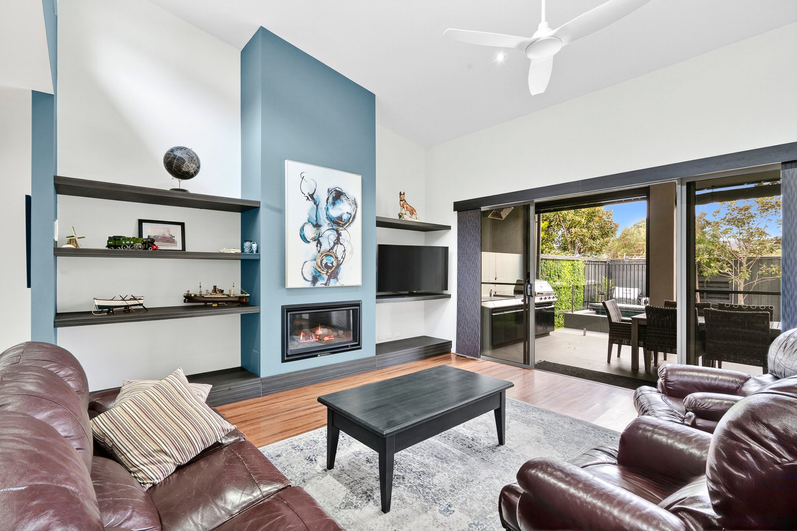 Set behind flourishing gardens, the contemporary façade introduces the sophisticated theme of the home. Inside, beautiful bamboo flooring, light interiors and square set ceilings showcase the refined style within. Designed for effortless indoor-outdoor living, the main living area is positioned at the rear of the home. The elegant kitchen features stone benchtops, quality appliances including 900mm oven, 900mm gas cooktop, dishwasher, contemporary pendant lighting, dual appliance cupboards, sleek modern cabinetry, and endless storage including a butler’s pantry with a second sink. The adjoining dining and living area features vaulted ceilings and north facing highlight windows, enhancing the sense of light and space within. A gas log fire creates a cosy ambience, framed by custom shelving adding both style and function. Glass sliders open up to extend the living zone into the undercover alfresco, creating a stunning layout for entertaining.