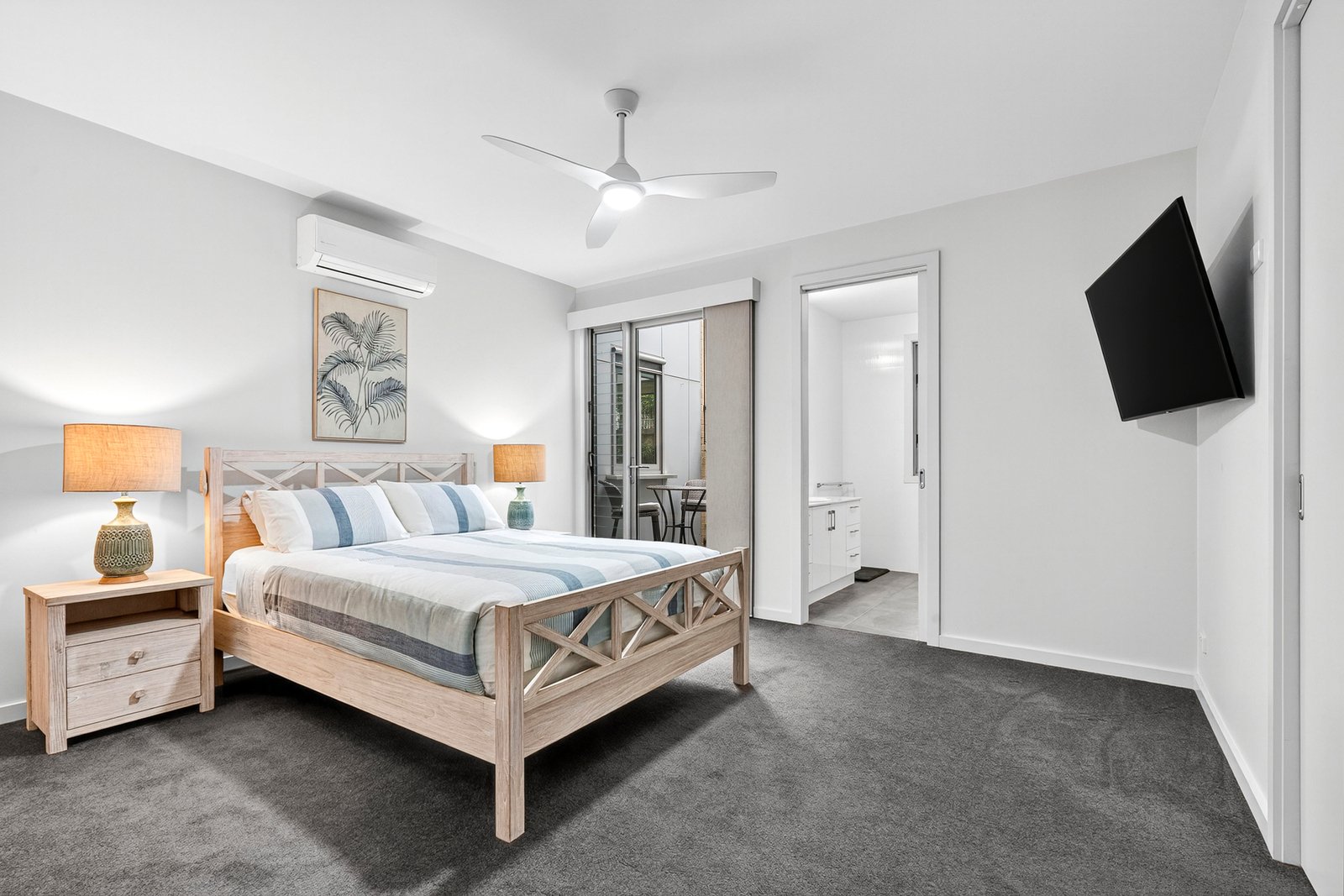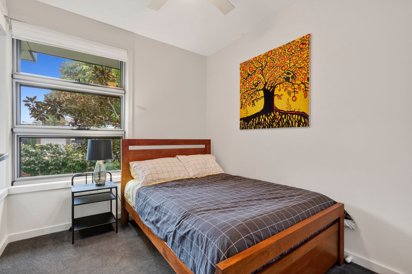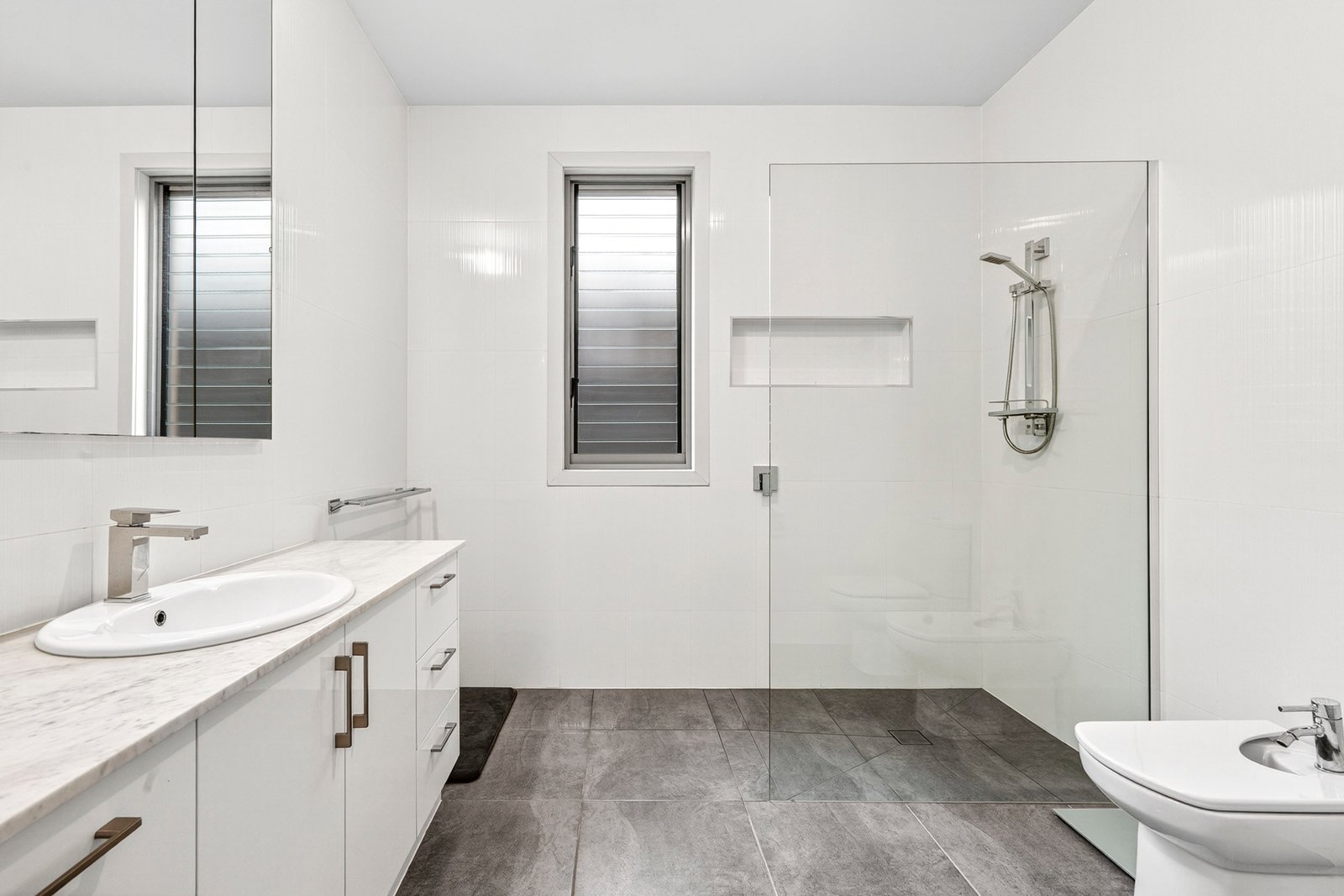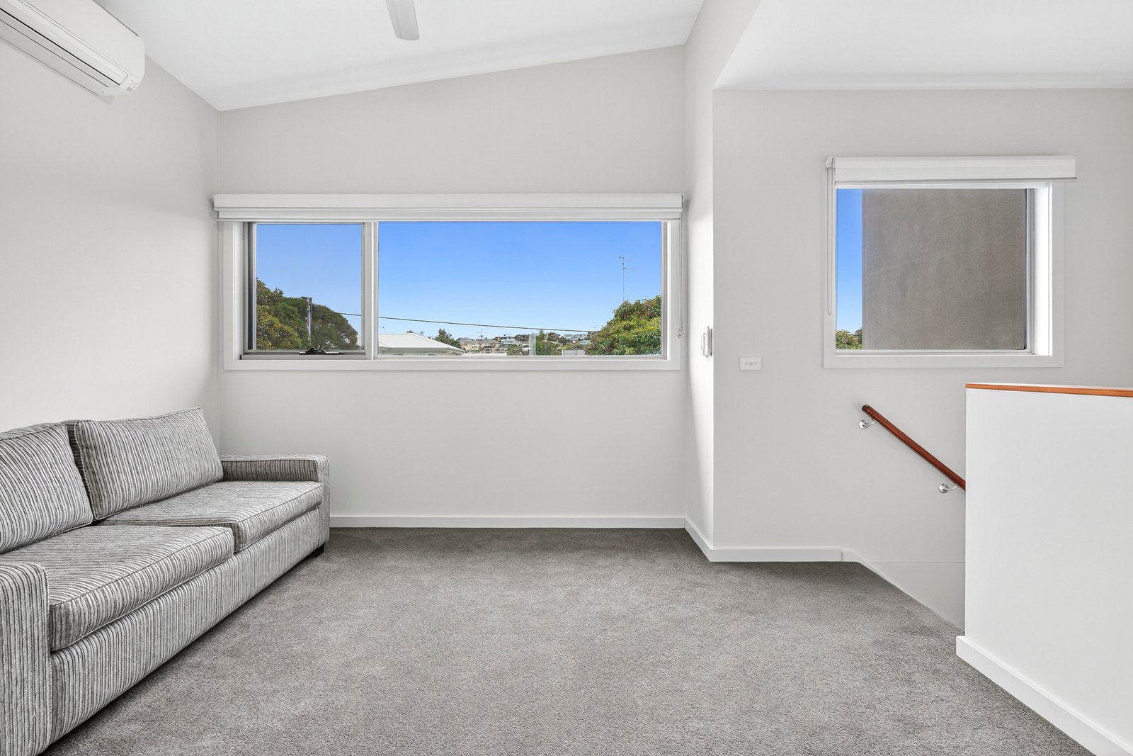 The ground floor main bedroom features direct access to a private deck, walk-in robes, and a tastefully presented ensuite finished in floor to ceiling tiles, with walk-in frameless shower and modern vanity with marble benchtop. Two additional bedrooms are separately zoned upstairs, accompanied by a stylish bathroom, separate wc, and a second living room with a picturesque, elevated outlook. A fourth room off the entry offers a versatile space suitable for a home office or additional bedroom.