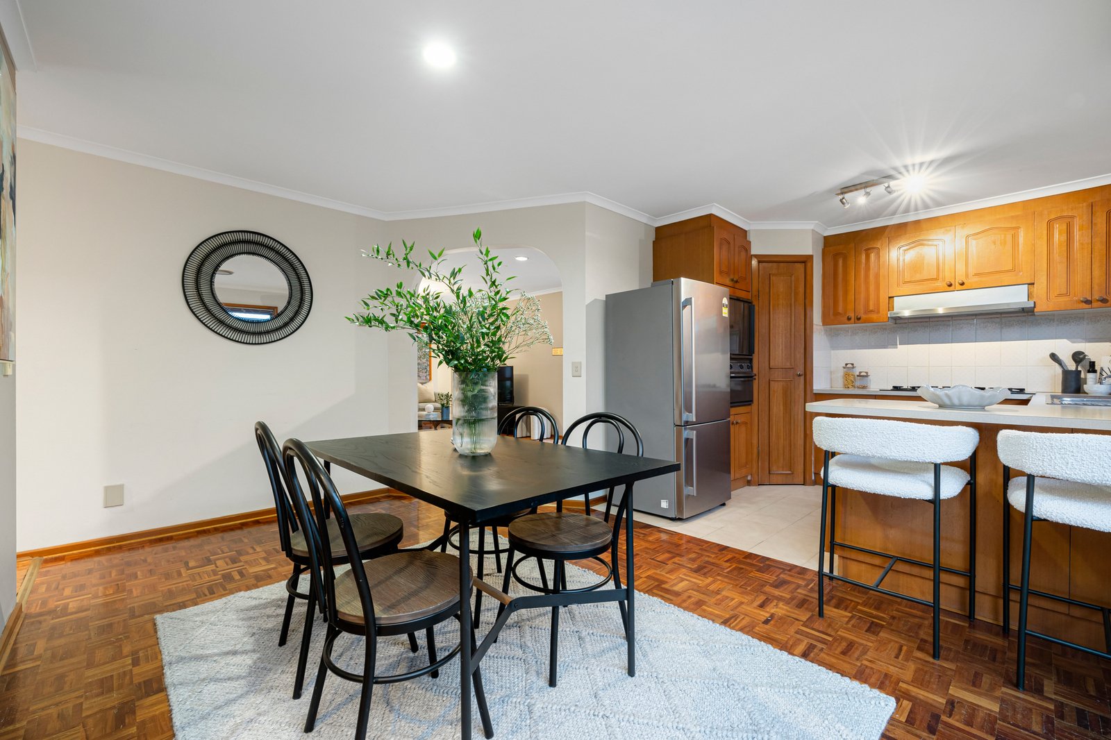 Upon entry, a generous living room stretches wide and looks out to the sunny outdoor area. Parquetry floors star in the separate dining zone that sits alongside a practical timber kitchen offering a very workable footprint - doors here can be opened to let in fresh breezes and allow access to the wraparound yard.