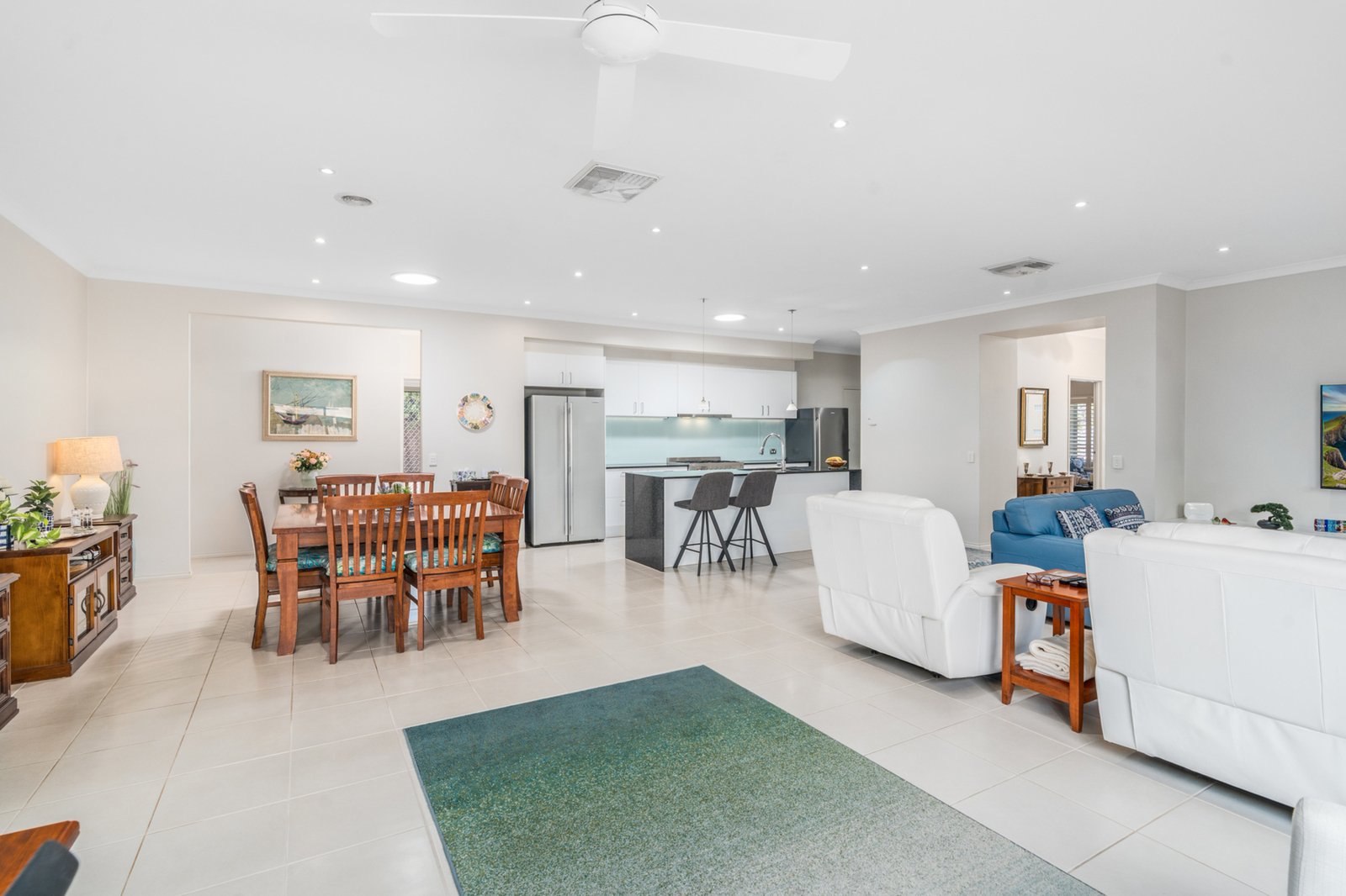 Designed with comfort and practicality in mind, the home offers four generous bedrooms, two bathrooms, a dedicated study offers versatility, easily converting to a 5th bedroom if required and two expansive living areas – perfect for growing families or those working from home. The kitchen is the heart of the home, with a 900mm stainless steel freestanding oven, matching rangehood, dishwasher, walk-in pantry and stone benches for effortless meal preparation and entertaining. Year-round comfort is assured with gas ducted heating, evaporative cooling and ceiling fans throughout.