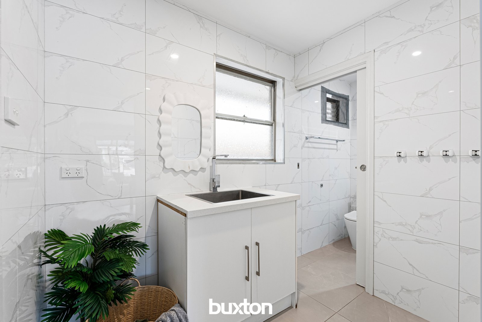 Accommodation comprises four generous bedrooms, three with built-in robes, all serviced by two stylishly updated bathrooms featuring marble-look floor-to-ceiling tiles, frameless showers, and stone vanities. The second bathroom conveniently integrates laundry facilities.