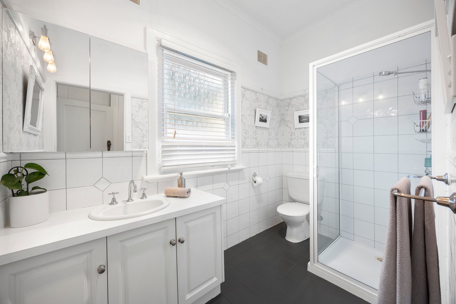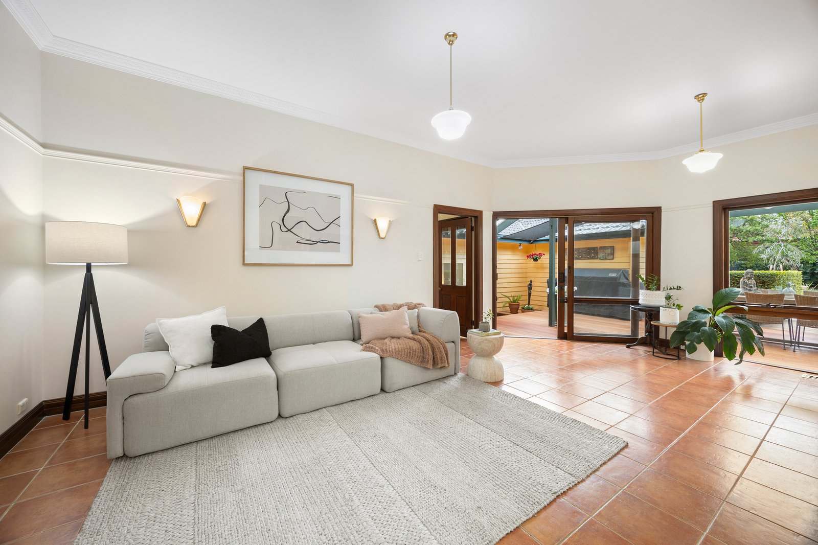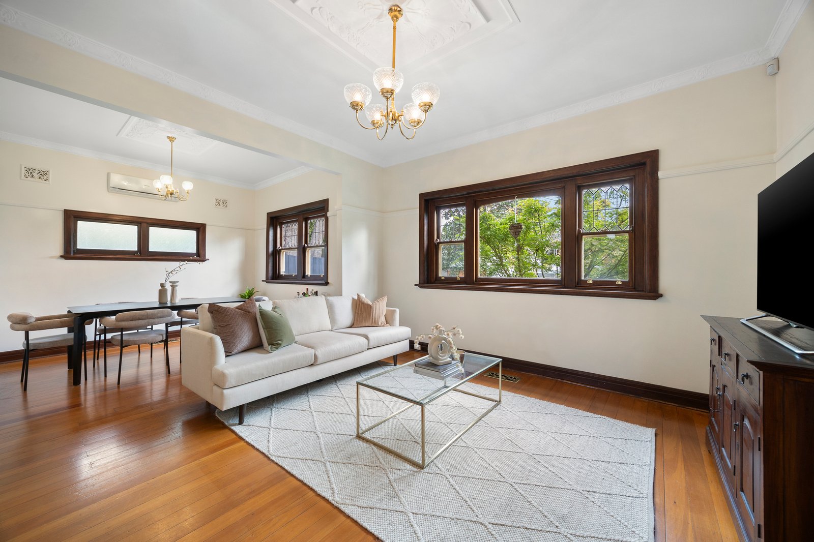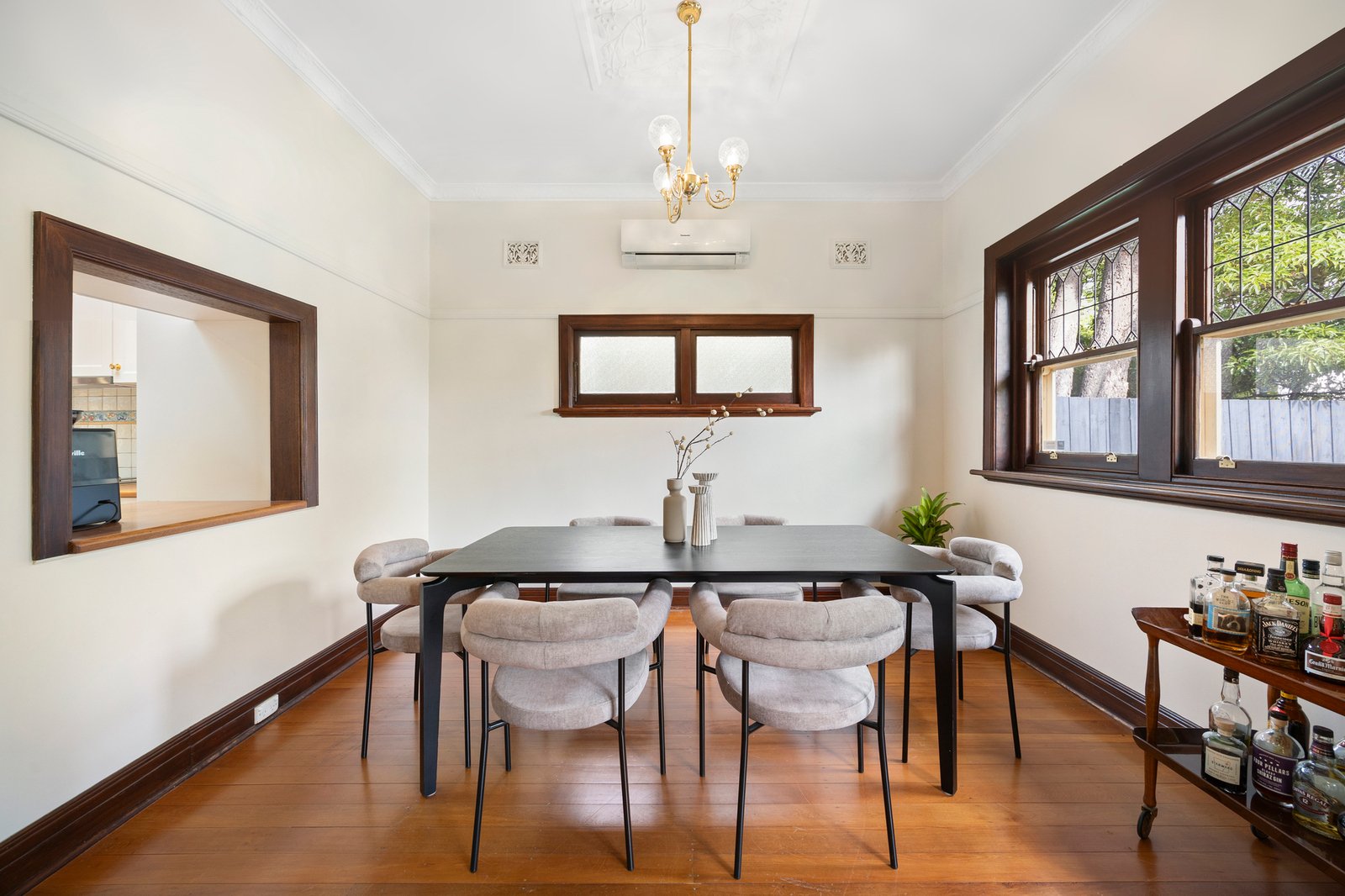 A covered porch and skylit hallway introduce interiors defined by Art Deco craftsmanship, where high ceilings, warm timber floors, dark-stained timber surrounds, decorative ceiling roses and exquisite leadlight windows create a tranquil atmosphere.