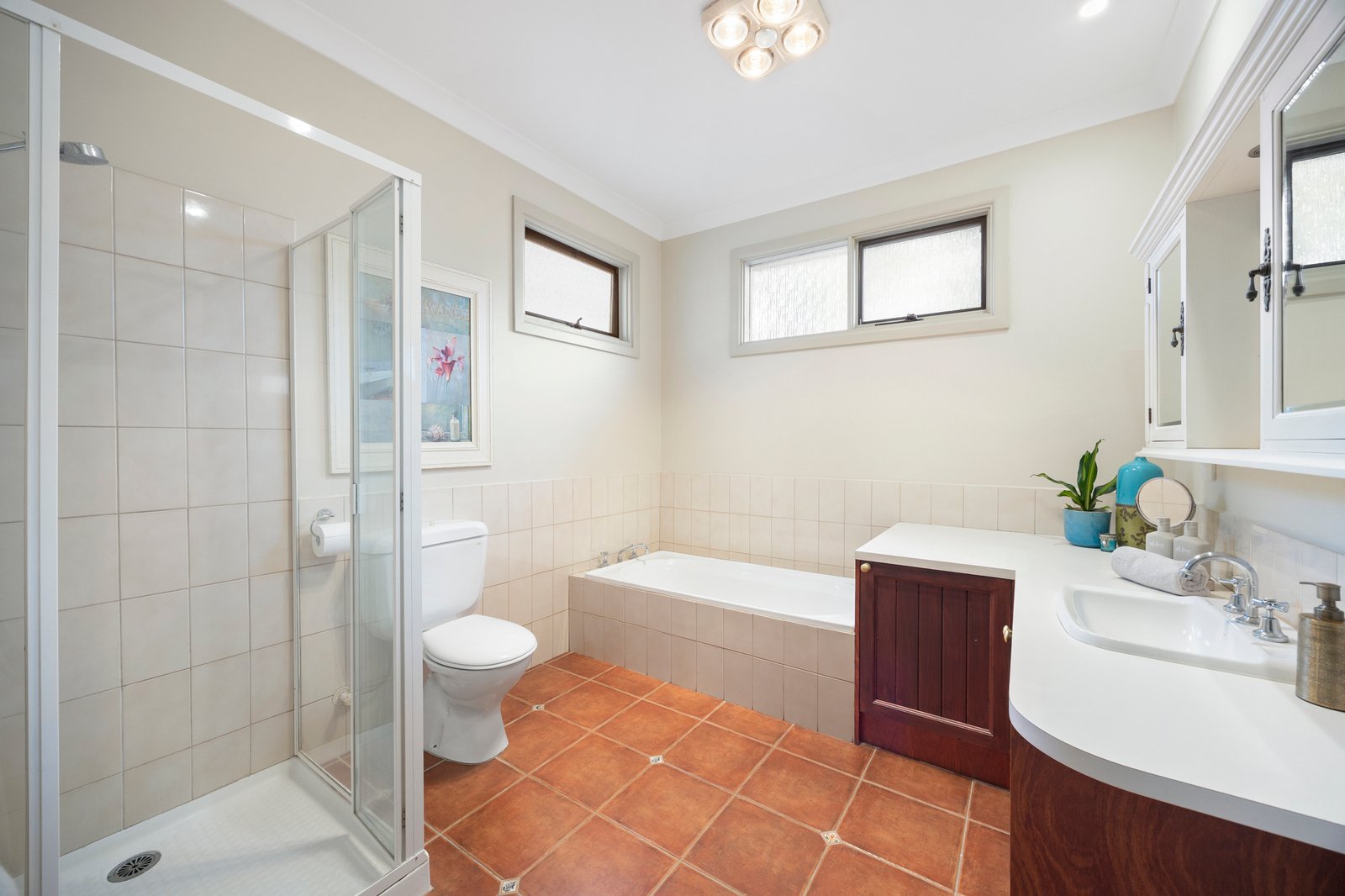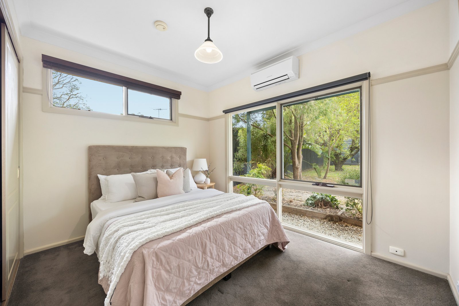 Modern comforts include ducted heating, split systems throughout, a separate WC, sizeable laundry with a drying cupboard, and off-street parking for two cars.