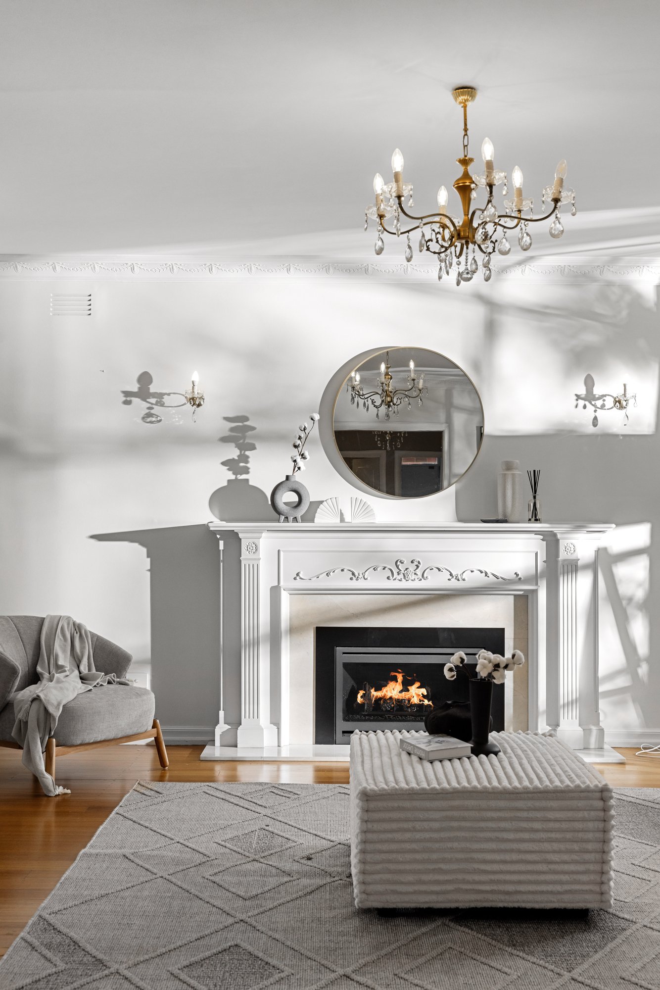 The light-filled interior welcomes with a refined formal lounge and dining area, anchored by an ornate gas fireplace and rich timber flooring that exude sophistication and comfort. The adjoining family room and meals area provide a relaxed space for everyday living, seamlessly connecting to the bright kitchen with its charming garden outlook — the perfect setting for family gatherings and entertaining.
