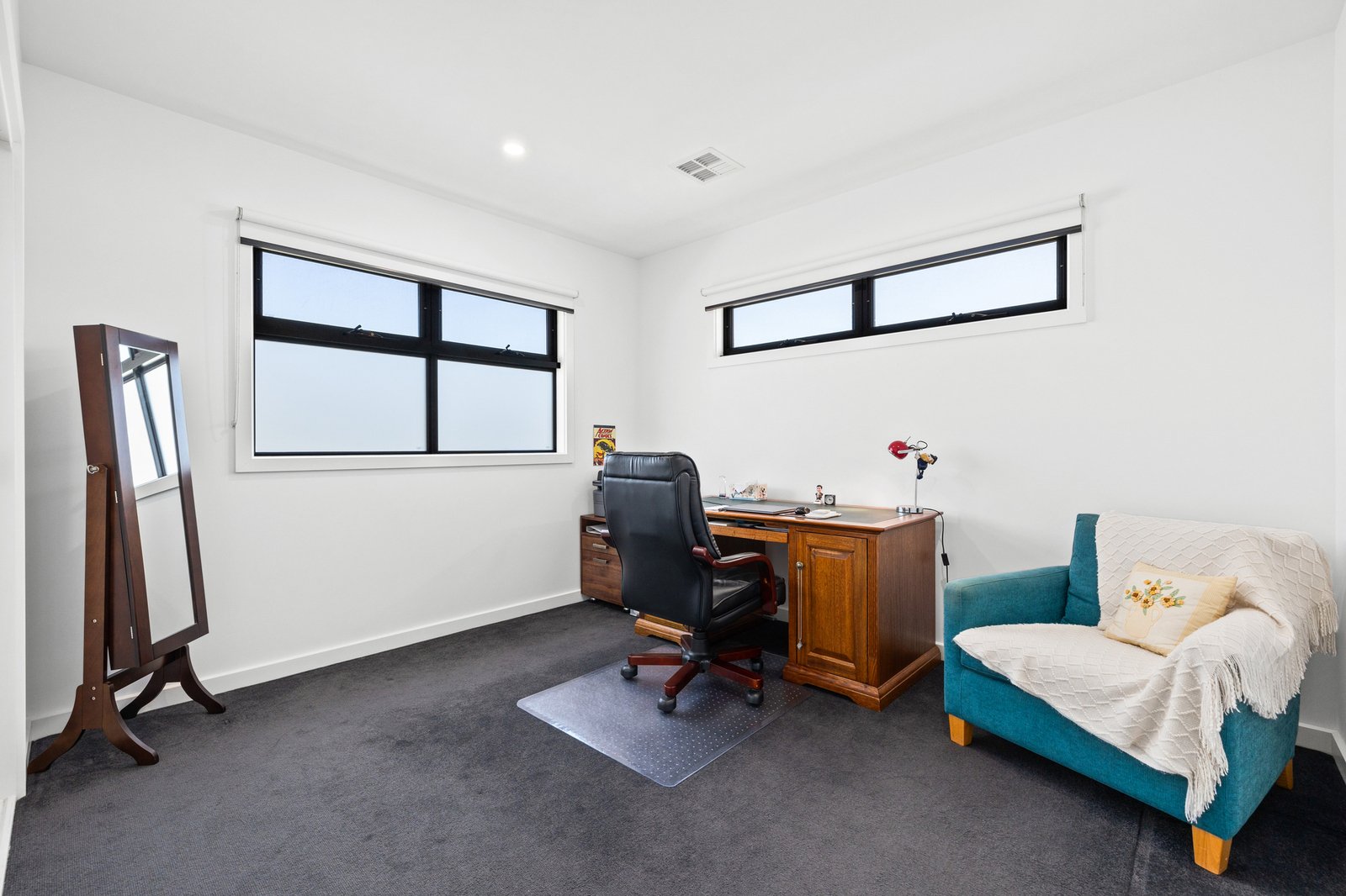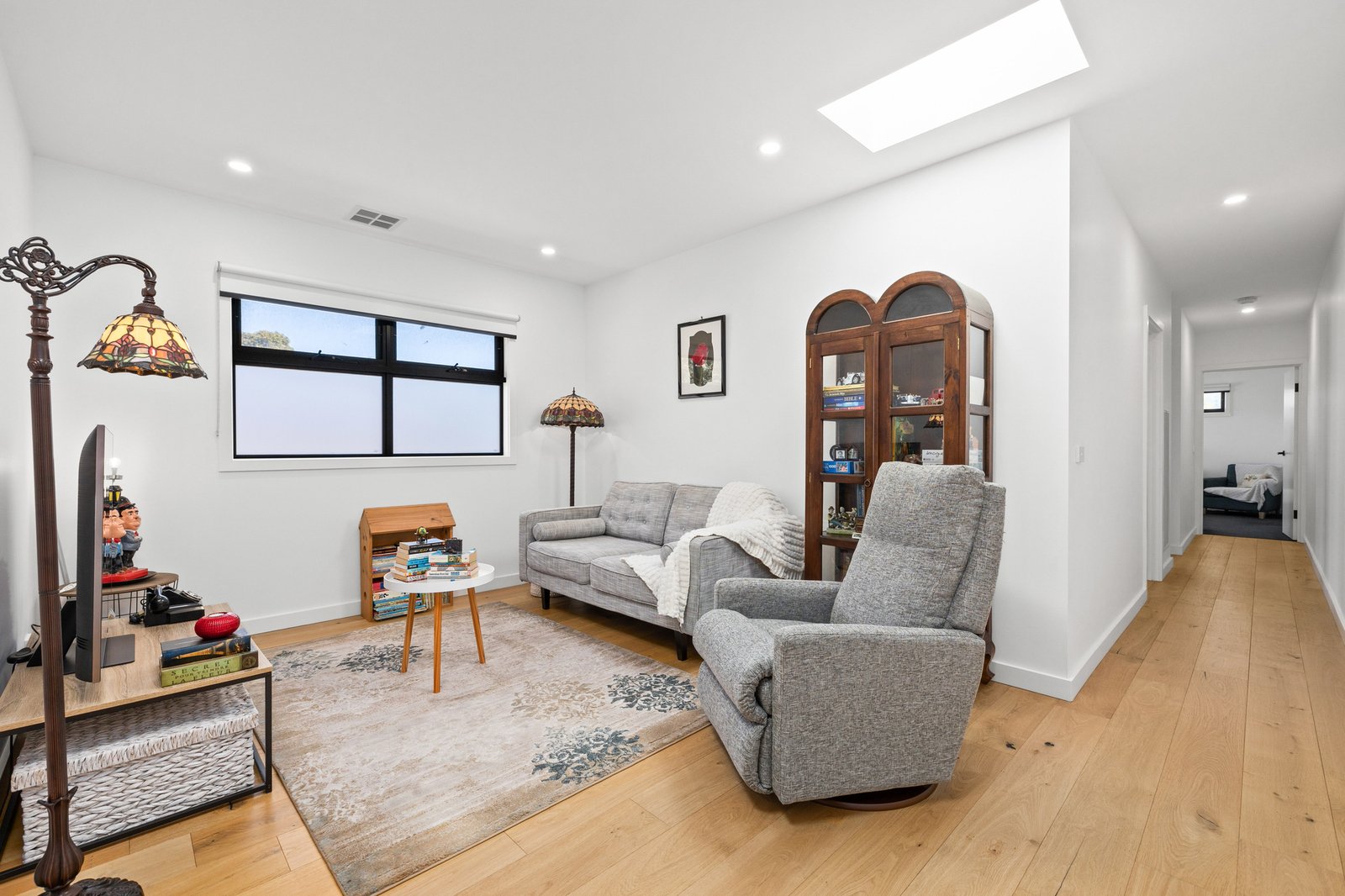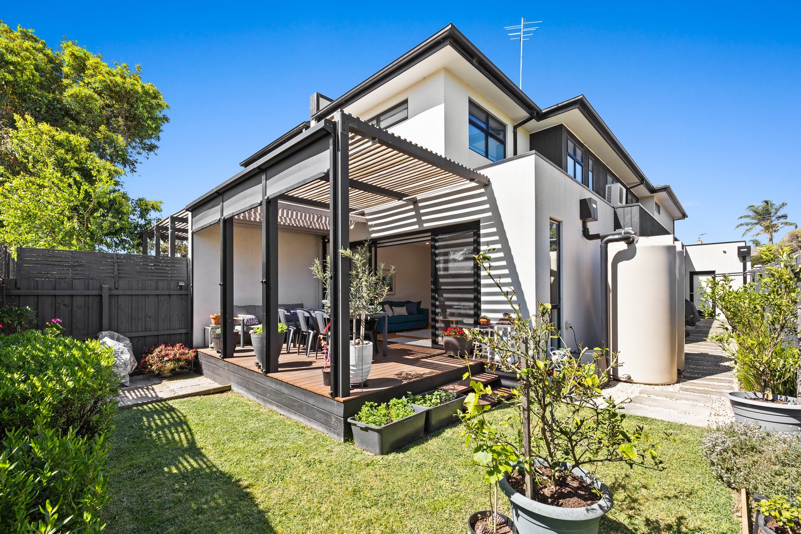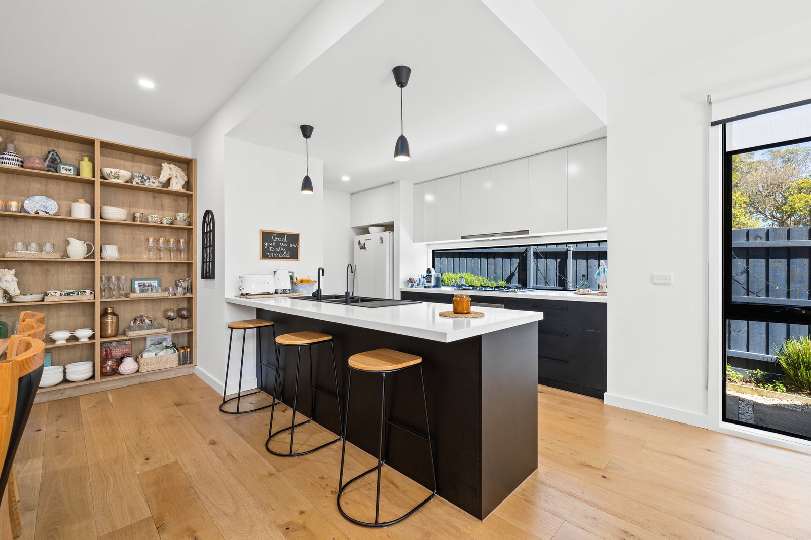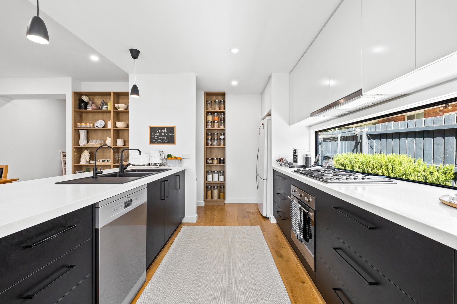 Architectural and family-functional, with a clever open pantry and a smart window-splashback for the Smeg appliance kitchen, glossy polished-porcelain ensuites for each master, and soaring skylights for first-floor living, this climate-controlled home stars the latest bold black tapware and hardware, the widest-board Oak floors, and the sleekest stone benchtops on the slickest Emporite cabinetry! Even the al fresco area has an architectural edge with a slatted pergola to match the timber-detailed façade!