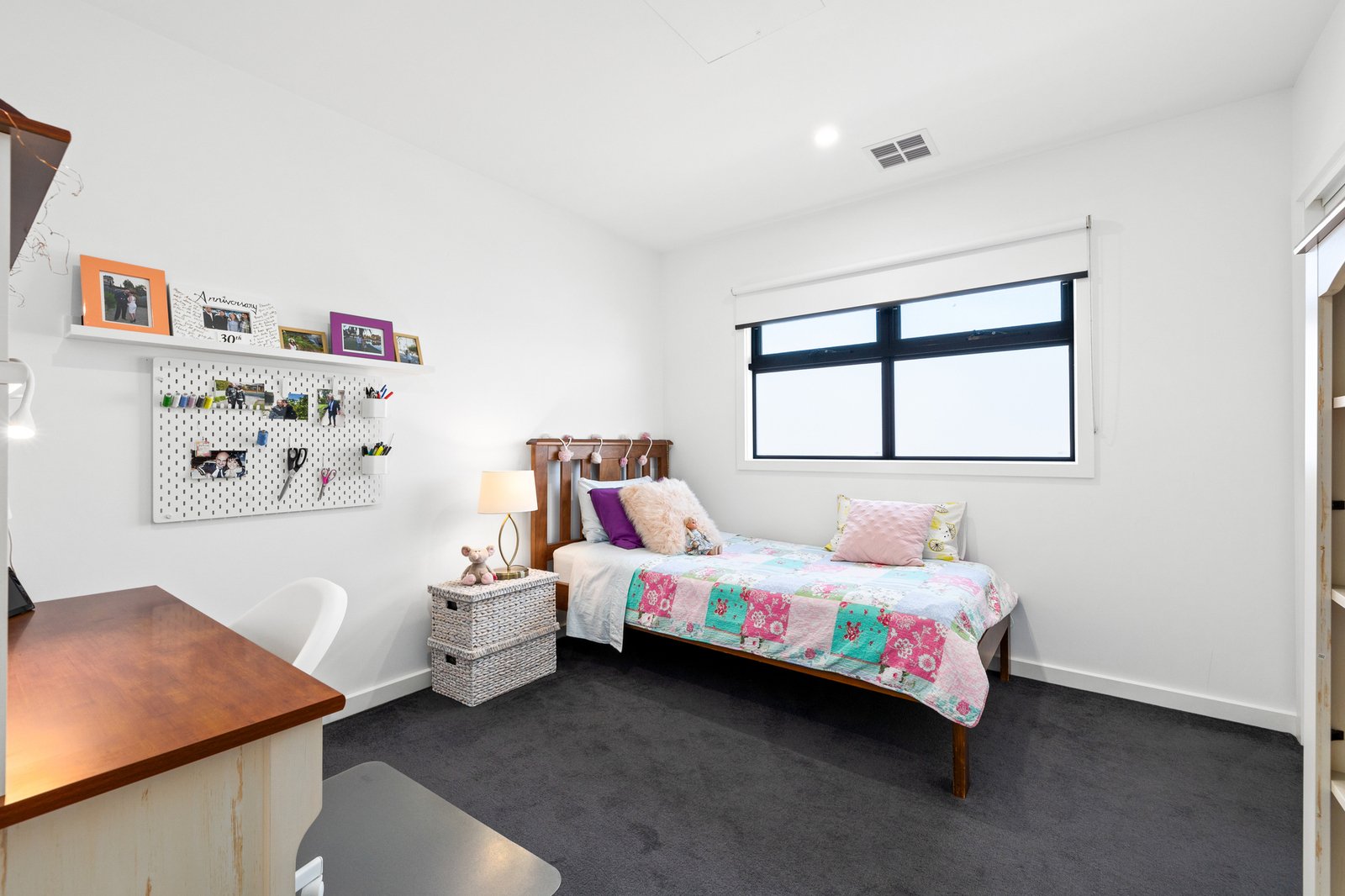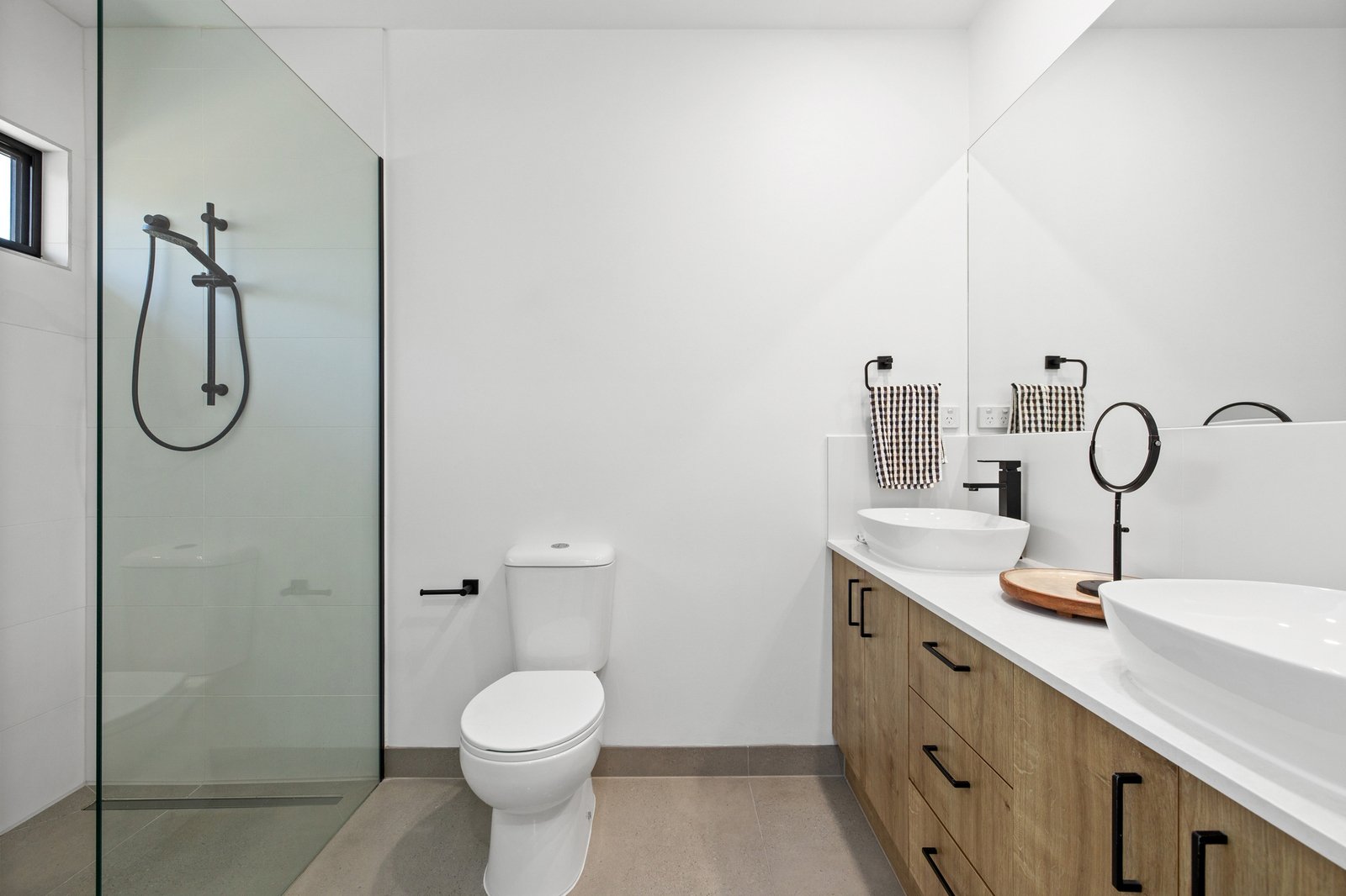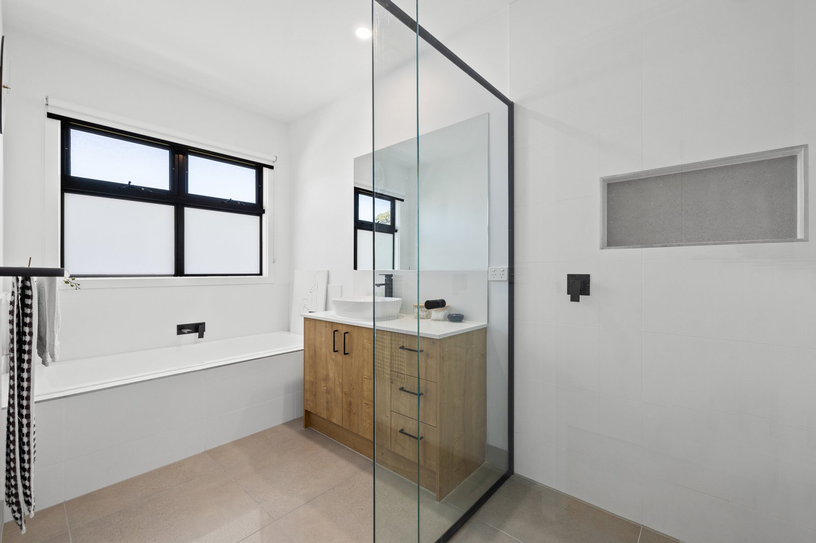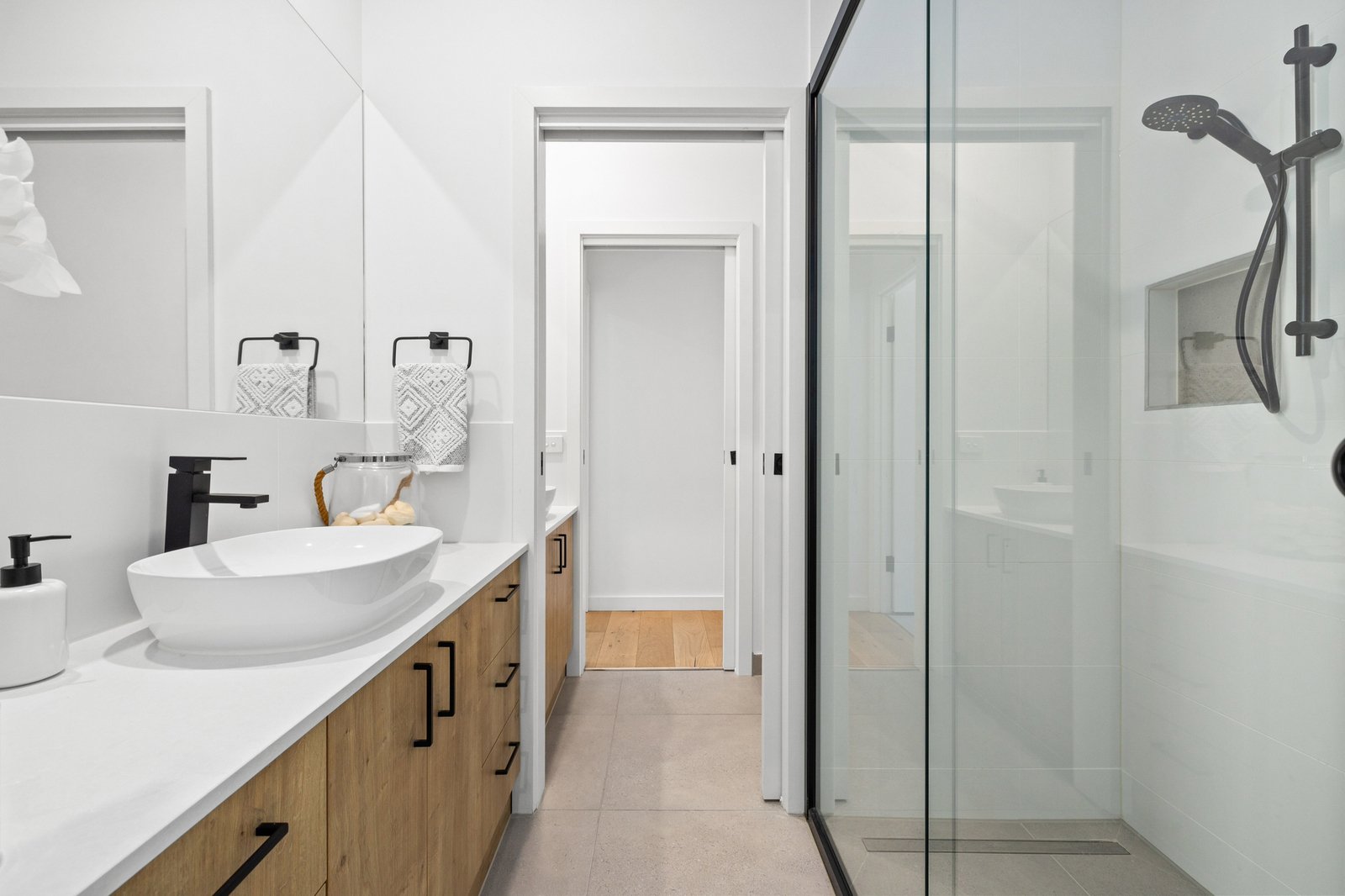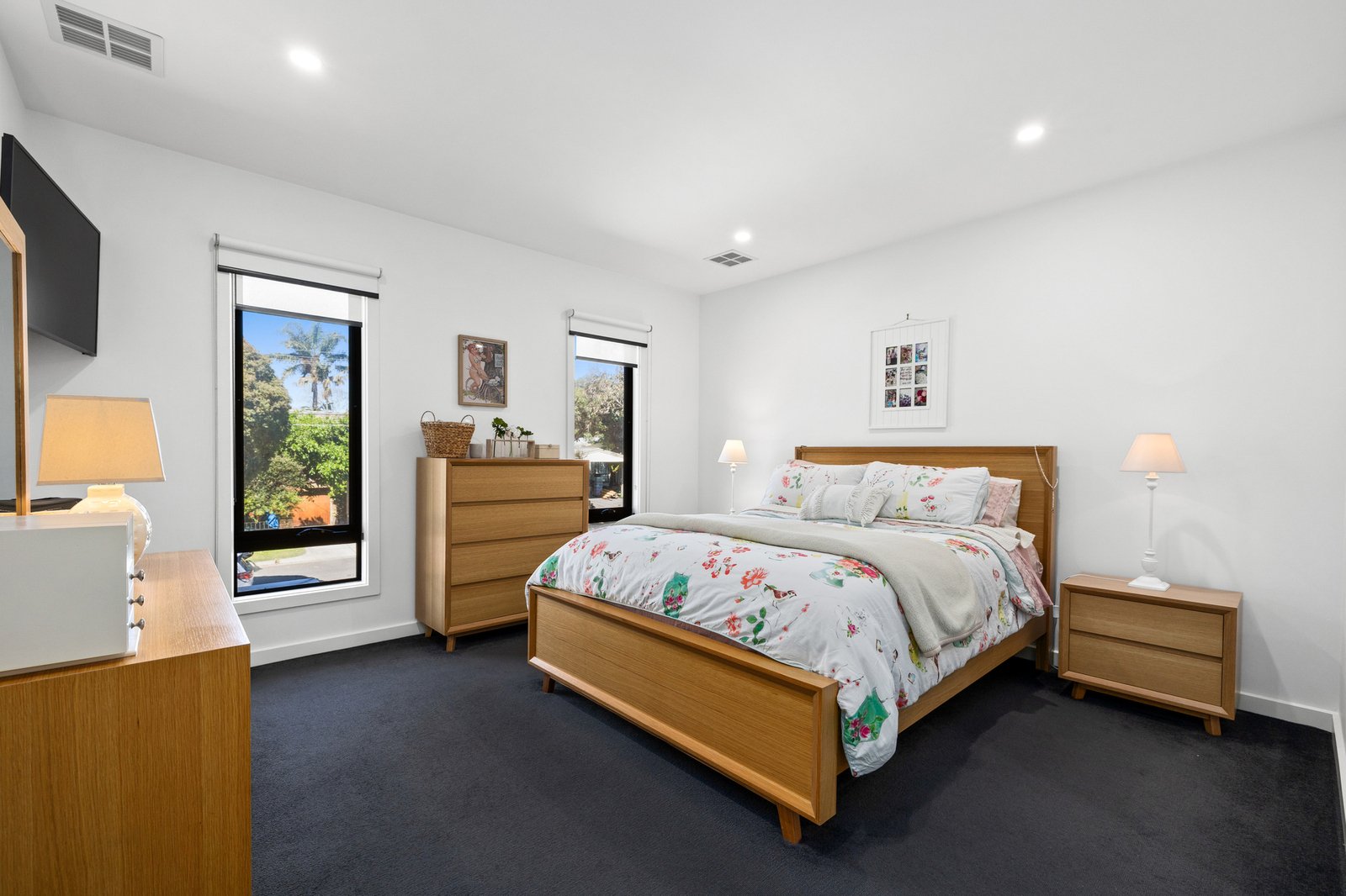Architectural and family-functional, with a clever open pantry and a smart window-splashback for the Smeg appliance kitchen, glossy polished-porcelain ensuites for each master, and soaring skylights for first-floor living, this climate-controlled home stars the latest bold black tapware and hardware, the widest-board Oak floors, and the sleekest stone benchtops on the slickest Emporite cabinetry! Even the al fresco area has an architectural edge with a slatted pergola to match the timber-detailed façade!