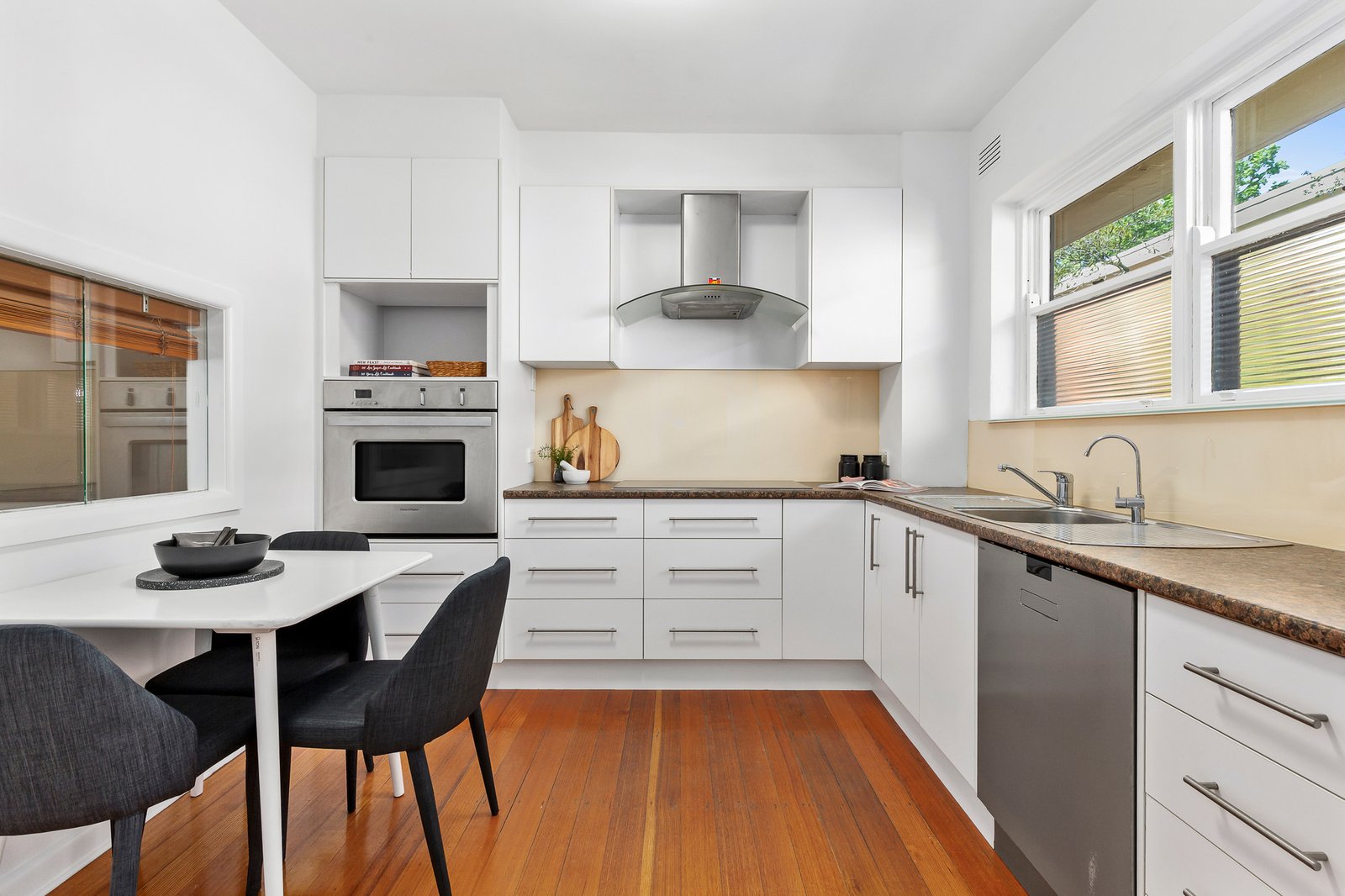 The spacious lounge features premium double-glazed windows and balcony doors, custom cabinetry with integrated heater, and a gas log fire flued to the outside—providing outstanding warmth and efficiency. Reverse-cycle air conditioning and a handy servery hatch make the space ideal for both relaxation and entertaining.