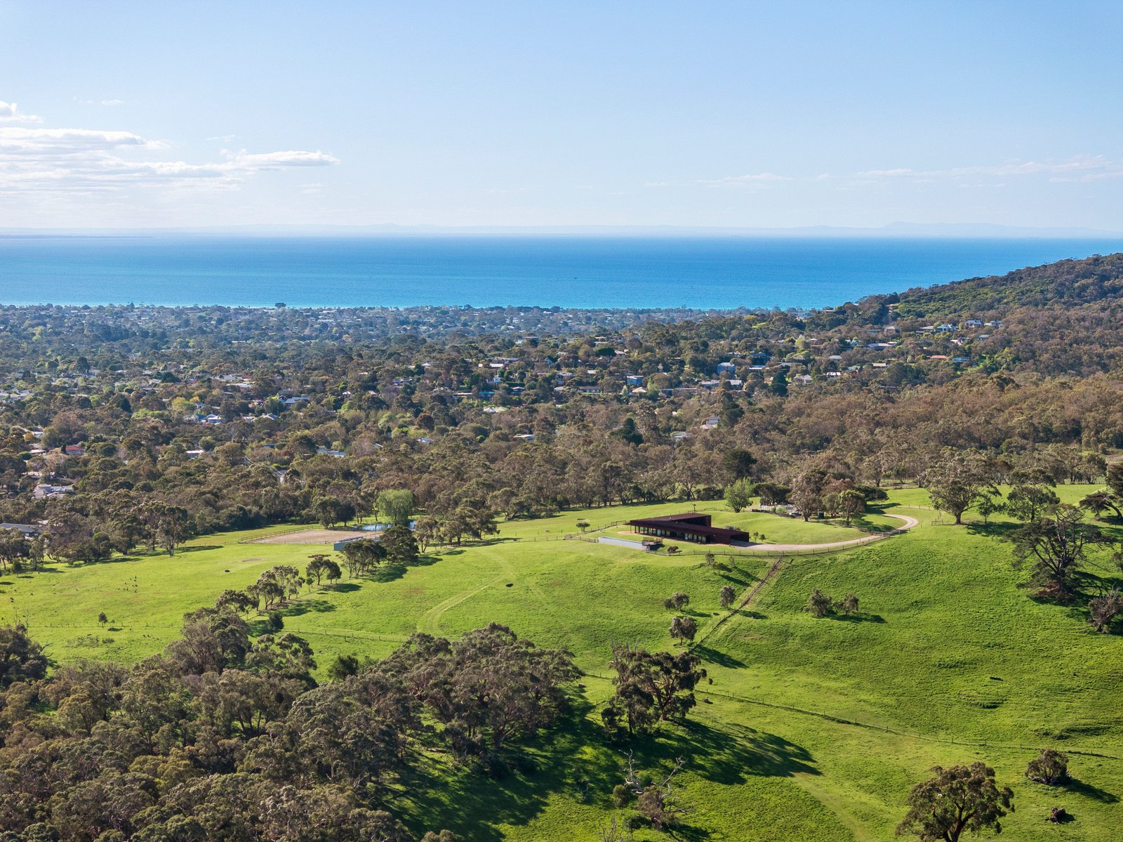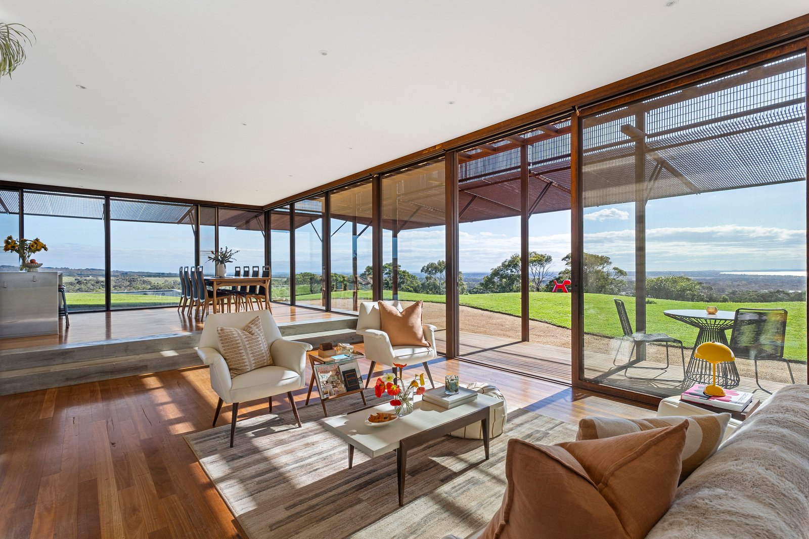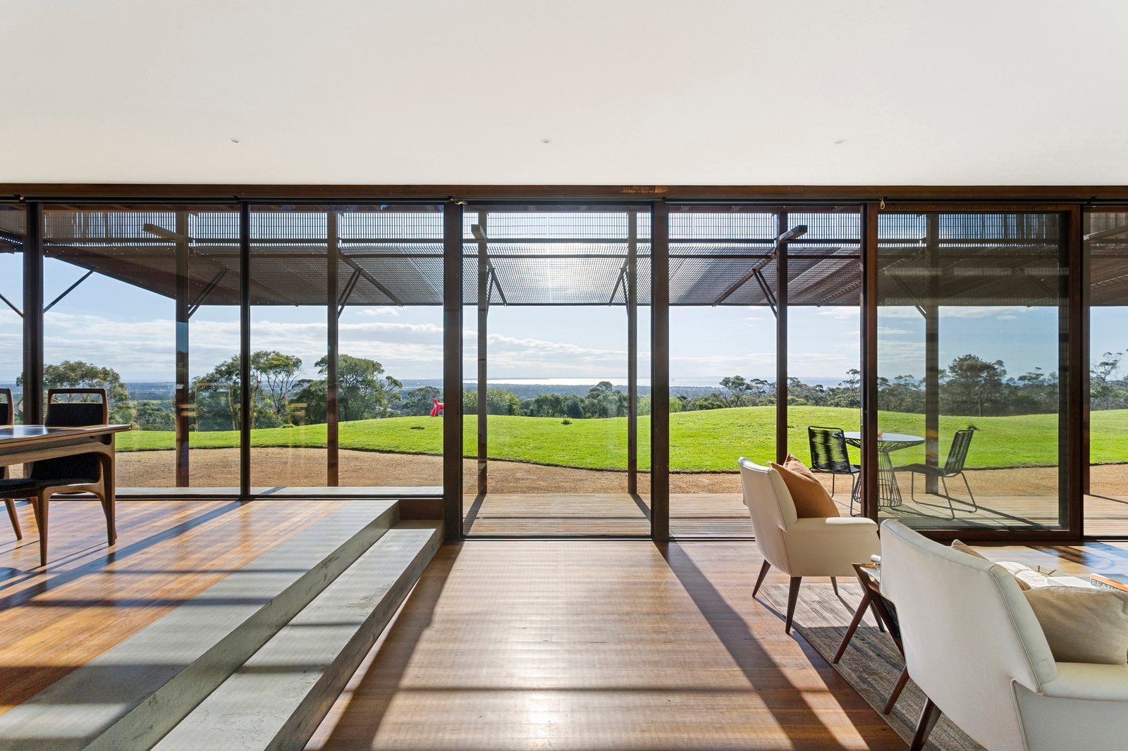 Born from a dialogue of architectural ingenuity and a deep respect for the land, ‘Tanderra’ by Sean Godsell is deeply attuned to the undulating topography of 46.4 acres (approx), its hillside position rising 120 metres above sea level to reveal uninterrupted panoramas over Main Ridge, the surrounding hinterland and outward to Bass Strait and Port Phillip Bay, across to the Otways and the Bellarine Peninsula.