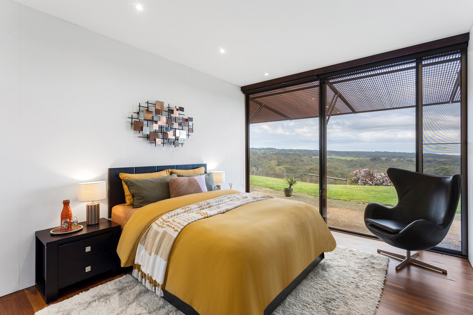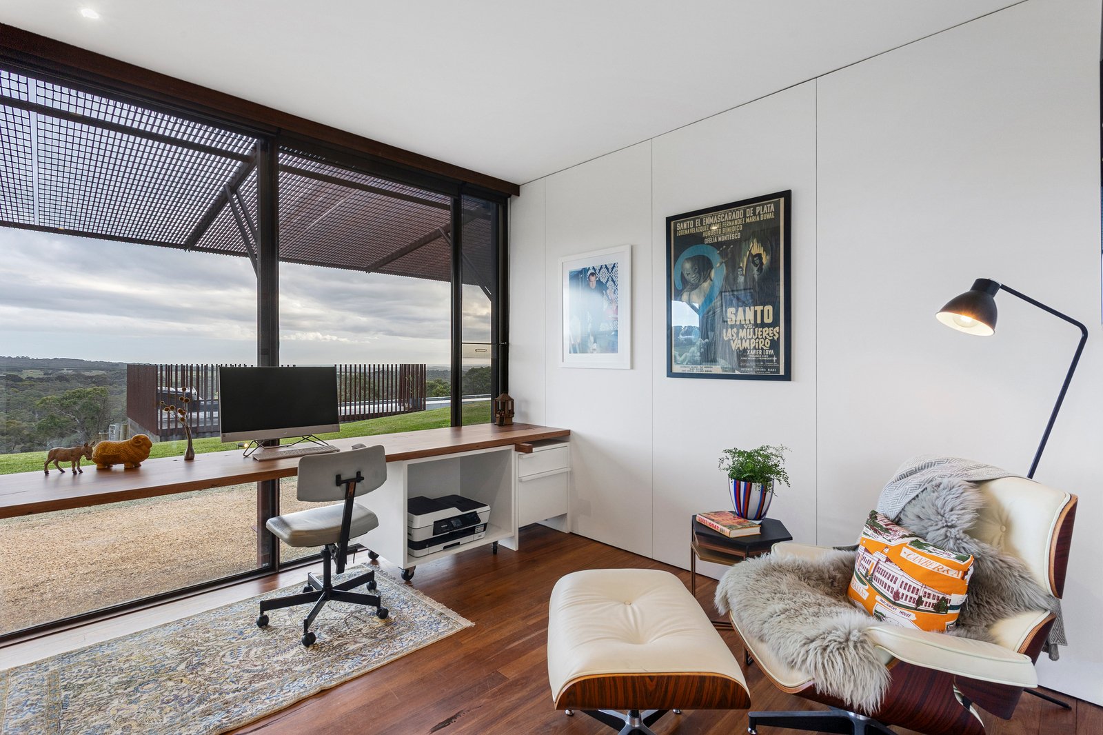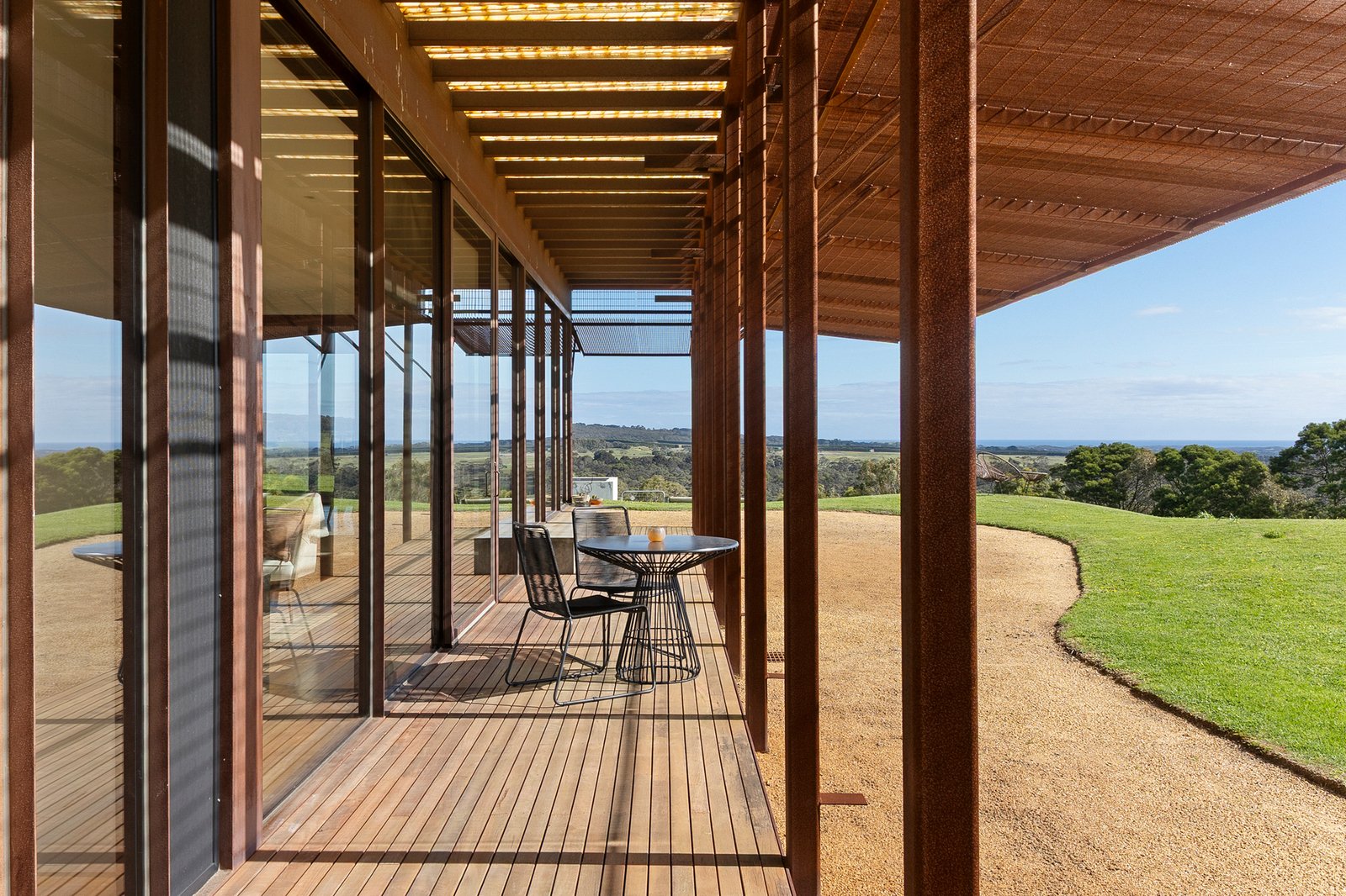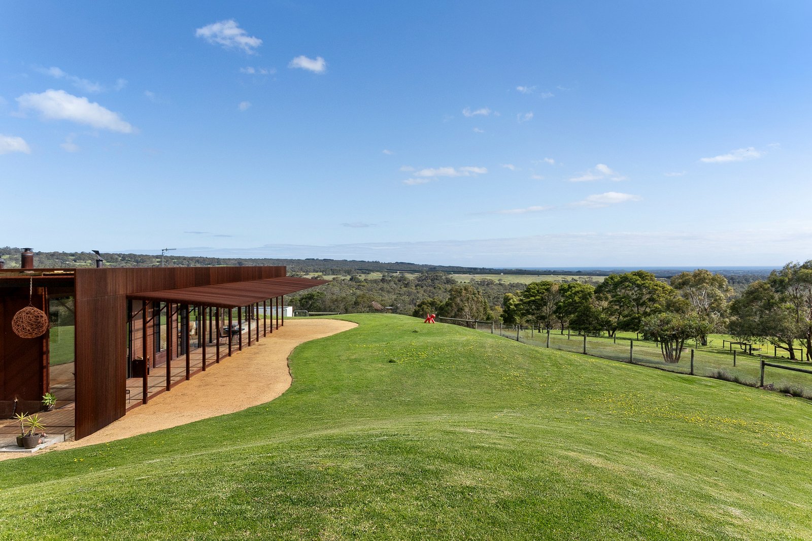 Born from a dialogue of architectural ingenuity and a deep respect for the land, ‘Tanderra’ by Sean Godsell is deeply attuned to the undulating topography of 46.4 acres (approx), its hillside position rising 120 metres above sea level to reveal uninterrupted panoramas over Main Ridge, the surrounding hinterland and outward to Bass Strait and Port Phillip Bay, across to the Otways and the Bellarine Peninsula.