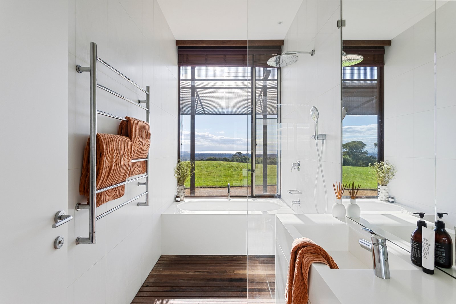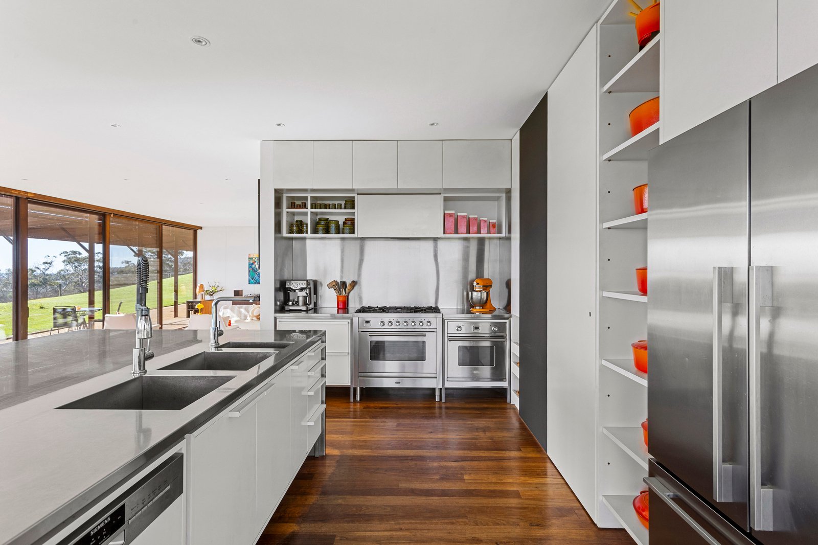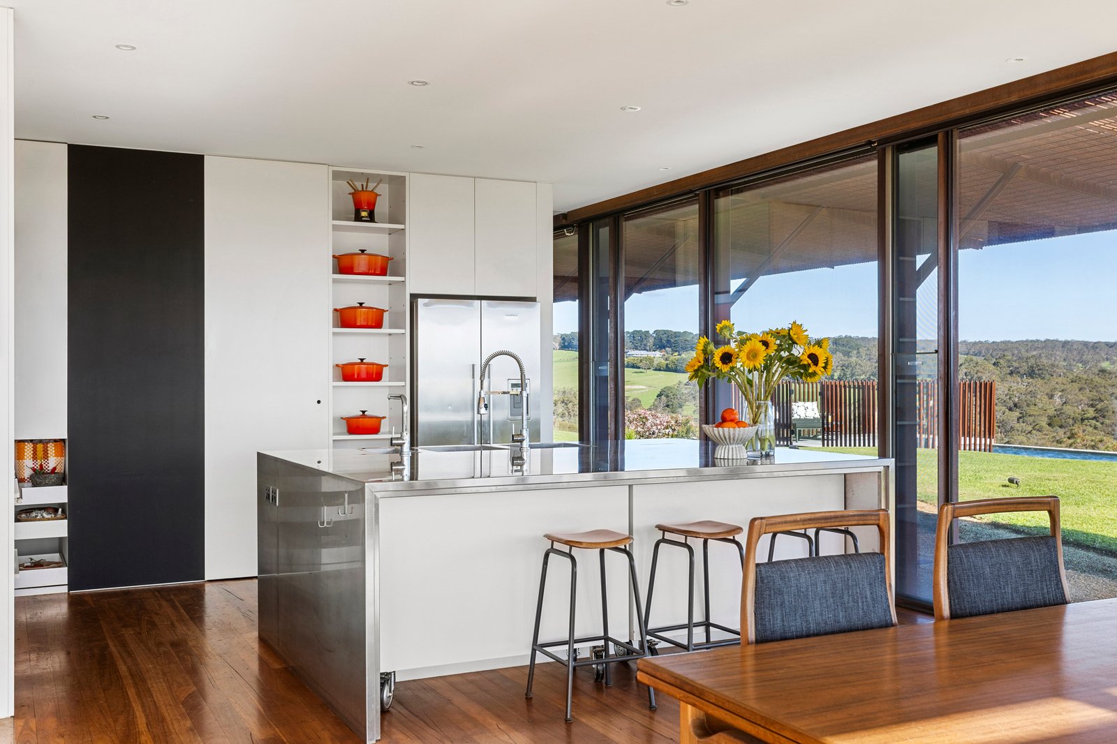 Solid and screened expressions of corten steel form the outer skin, its unobtrusive presence allowing a restrained interior palette of recycled Blackbutt and sculptural glazing to prevail, with sight lines woven as a consistent thread in the design narrative. At its social centre, a professional-grade kitchen is appointed with twin ILVE ovens, a gas cooktop and built-in pantry, overlooking a trilogy of water views: the 18-metre pool, dam and ocean, while a sheltered courtyard and terrace with bespoke Parrilla grill offer entertaining spaces that are well-adapted to the seasons.