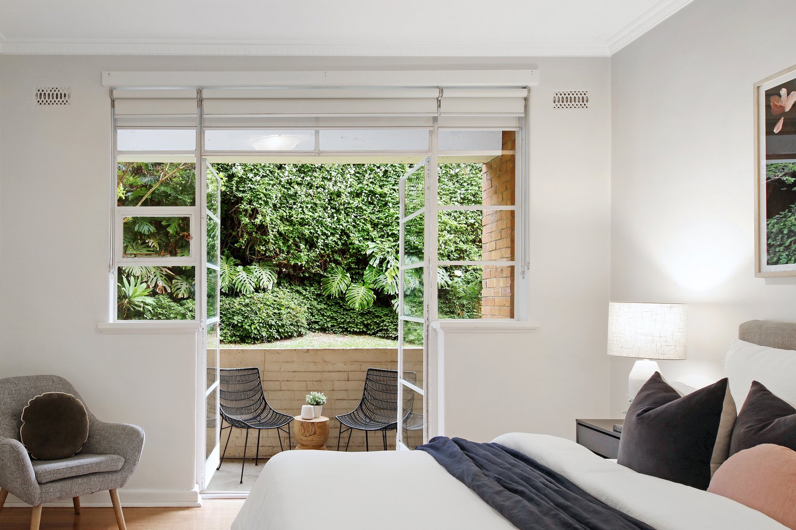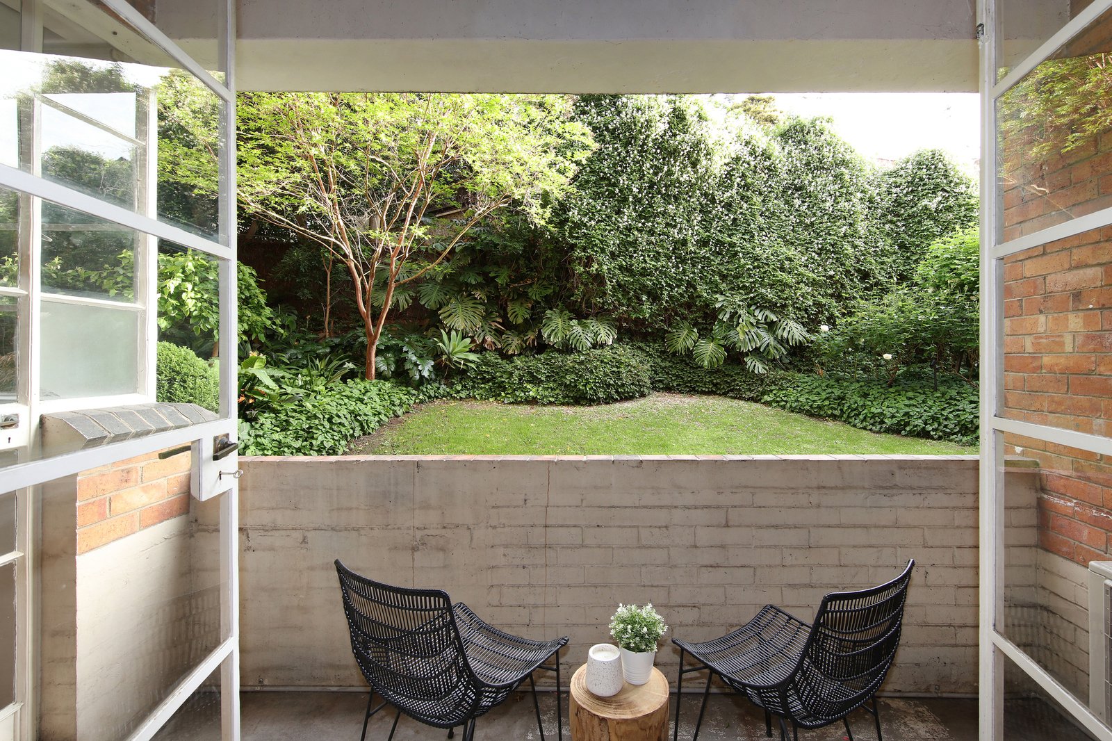 Sited for garden outlooks and gentle light with wide steel windows and tall French doors wrapping a central balcony-terrace, this grand single-bedroom residence is scaled to a spectacular size with gracious garden-view living and the super-spacious bedroom.