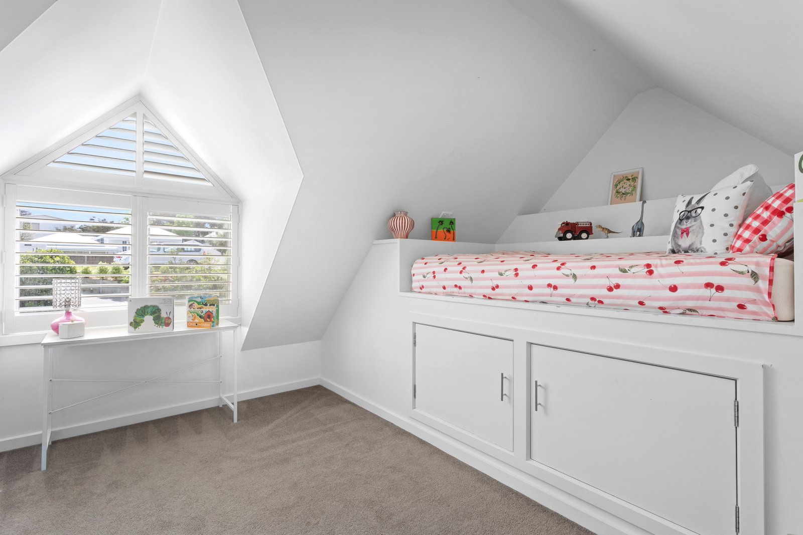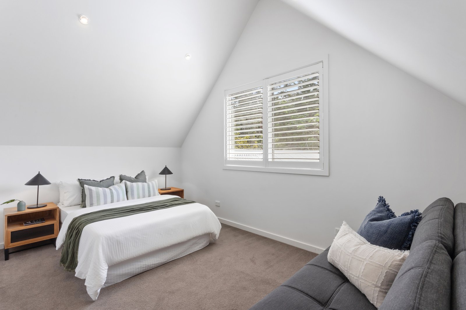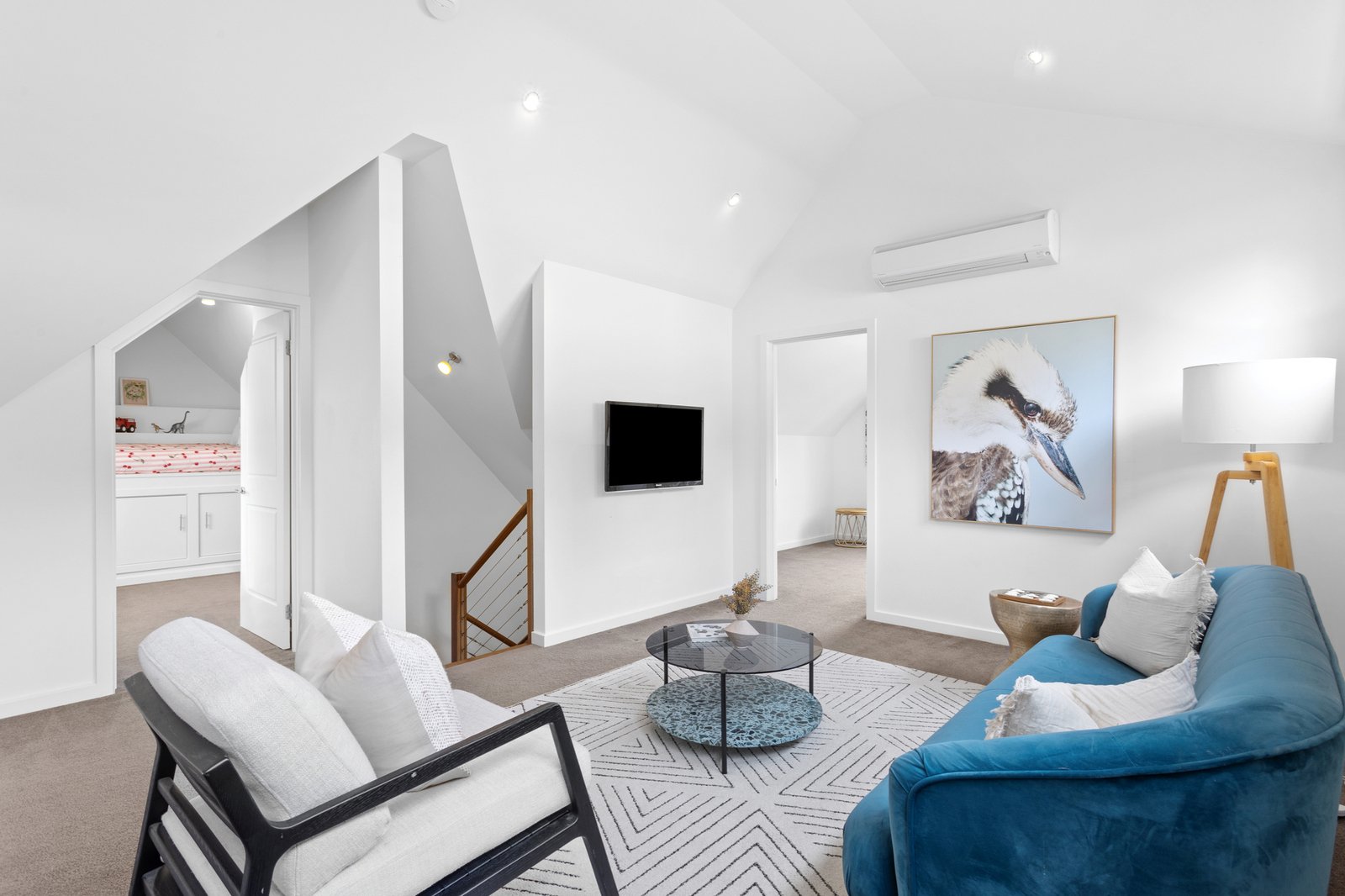 The generous open-plan living area forms the social hub on the ground floor, with a designer kitchen featuring a butler’s pantry, sleek white stone surfaces and café-style bi-folds for al-fresco entertaining. The outdoor living zone extends to the garden, with a gas fireplace and plantation shutters ensuring year-round comfort, and low-maintenance lawns inviting games and relaxation well into the afternoons. The main suite, also on the entry level, enjoys a walk-in robe and en-suite, complemented by a second guest bedroom and central bathroom. Upstairs, three further robed bedrooms, a powder room and an additional living area cater to family or guests, creating an adaptable floor plan suited to every season of life.