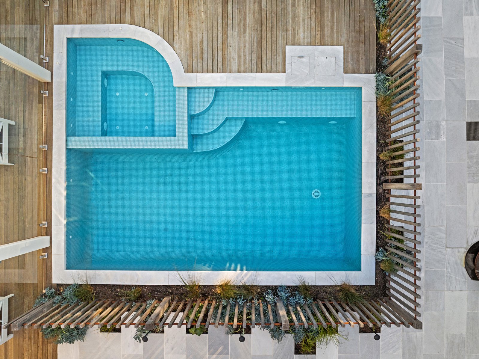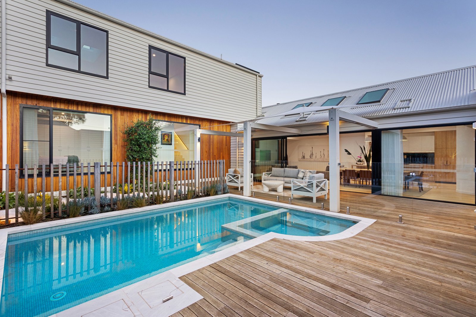 Within newly landscaped surroundings, the calming exterior of Linea board and Silvertop Ash introduces interiors that soar skyward, with high ceilings, skylights that slide away to reveal the sun or stars, and double glazing that draws the eye across an inspired landscape encompassing the pool and spa terrace. A U-shaped layout ensures laughter, meals, and morning coffee naturally gravitate to the central al-fresco domain, warmed by its radiant north-west corner orientation. The open-plan living area features a Stuv wood fire and flows to an epicurean kitchen fitted with V-ZUG appliances, an integrated Fisher & Paykel fridge, Vintec wine storage, and bespoke joinery detailed with stone surfaces.