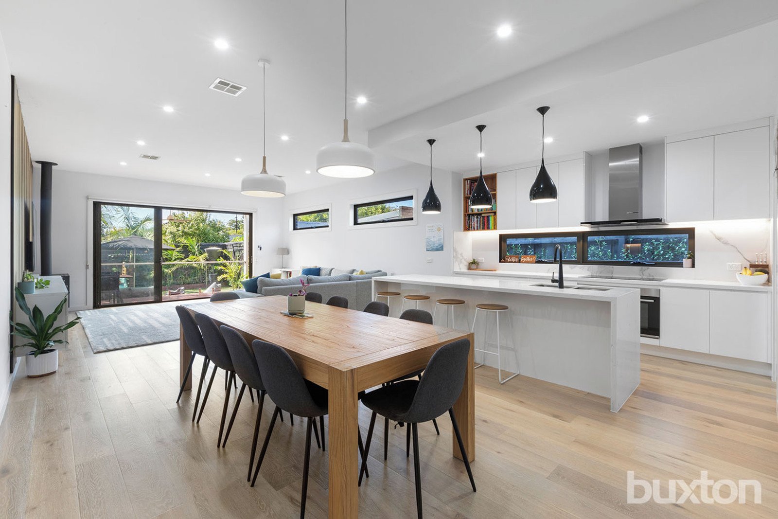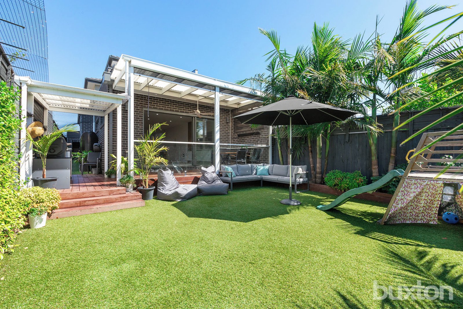 Sliding doors open to an entertainer’s courtyard with covered dining, timber decking, synthetic turf, automated blinds, and an outdoor kitchen with gas BBQ and bar fridge.