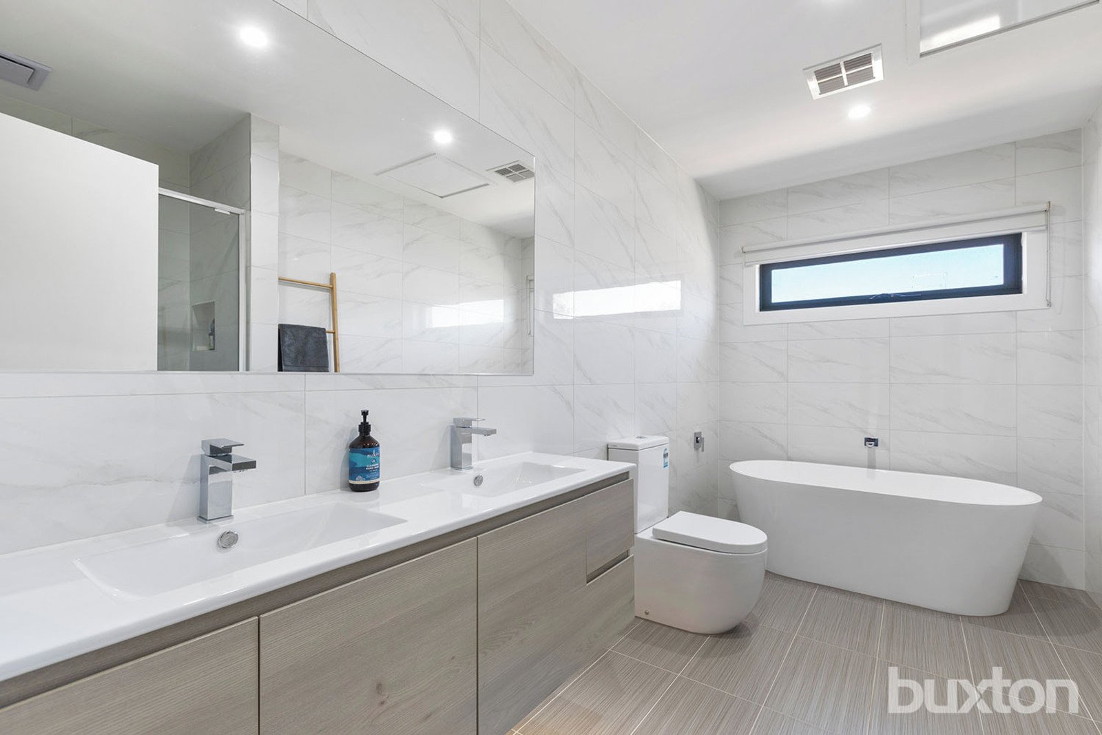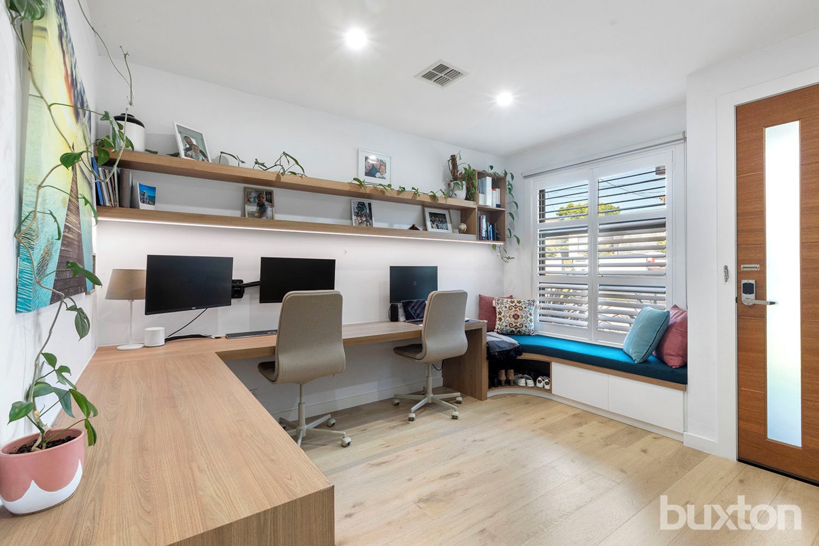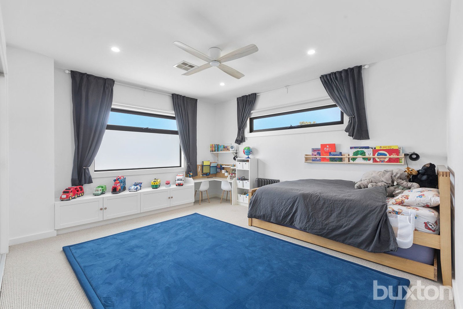Upstairs includes a second living or study zone, a master bedroom with walk-in robe and ensuite, and two large bedrooms with built-in robes. The rear bedroom has a built-in desk and window seat, and the main bathroom offers a double vanity and feature bath.