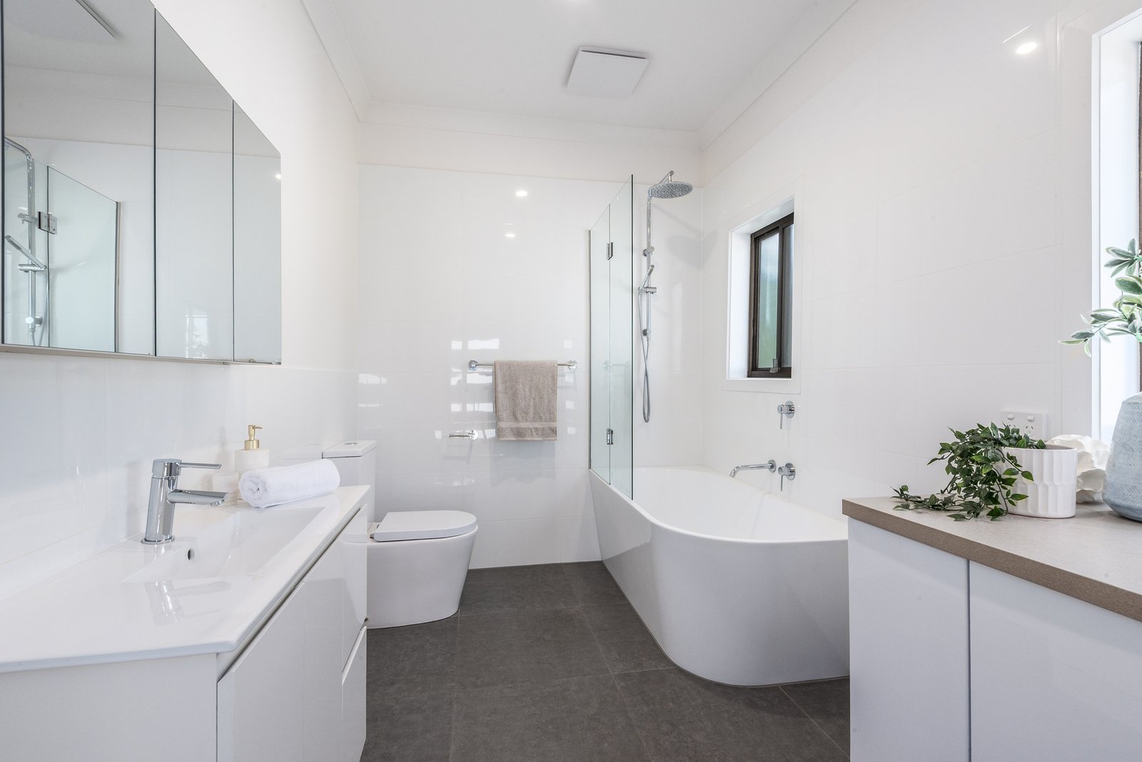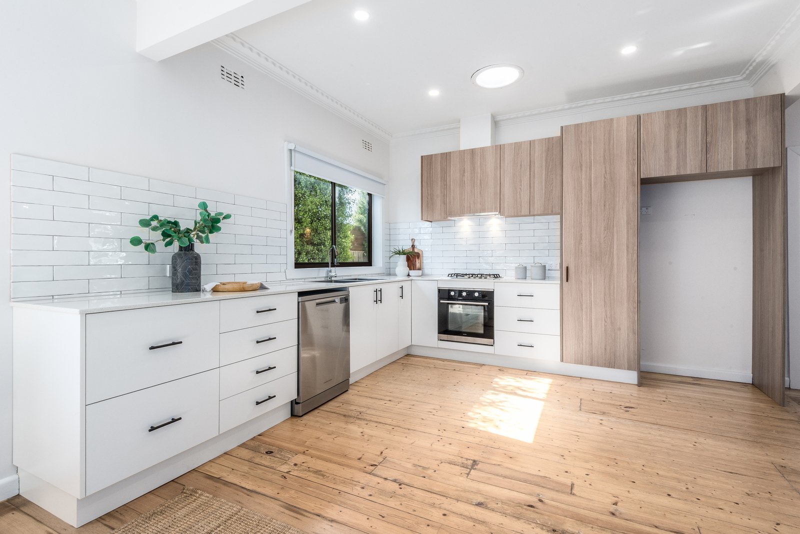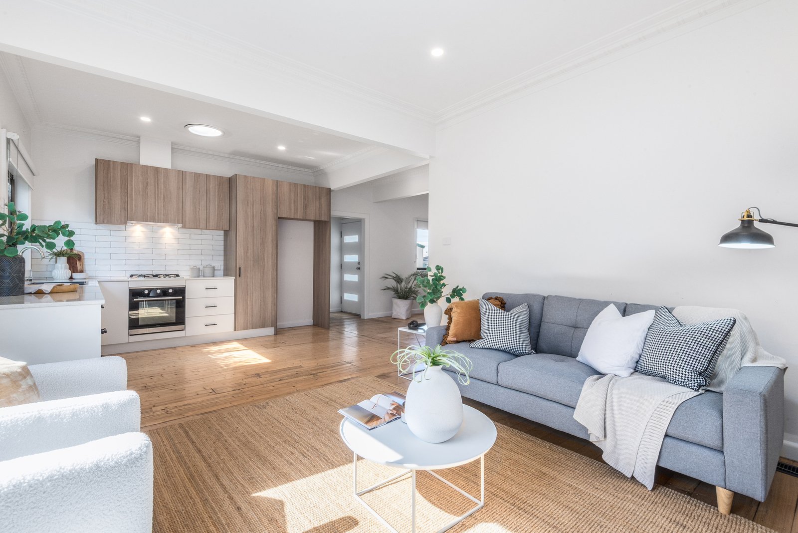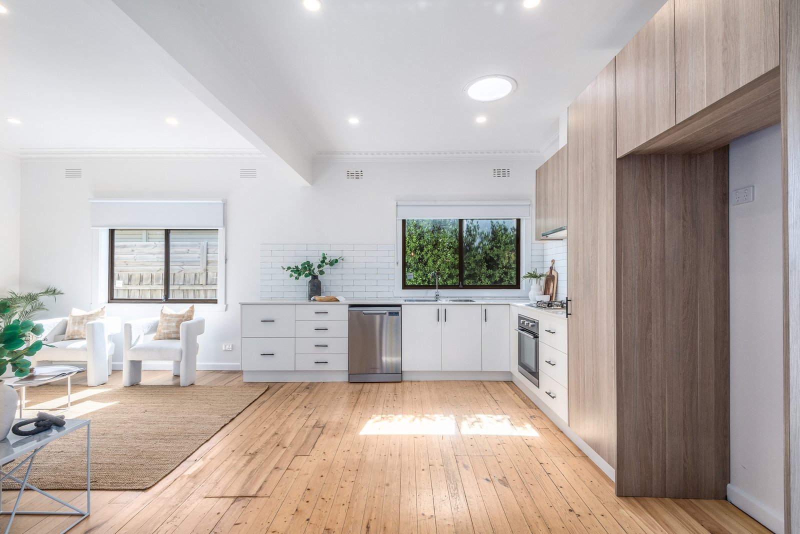 The light-filled living area enjoys a north-facing aspect with views to the backyard, seamlessly connecting to the open-plan kitchen and dining zone for effortless everyday living and easy entertaining. The sleek kitchen features modern cabinetry, quality appliances including 600mm electric oven, gas cooktop, Fisher and Paykel dishwasher, classic subway tile splashback, and generous storage provisions.