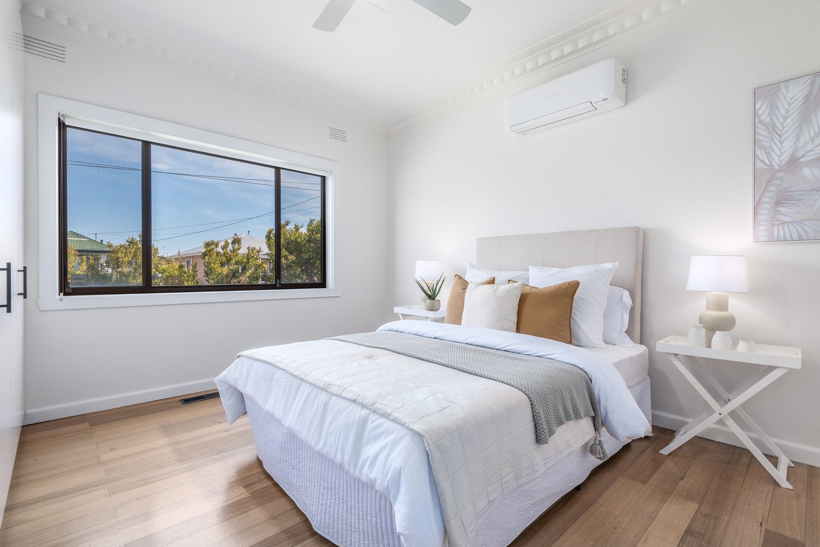 To the rear, the stylish bathroom is presented in contemporary finishes and incorporates laundry facilities, accompanied by a separate powder room for added functionality. Equipped for comfort, additional features include ducted heating throughout, two split system heating and cooling units, and ceiling fans in all bedrooms.