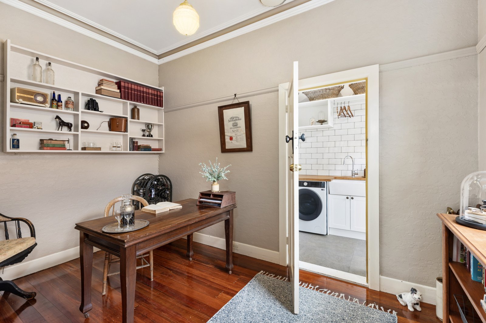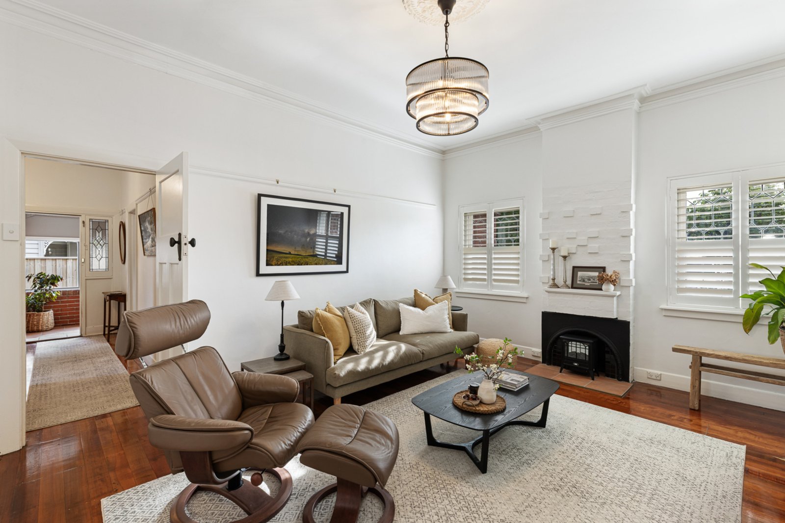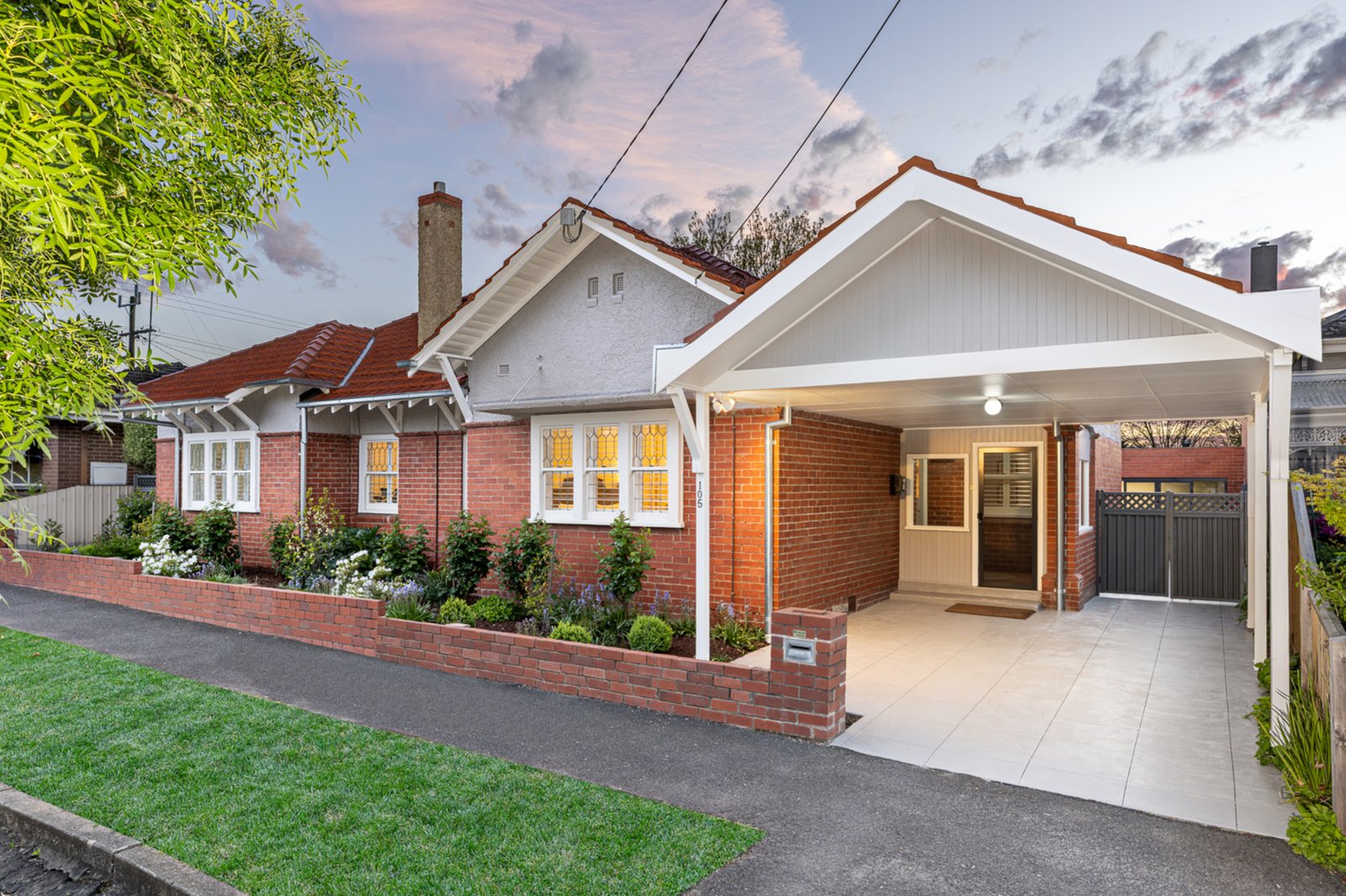 Comprising three bedrooms plus a study (or 4th), the home features two fully renovated bathrooms, a stylishly renovated laundry, and a beautifully appointed kitchen with quality appliances. Two generous living zones provide flexibility and space for the whole family. While the home retains its heritage character through timber floors, ornate cornices, and solid brick construction, thoughtful updates have introduced a fresh, contemporary feel without losing its original charm.